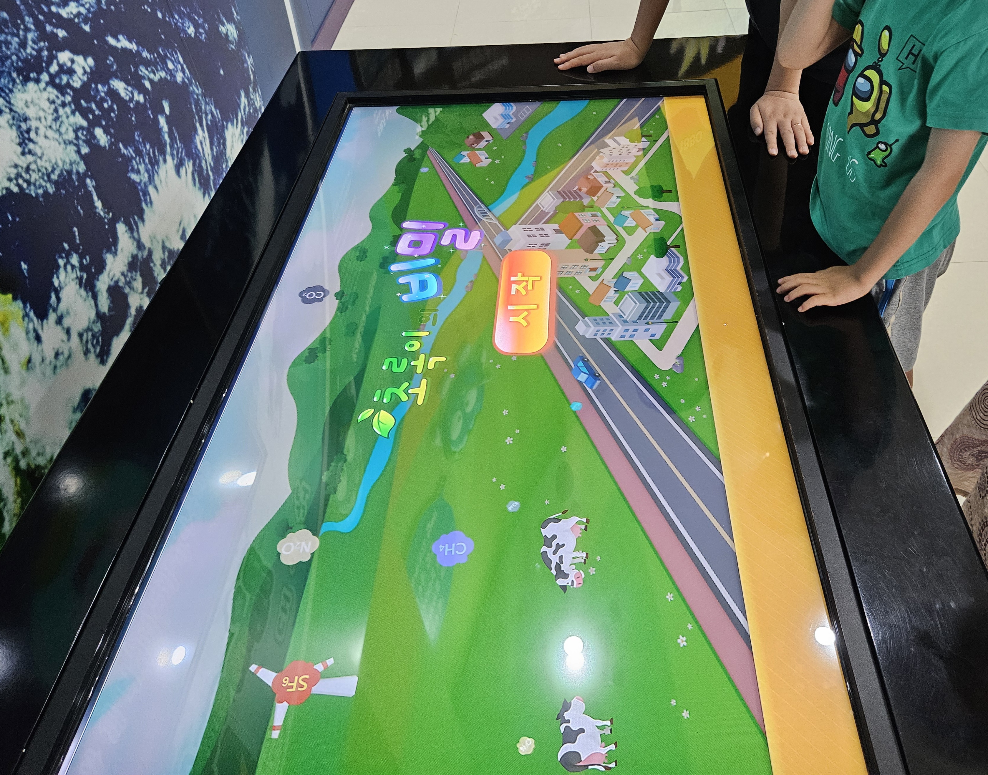 이어 초록이 비밀이라고 터치 스크린을 이용해 어떻게 하면 온난화로부터 지구를 지킬 수 있는지 체험하는 공간이었는데요. 아직 지구 온난화에 대한 개념이 없어 이것저것 누르길래 같이 설명해 주면서 체험을 해보았답니다.