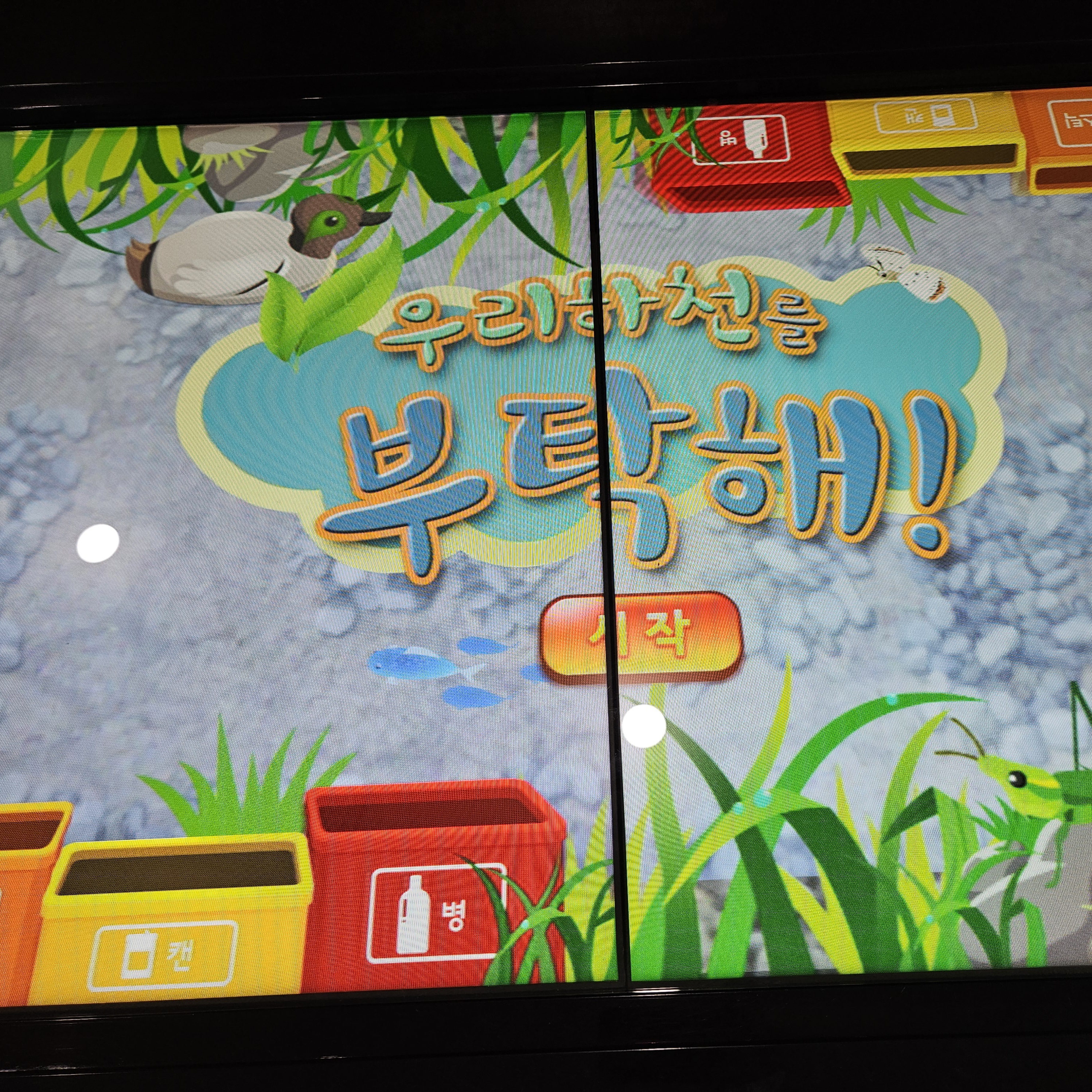 우리 하천을 부탁해! 는 큰 터치 스크린으로 되어있는 시작버튼을 누르면 하천에 병, 캔, 플라스틱 쓰레기들이 둥둥 떠다니는데요. 그럼 앞에 있는 쓰레기통에 병은 병대로 버려주고, 캔은 캔대로 버려주는 게임이었습니다. 어린이집에서 한번 해보았다고 곧 잘하더라고요.