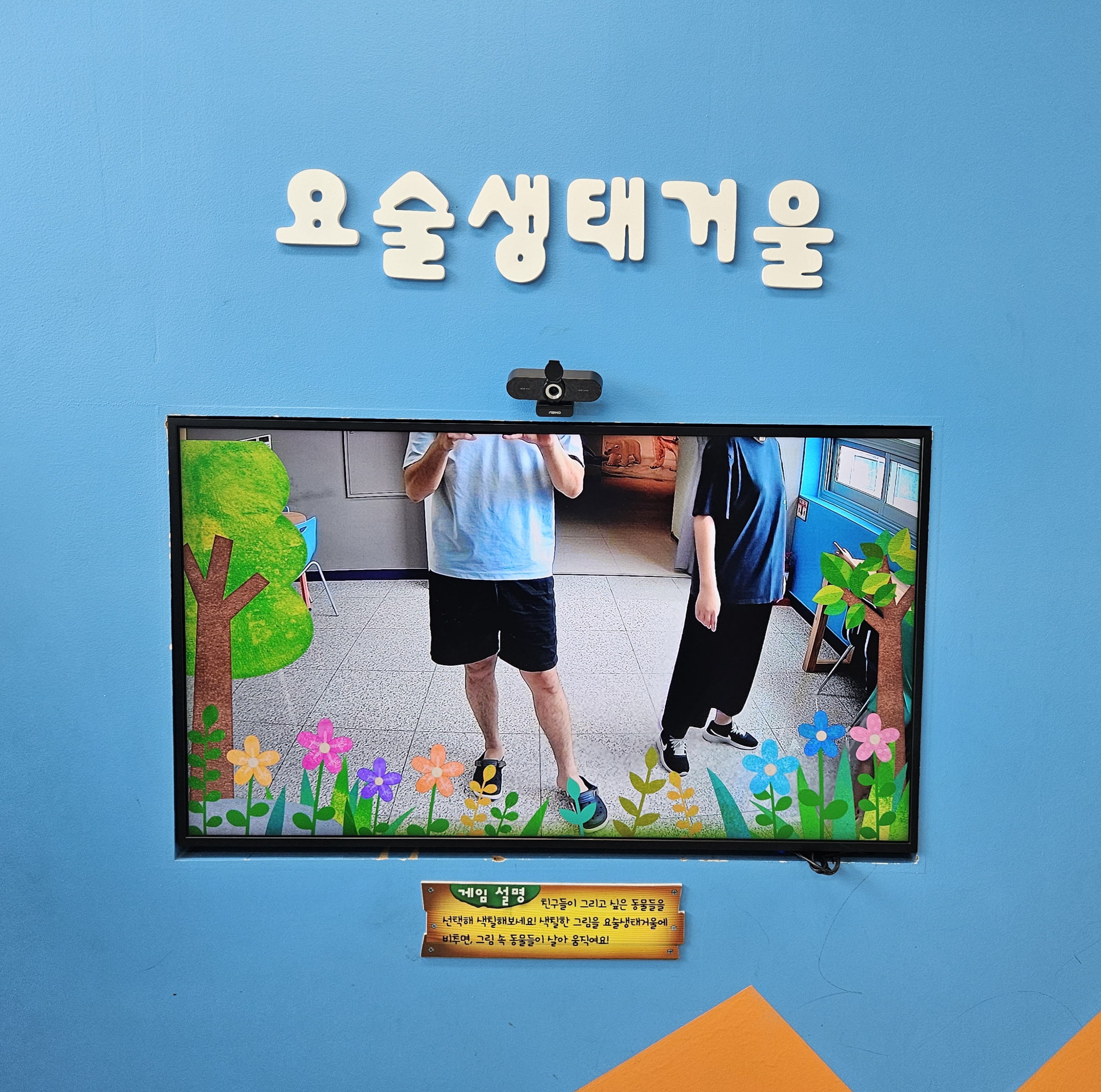 포토사진을 찍은 후 요술생태거울이라고 해서 근처 준비되어 있는 종이에 색칠을 하고 카메라에 비치면 살아 움직이는 체험 및 기후변화 영상관도 있었지만 아들이 1층에 비해 2층은 관심을 갖지 않아 바로 내려갔답니다.
