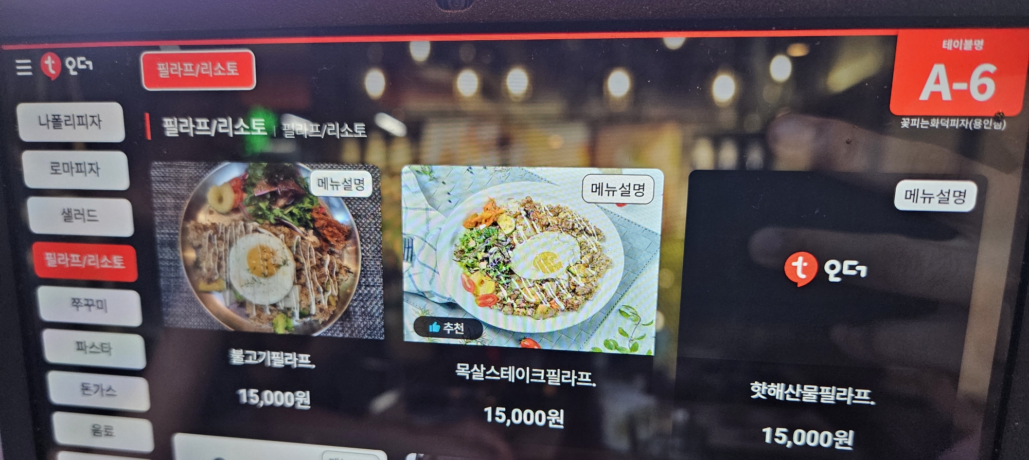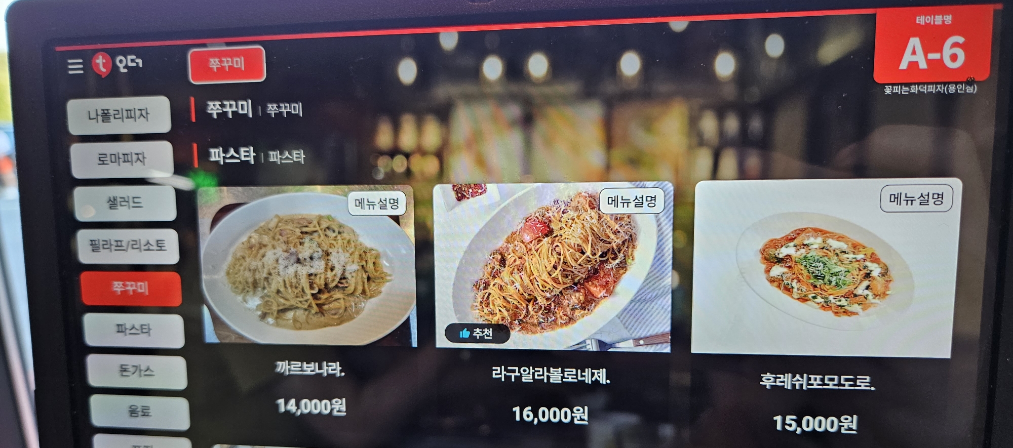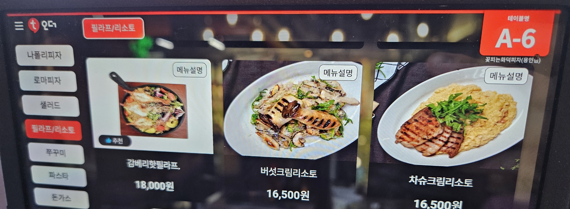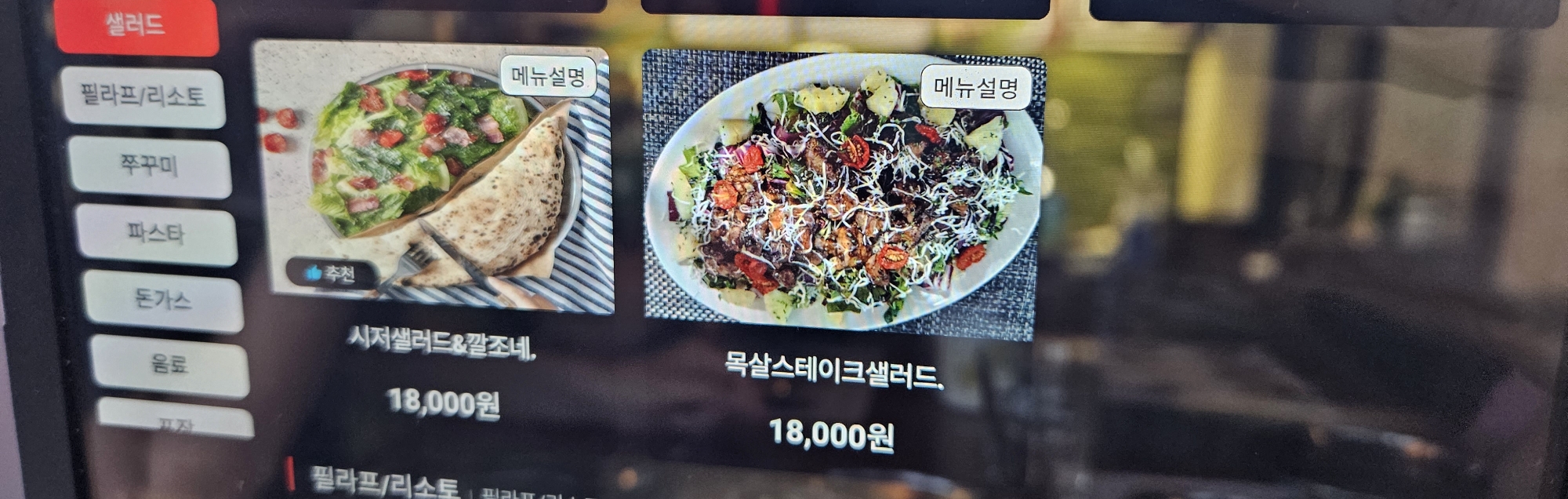 메뉴판은 별도로 없고 테이블에 있는 키오스크를 이용해 메뉴선택 및 결제까지 진행을 하는 식당이더라고요. 그래서 가격이랑 메뉴를 쭉 사진 찍어 보았습니다.