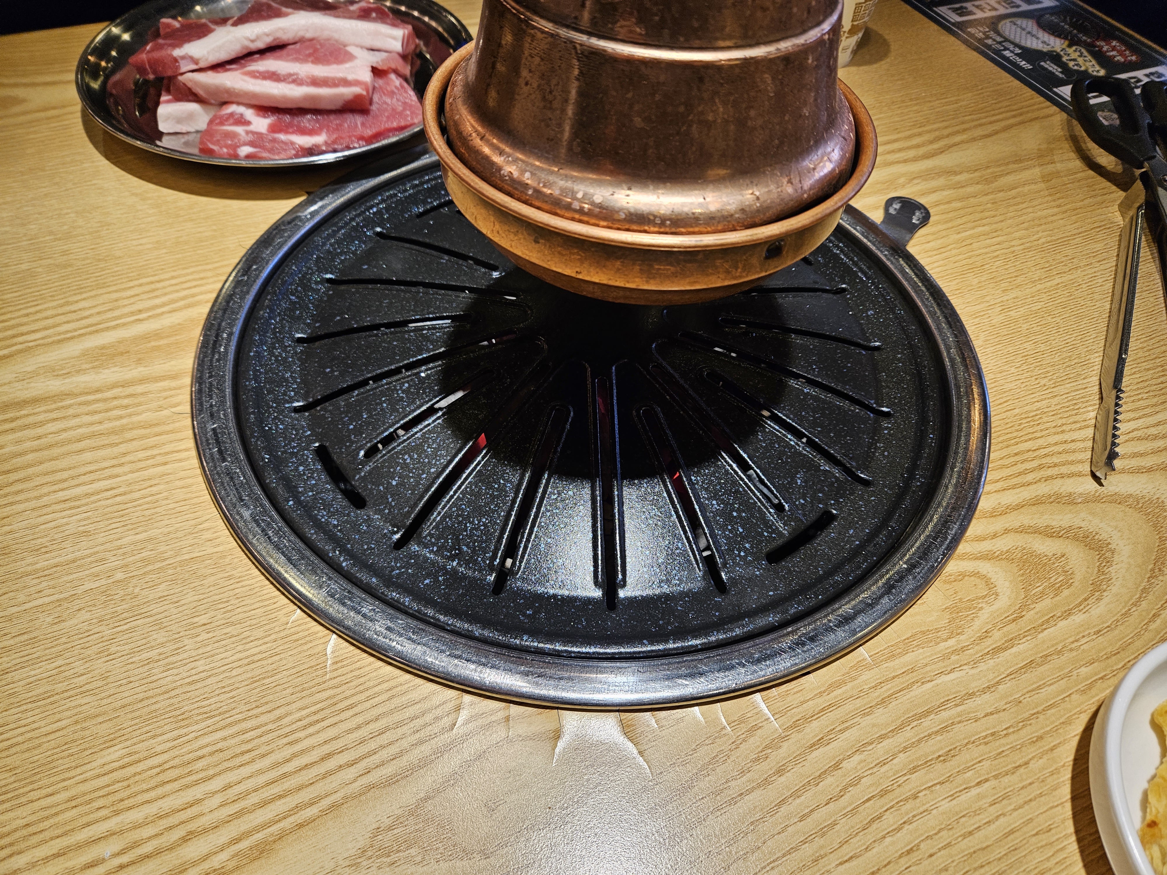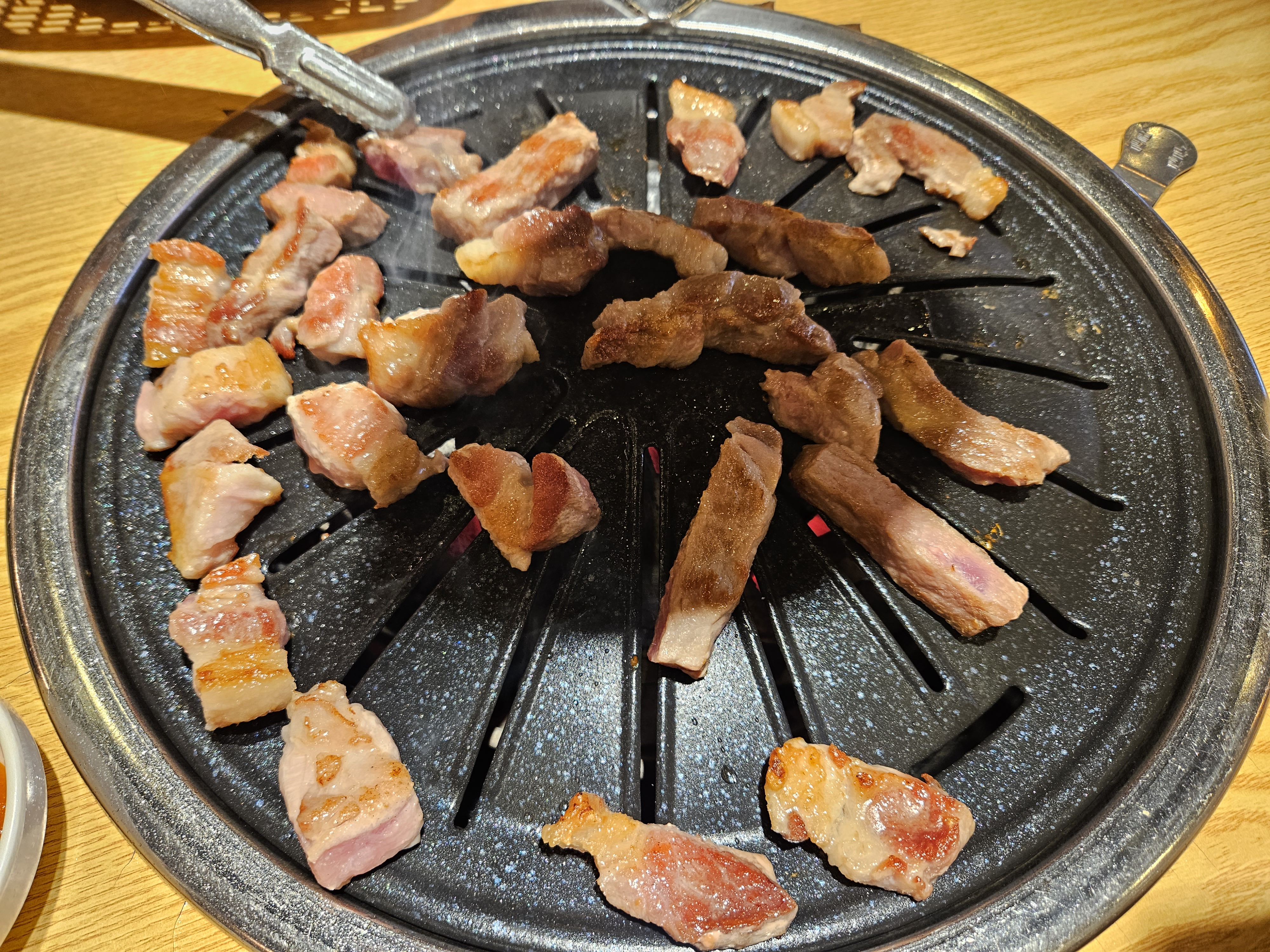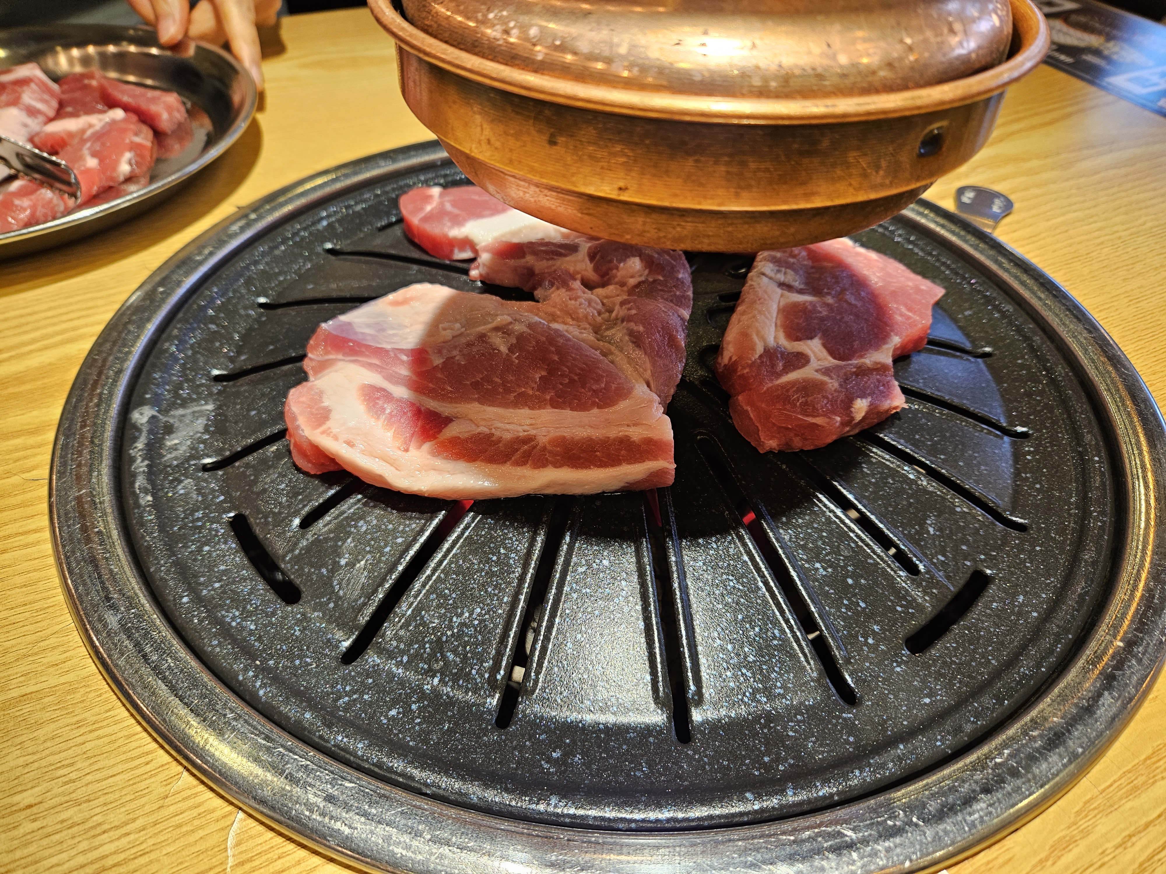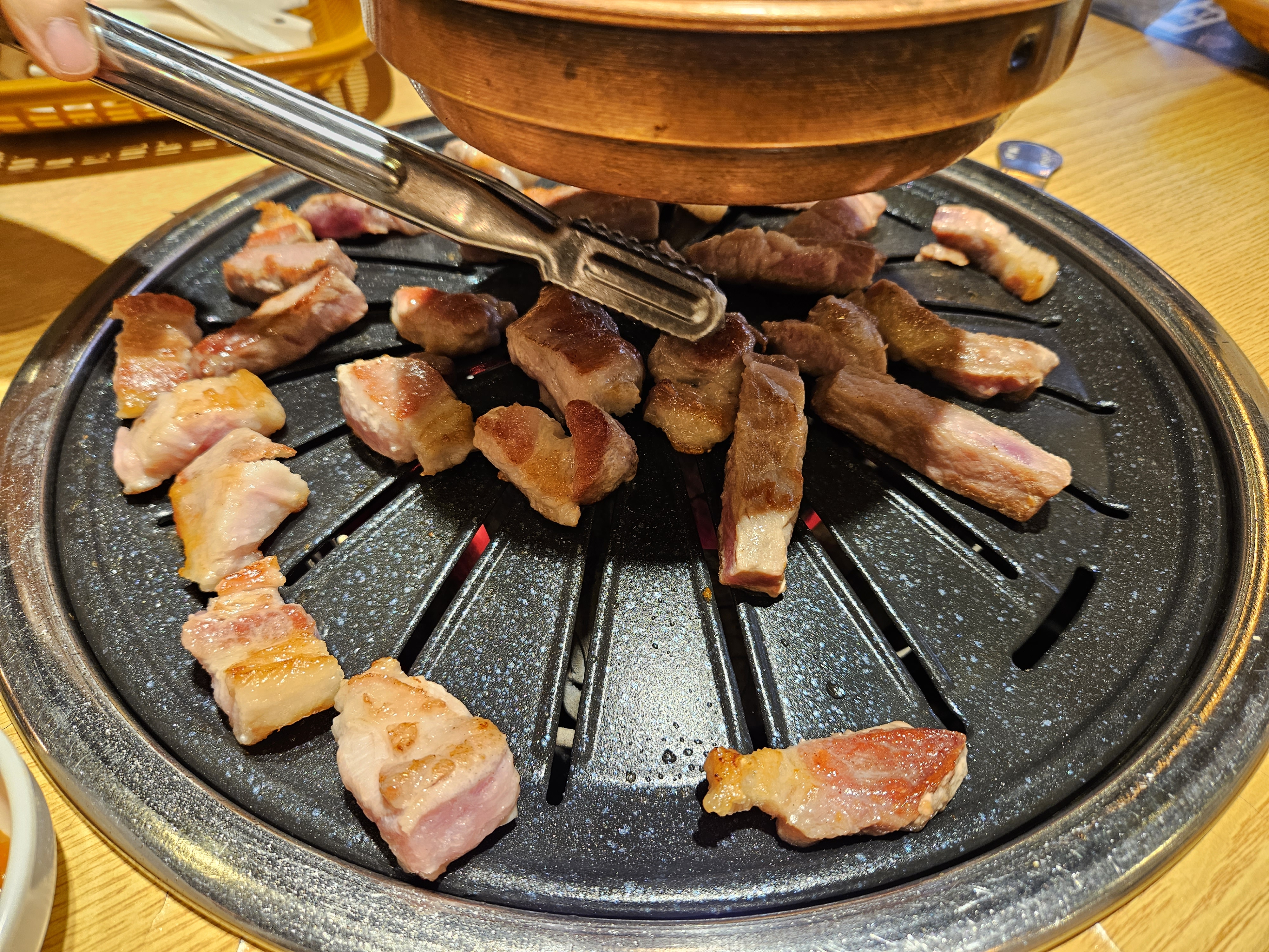 자 이제 본격적으로 불판을 충분히 데운 뒤 주먹고기를 올렸는데요.