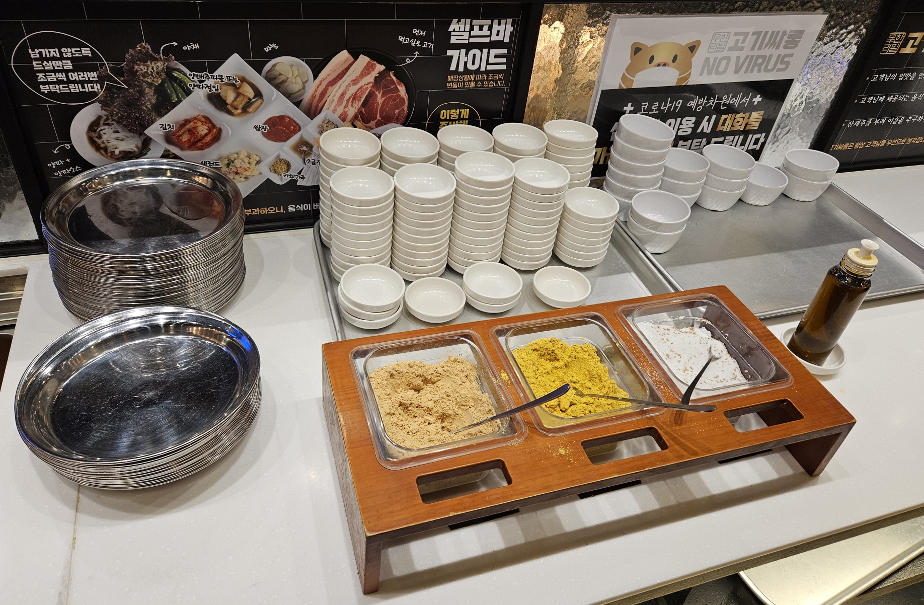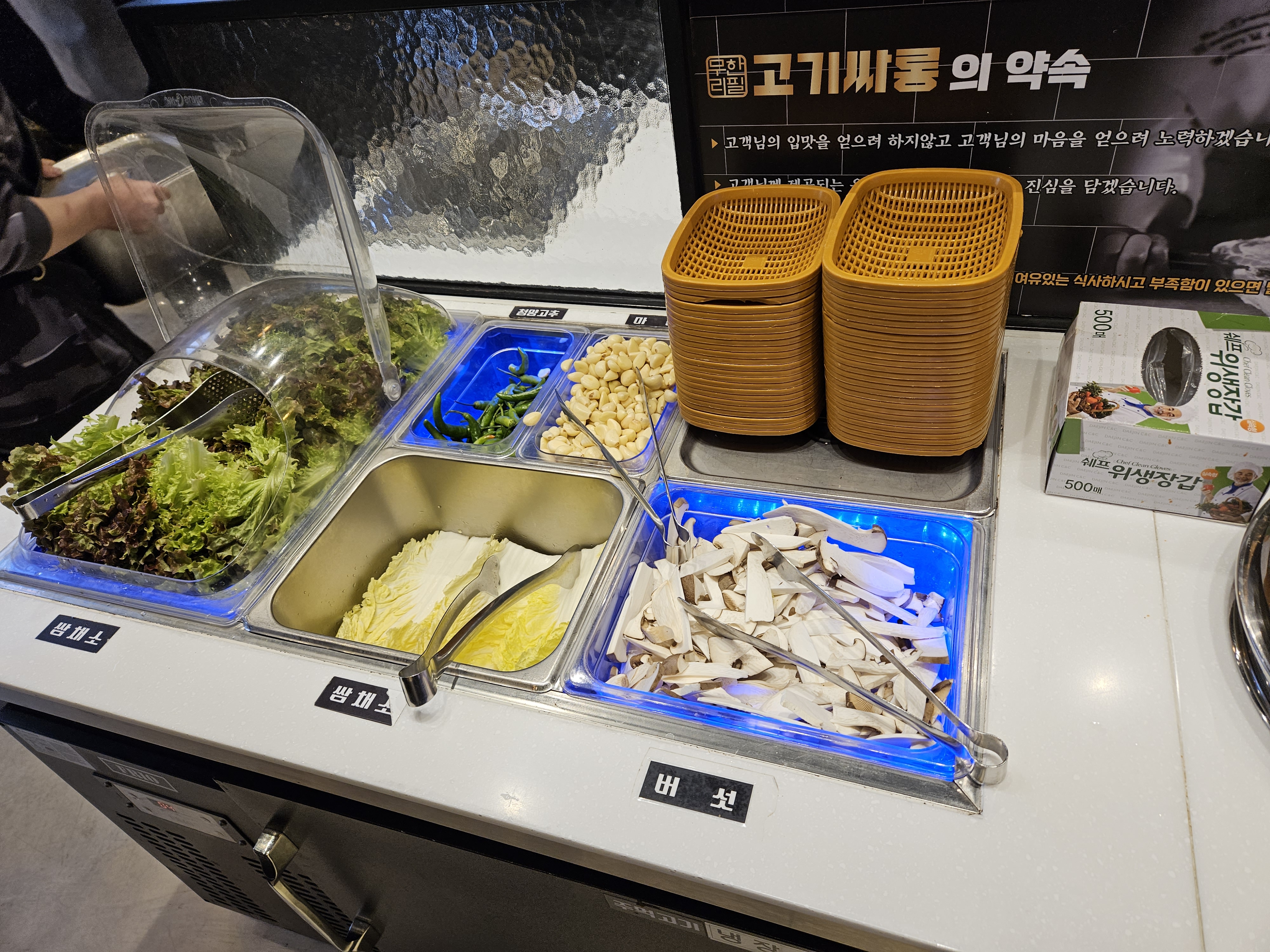 그 외 쌈종류 및 다양한 반찬 또한 먹고 싶은 만큼 가져가서 먹을 수도 있고 그 외 파채, 양파, 쌈장 등등도 마음껏 먹을 수 있습니다.