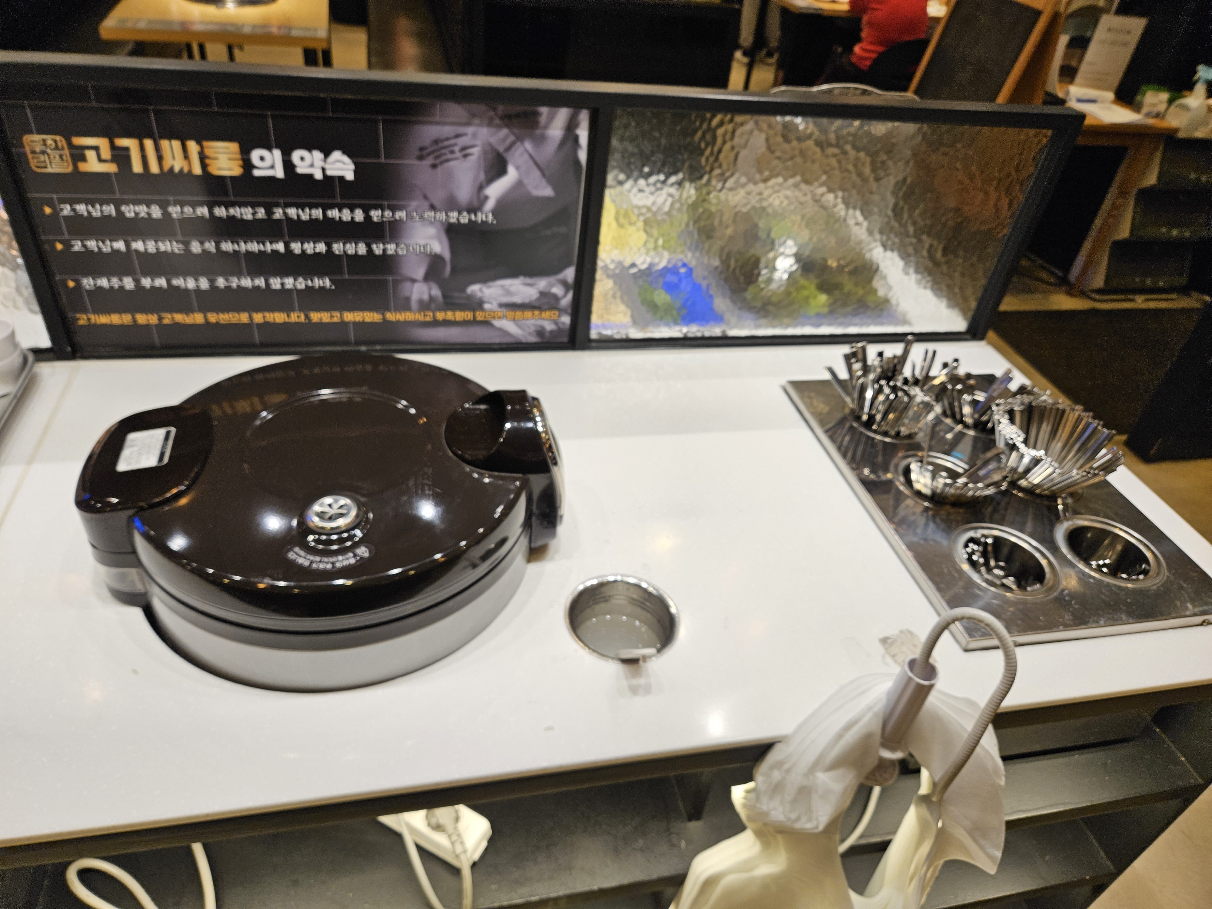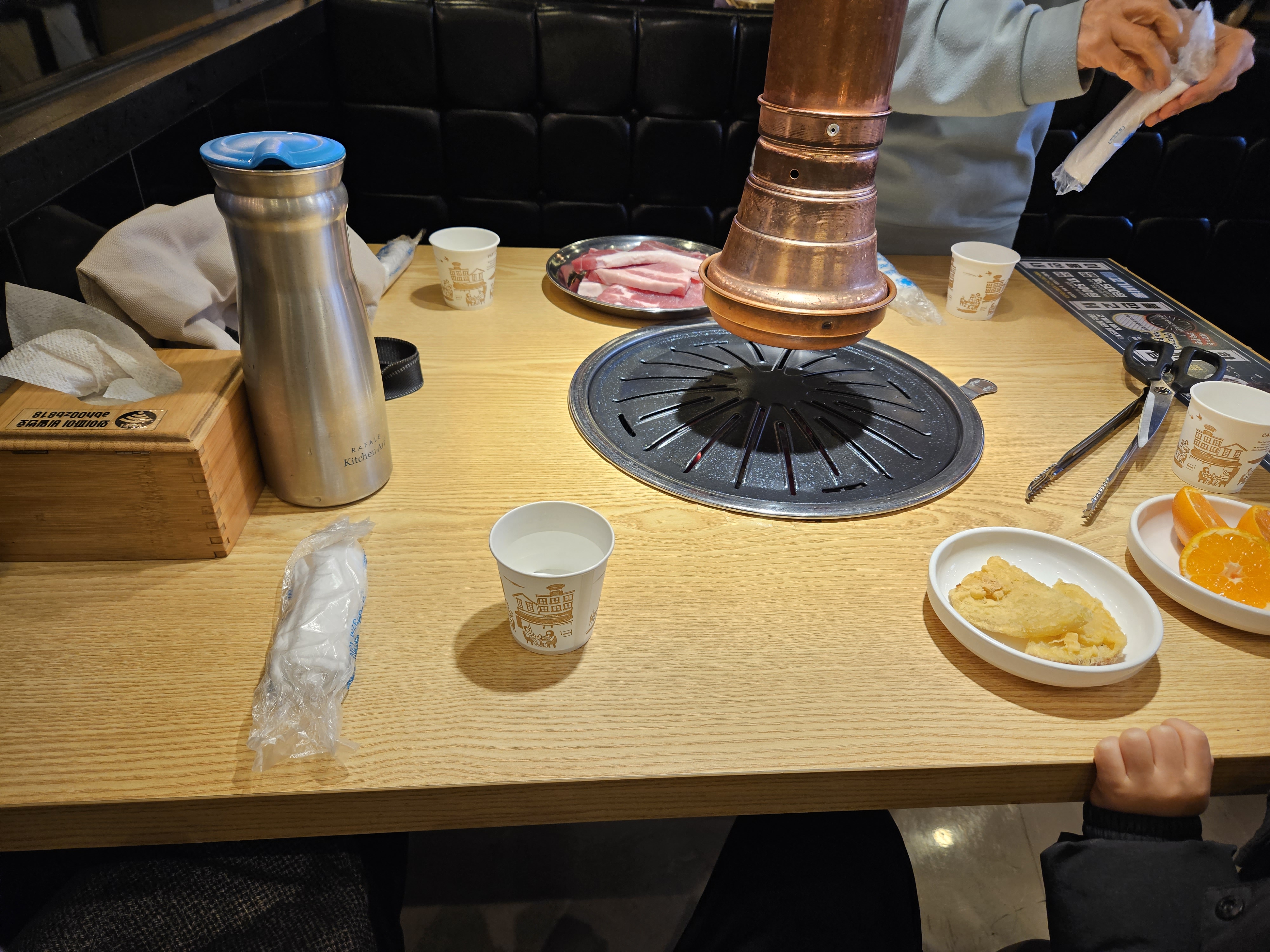 저희 가족은 와이프님께서 33개월 된 아들한테는 양념된 고기를 먹이고 싶지 않다고 해 주먹고기를 위주로 먹는데요. 기본적인 세팅은 물이랑 물티슈 그리고 불을 넣어주고 집게 가위까지만 준비해 줍니다. 나머지는 수저 젓가락 등등은 다 셀프입니다. 만약 집게나 가위가 더 필요하다면 직원분한테 말하면 추가로 줍니다.