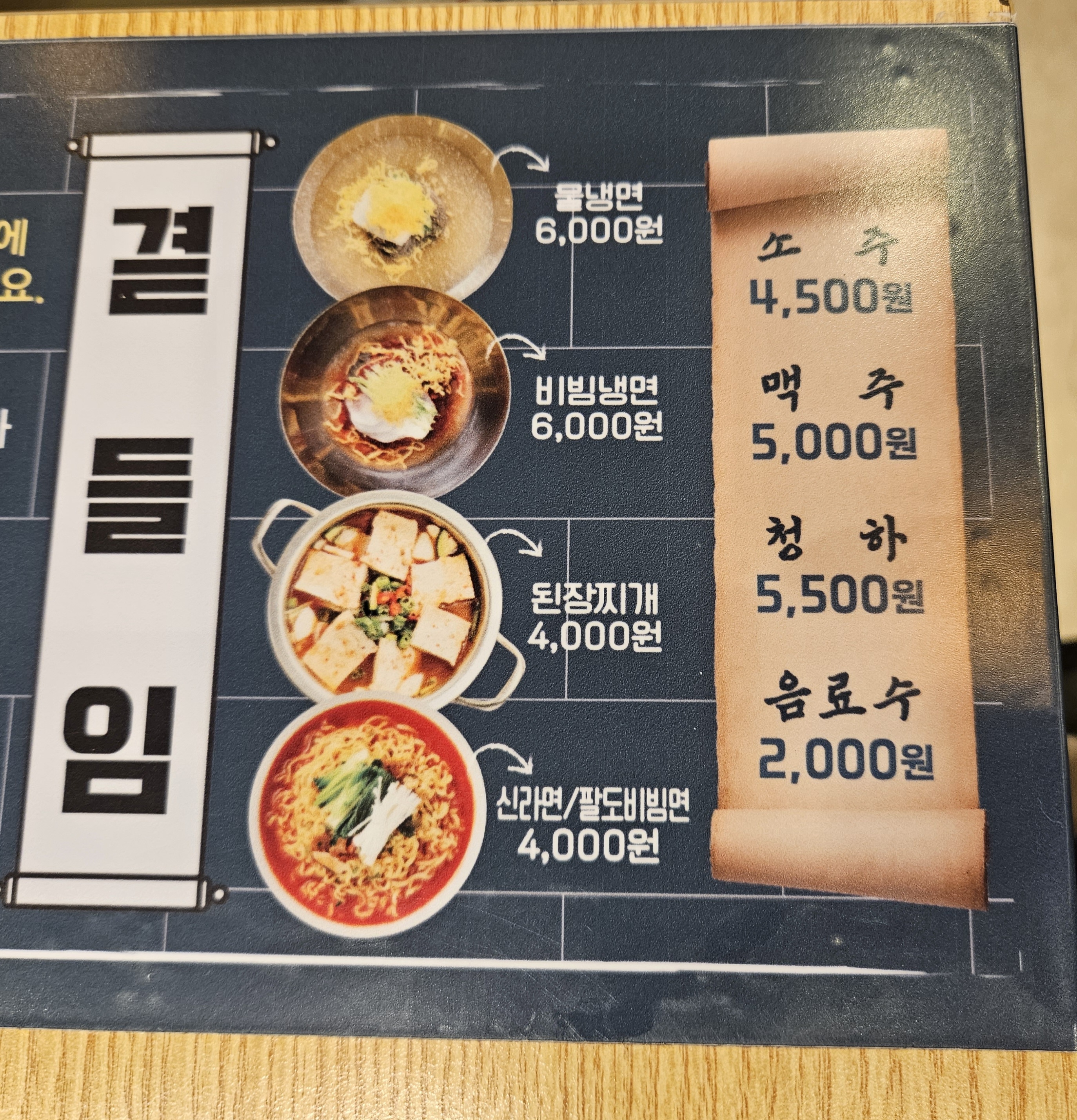 그 외 별미로 물냉면, 비빔냉면, 된장찌개, 신라면/팔도비빔면도 판매를 하고 있는데요. 소문 듣고 몇 번 와서 별미음식도 먹어본 적 있는데 개인적으로 물냉, 비냉은 먹을만하고 된장찌개는 생각보다 맛있었습니다. 그리고 신라면은 안 먹어봤지만 팔도비빔면은 그림처럼 안 나오니 그냥 비빔냉면 드시는 걸 추천드립니다.