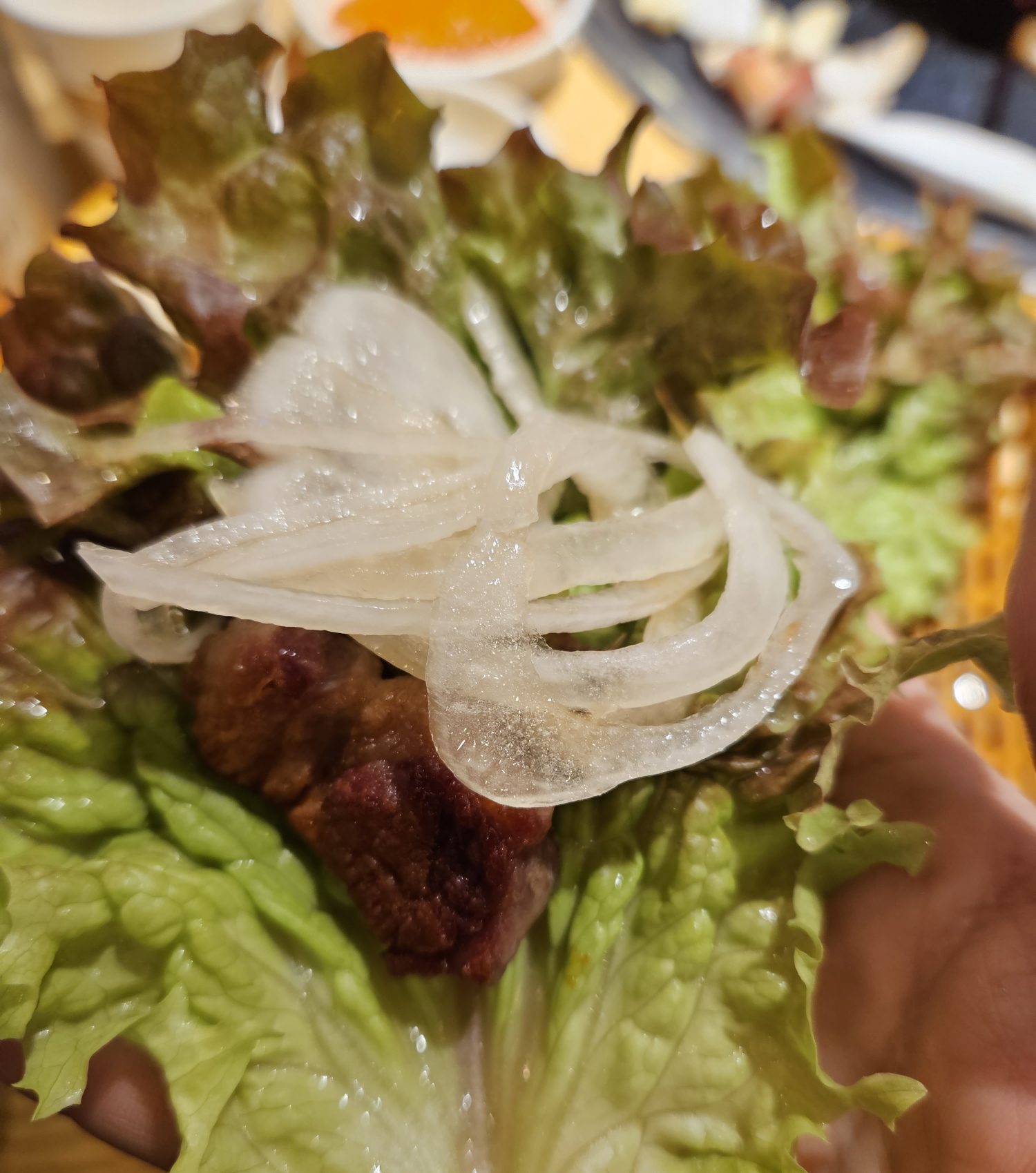 다 익은 고기, 양파 그리고 마늘, 버섯을 쌈에 올려서 한번 먹어도 보고