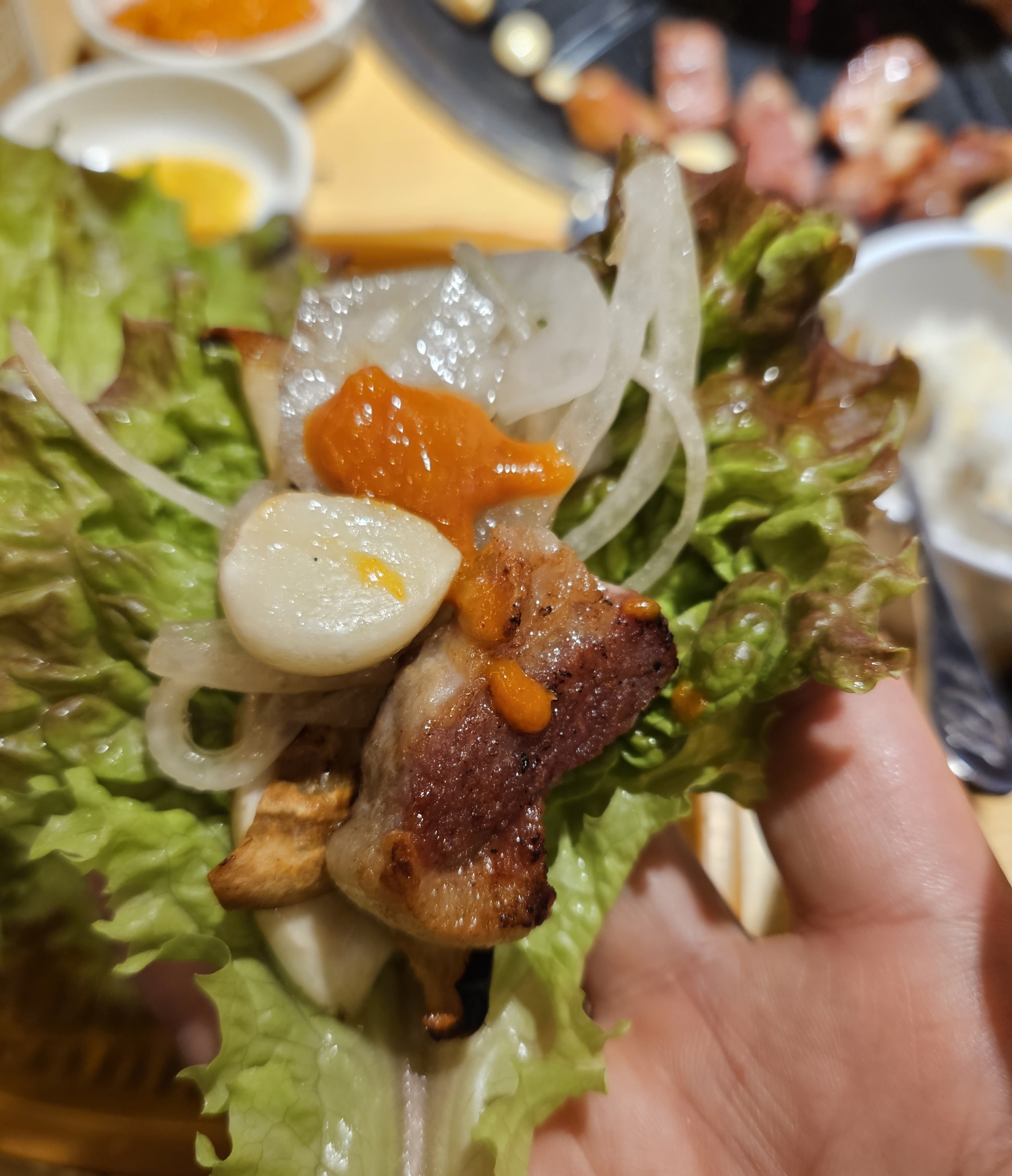 쌈 위에 다 익은 고기와 파채도 올려서 먹어도 보고 저는 고기 먹을 때 밥보다는 항상 고기에 쌈 싸서 먹는 걸 좋아하는데요. 이렇게 평범하게 쌈 올려서 먹어도 정말 고기가 맛있습니다.