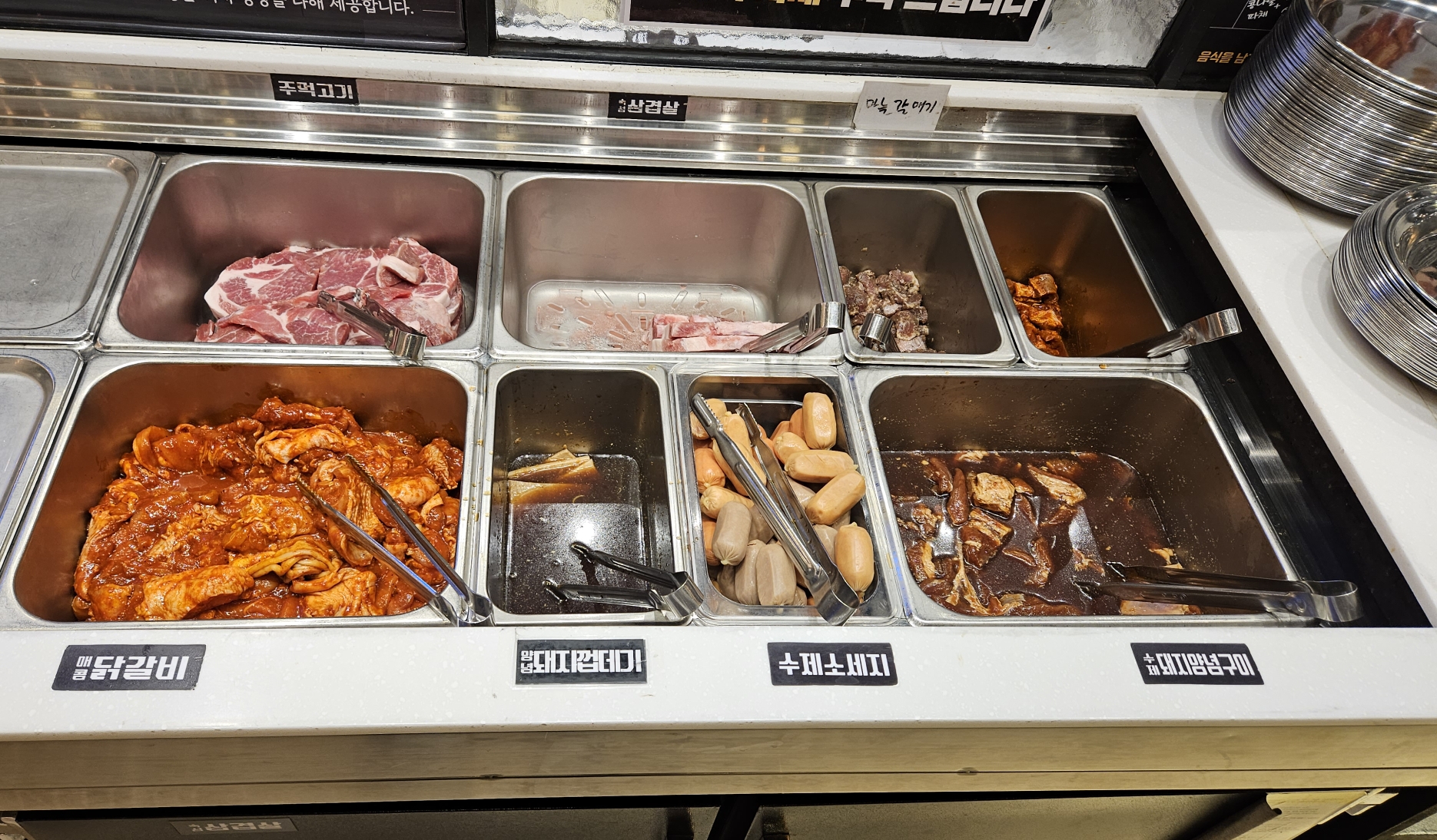 돼지고기 종류도 생각보다 다양한데요. 생고기는 주먹고기, 삼겹살이 있고 양념고기는 매콤닭갈비, 양념돼지껍질, 갈매기살, 돼지양념구이가 있습니다. 만약 양념되어 있는 고기를 먹을 때는 꼭 직원한테 말한 뒤 불판을 바꿔서 이용해야 한다고 하네요. 그리고 무한리필집인 만큼 먹고 싶은 대로 먹으면 됩니다.