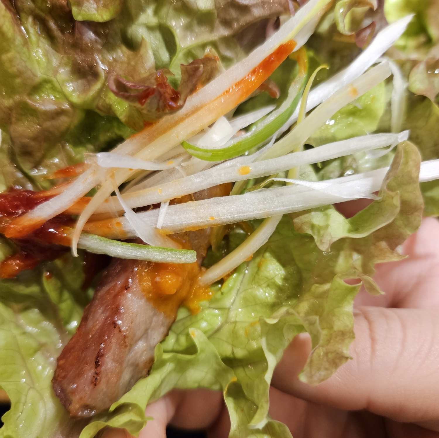 쌈 위에 다 익은 고기와 파채도 올려서 먹어도 보고 저는 고기 먹을 때 밥보다는 항상 고기에 쌈 싸서 먹는 걸 좋아하는데요. 이렇게 평범하게 쌈 올려서 먹어도 정말 고기가 맛있습니다.