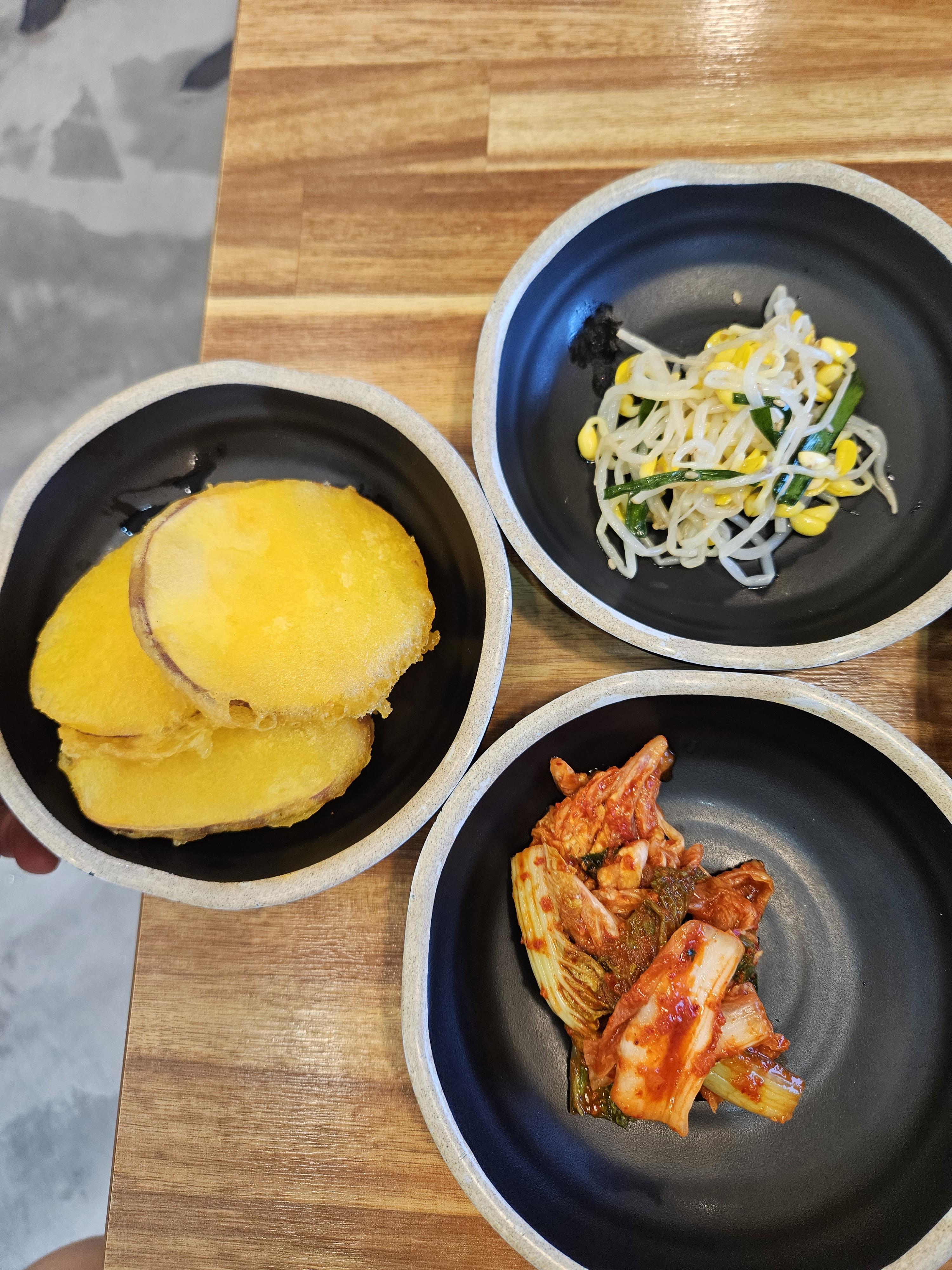 암튼 족발이랑 추어탕을 시키니깐 반찬으로 나온 게 무말랭이, 양파짱아찌, 배추김치, 콩나물 그리고 633추어탕&김이네행복한족발집 시그니처 고구마튀김이 나오는데요. 반찬들은 역시 두말할 필요 없이 정말 맛있었습니다.