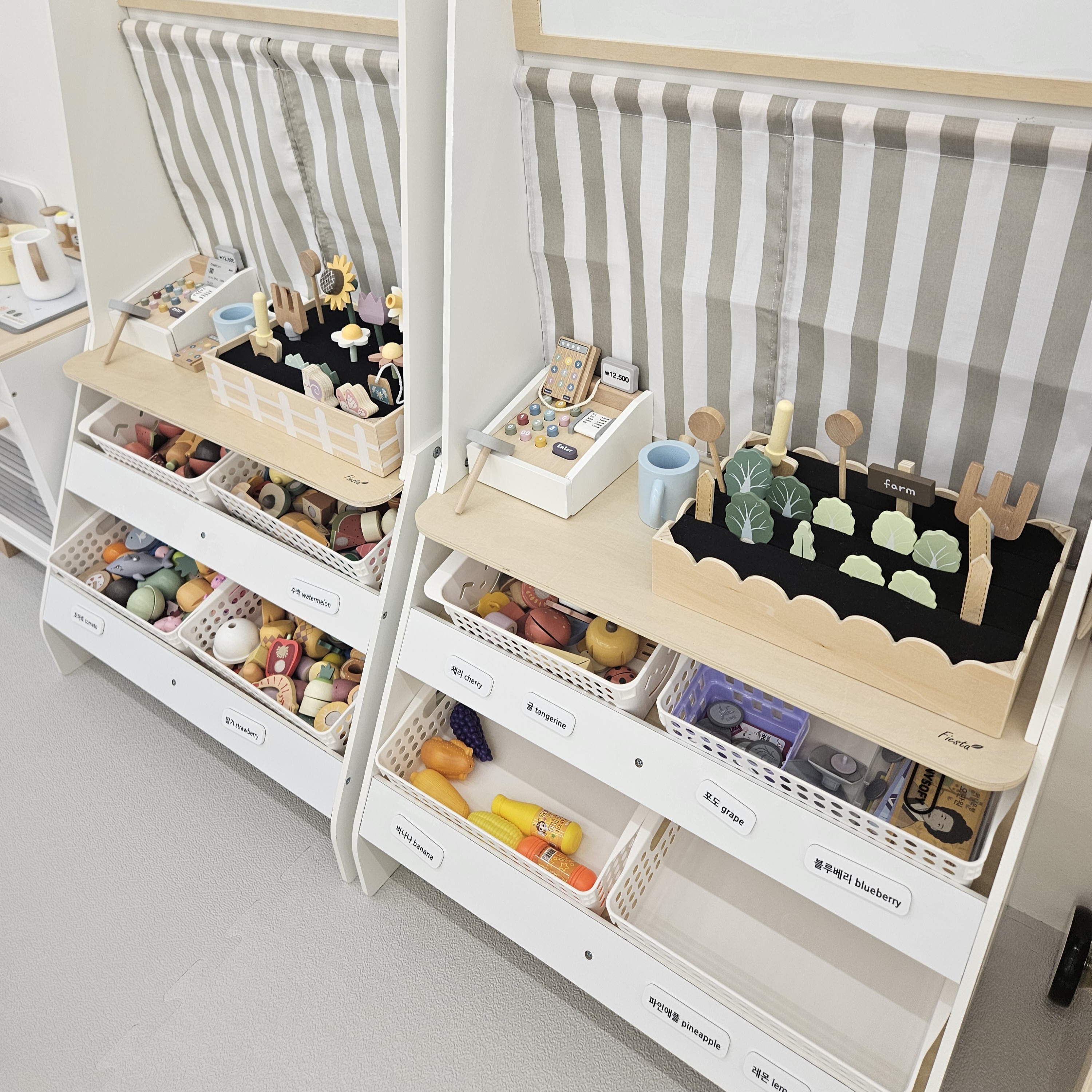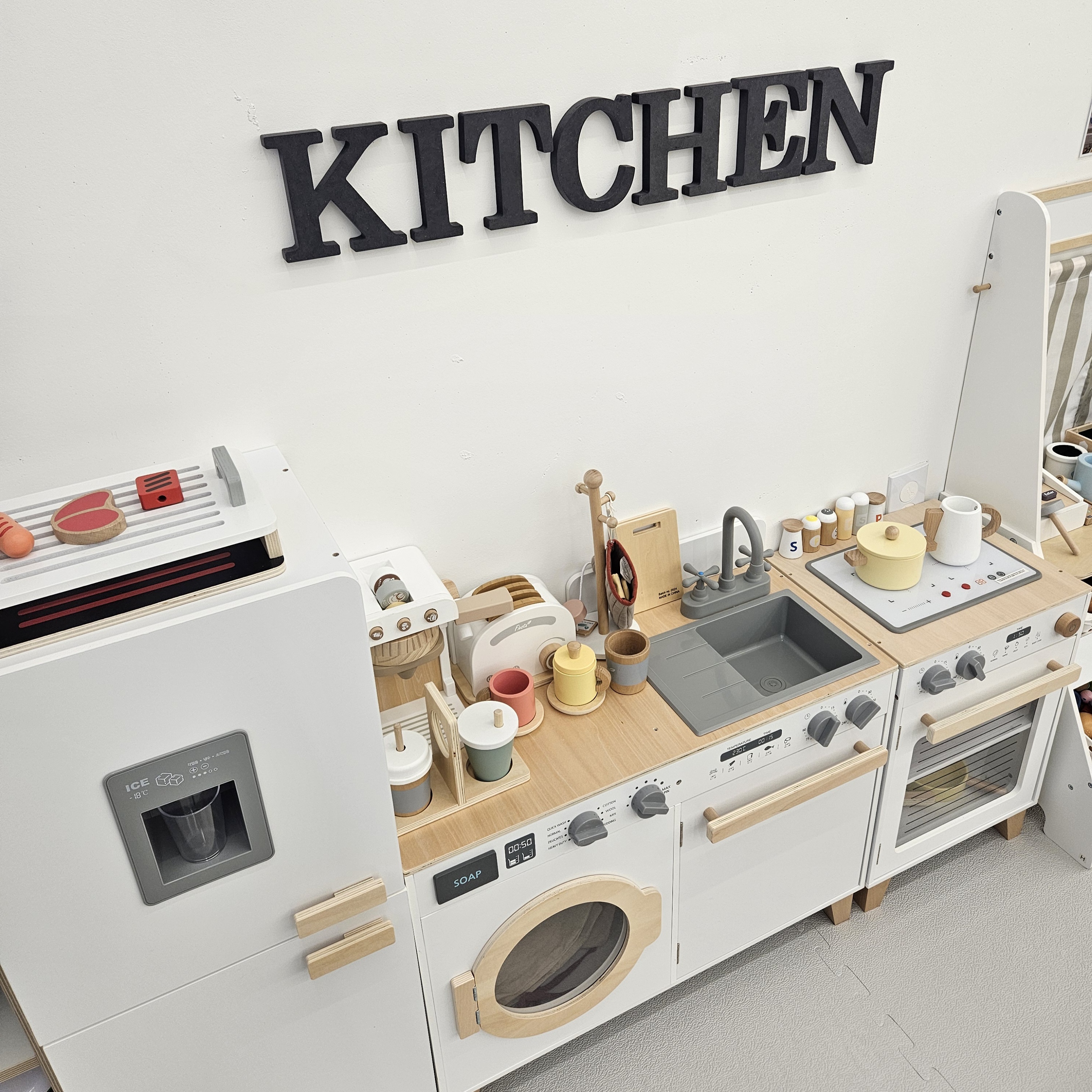 키즈카페이면서 파티룸처럼 사용할 수 있기 때문에 다양한 생일잔치 용품들도 많았고 손 씻기 및 간단한 설거지도 할 수 있게 싱크대까지 있더라고요.