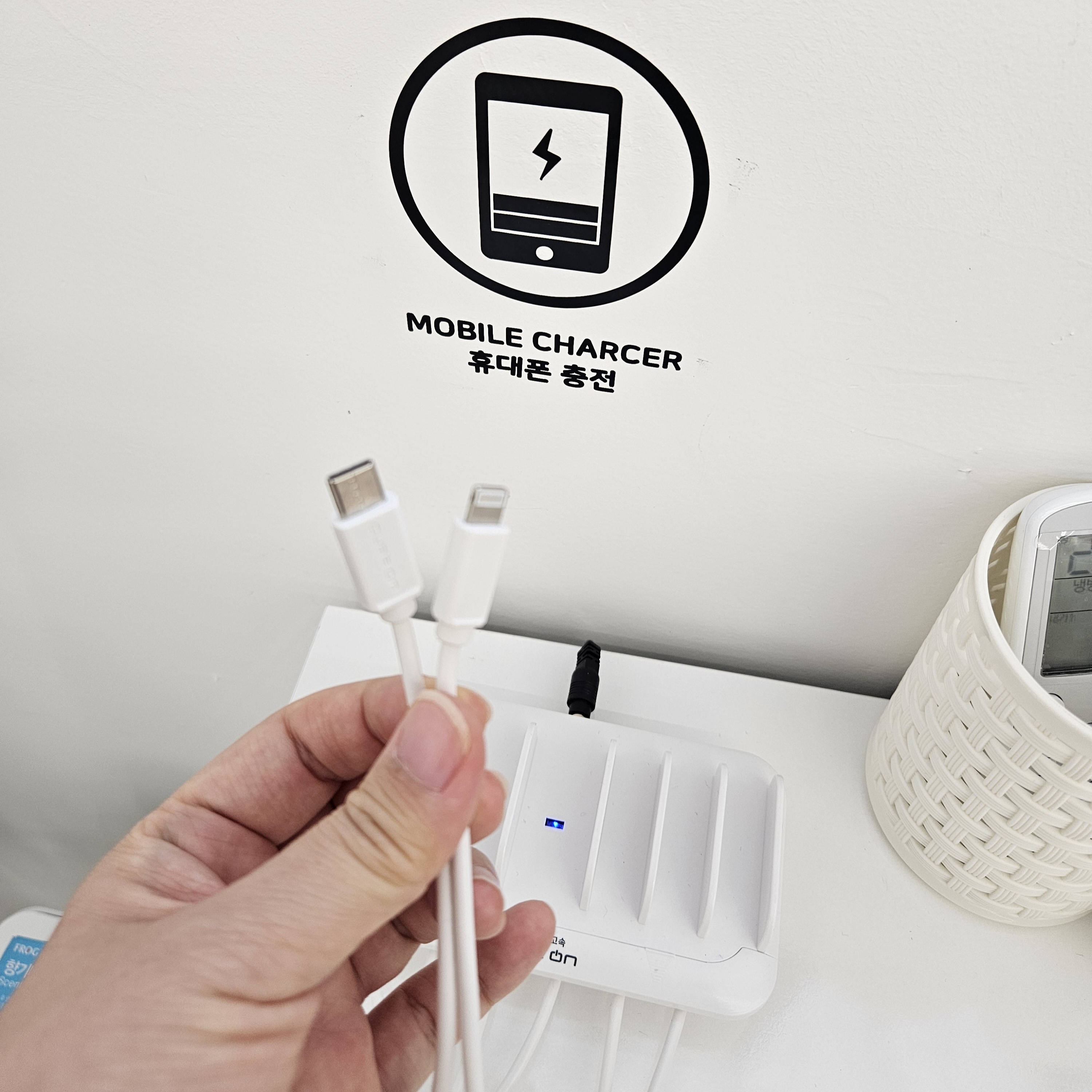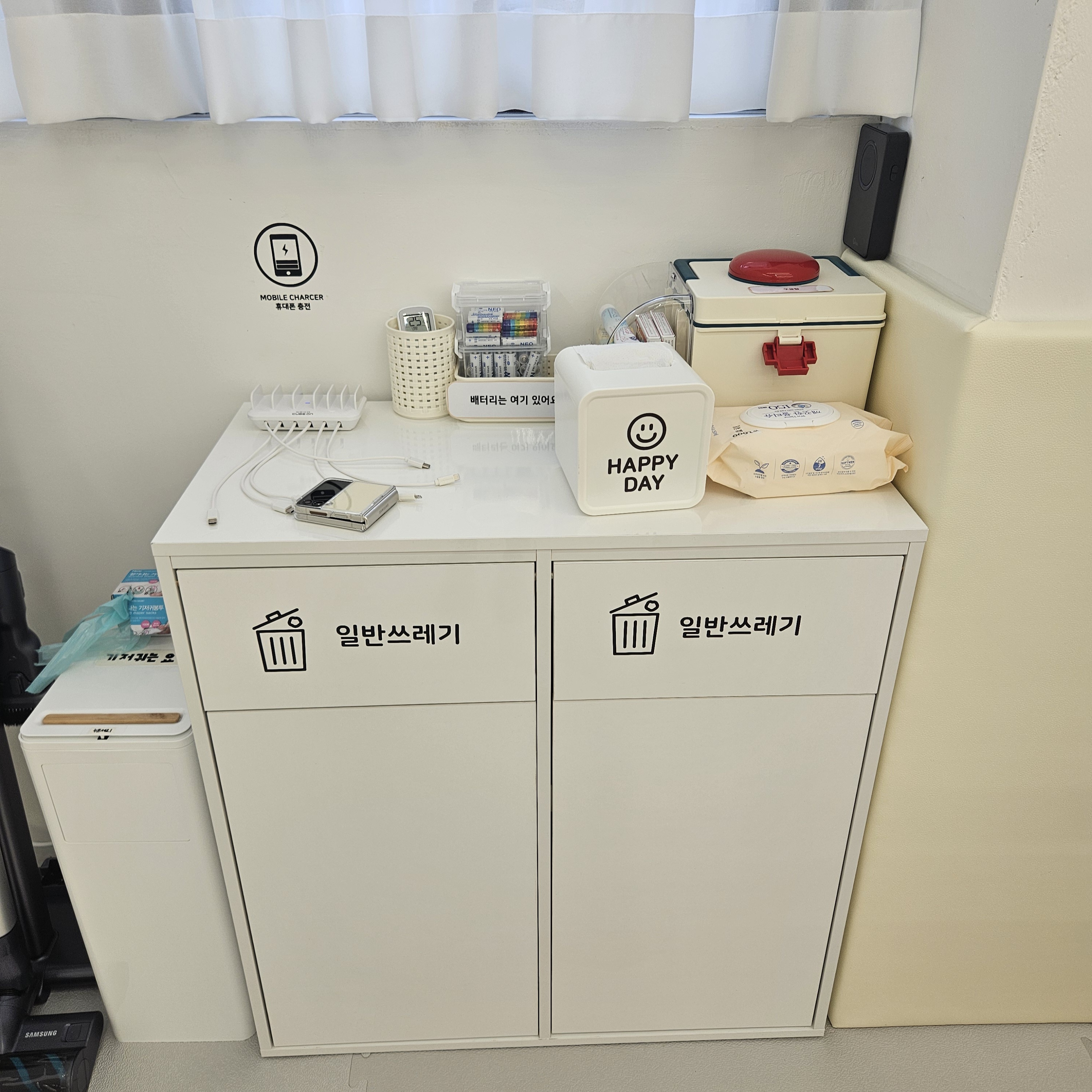 그 외 놀다가 과자부스러기를 흘리거나 청소해야 할 일이 생기면 필요한 청소기도 있고 핸드폰 충전기, 구급함도 있고