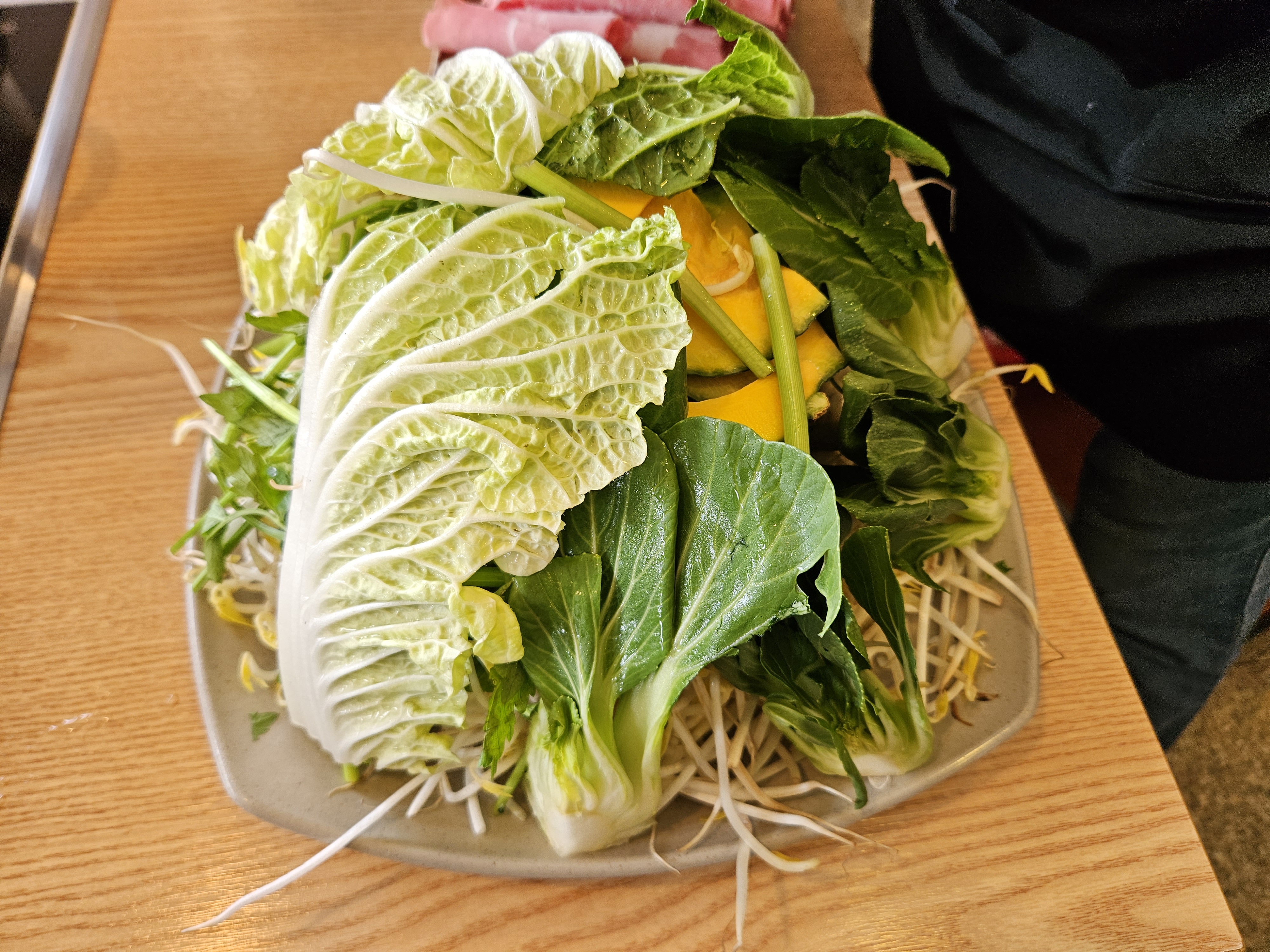 우선 소고기샤브칼국수 3인분 및 찐만두를 시켰습니다. 그럼 다들 아시다시피 육수랑 함께 각종 야채가 나오고