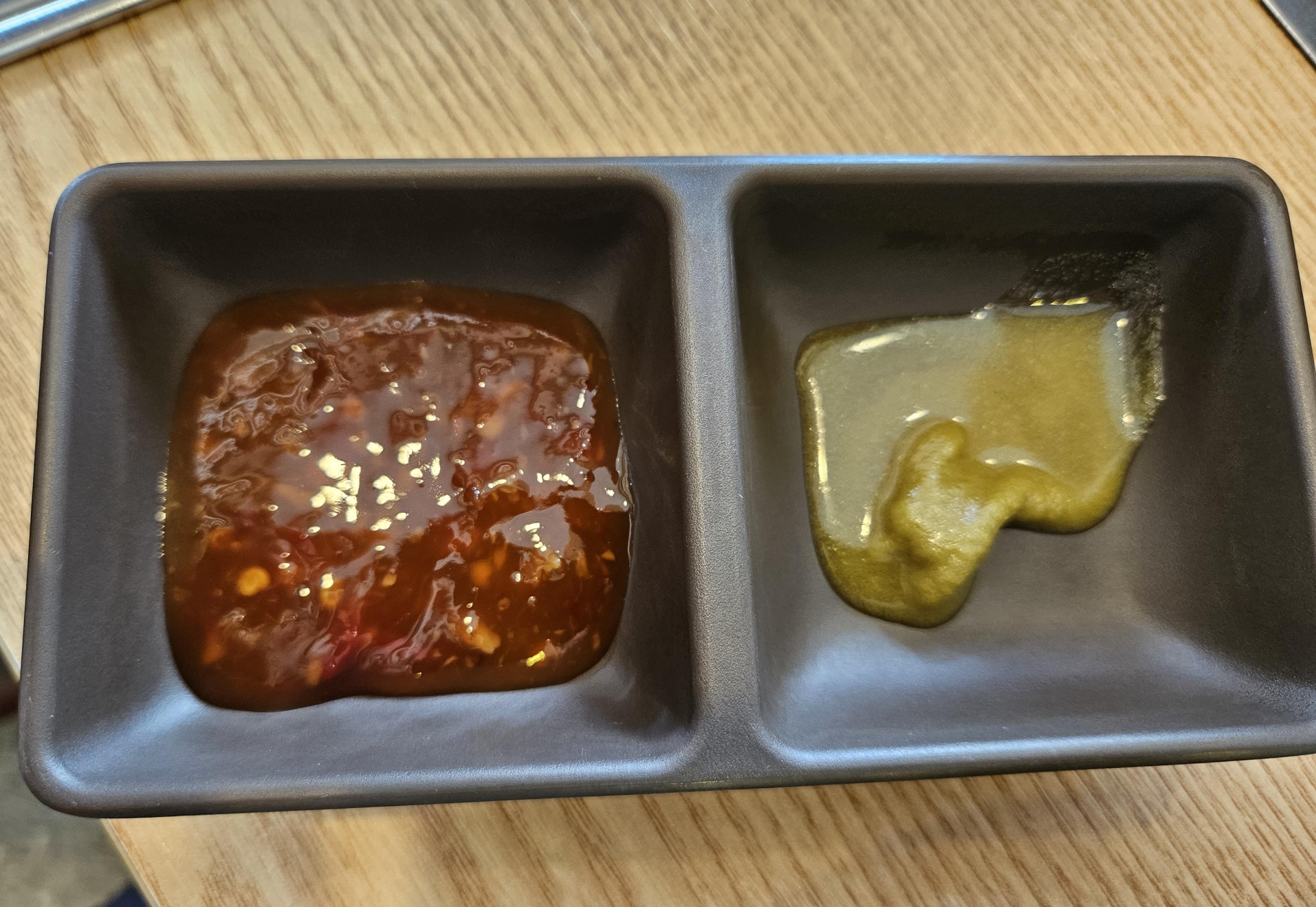 마지막으로 죽해서 먹을 재료가 나오는데요. 본격적으로 음식을 먹어보기 위해 테이블 옆에 있는 칠리소스를 뿌려놓고 육수가 끓여지길 기다렸습니다.