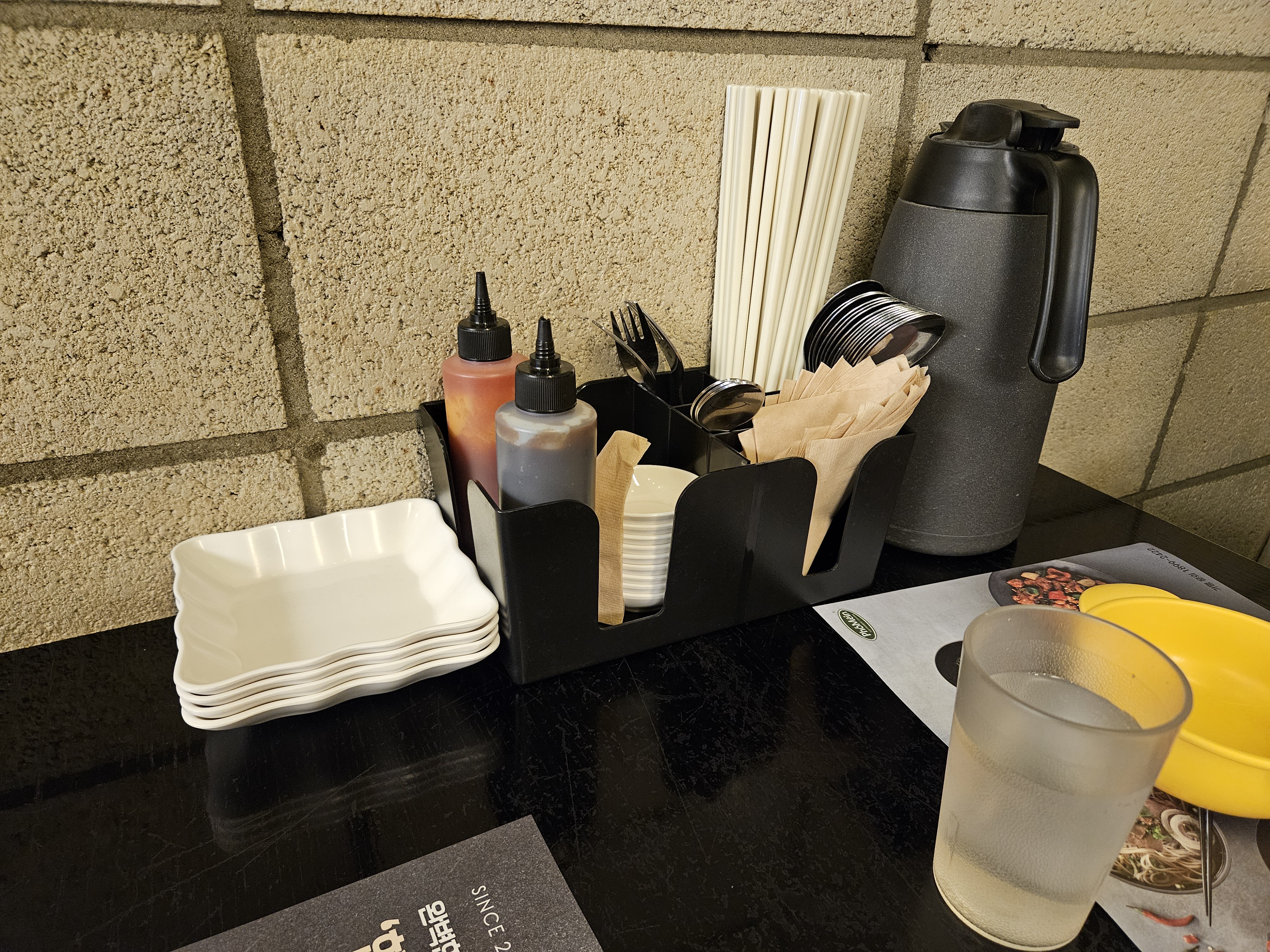 창가 쪽에 앉고 싶었지만 자리가 없어 그냥 아무 데나 앉았는데요. 테이블에는 각종 소스와 앞접시, 수저(어린이용 포함) 등등 웬만한 건 다 준비되어 있었고 아기접시는 따로 챙겨주셨습니다.