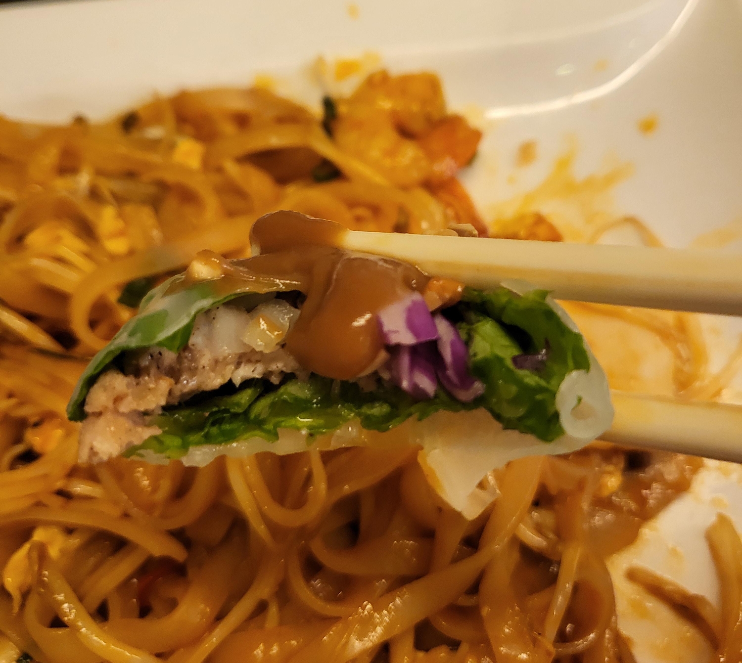 두 번째 스프링롤을 먹어보았는데요. 월남쌈처럼 생긴 거에 각종 야채와 고기 소면이 들어있더라고요. 그냥 먹어보니 차가운 월남쌈 느낌이었고 소스 또한 찍어먹어도 보았지만 월남쌈 느낌이 확 들더라 고요. 개인적으로 쌈 사 먹는 걸 좋아하는데 정말 맛있었습니다.