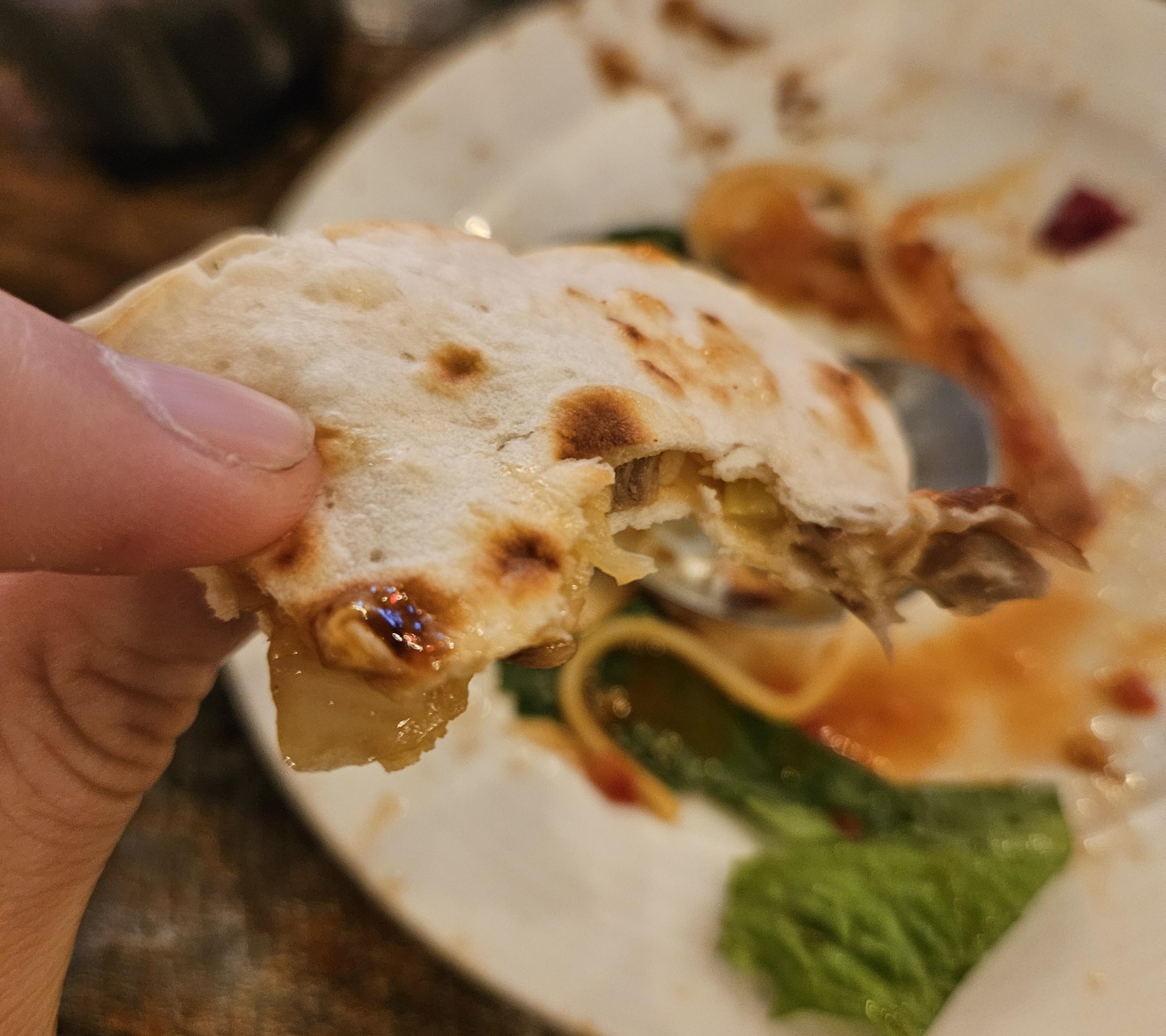퀘사디아라는 음식을 먹어본 기억은 안 나지만 피자처럼 생긴 게 맛있더라고요. 비프 퀘사디아라서 그런지 달콤한 불고기소스에 모짜렐라 치즈가 들어있어 너무 맛있었답니다.