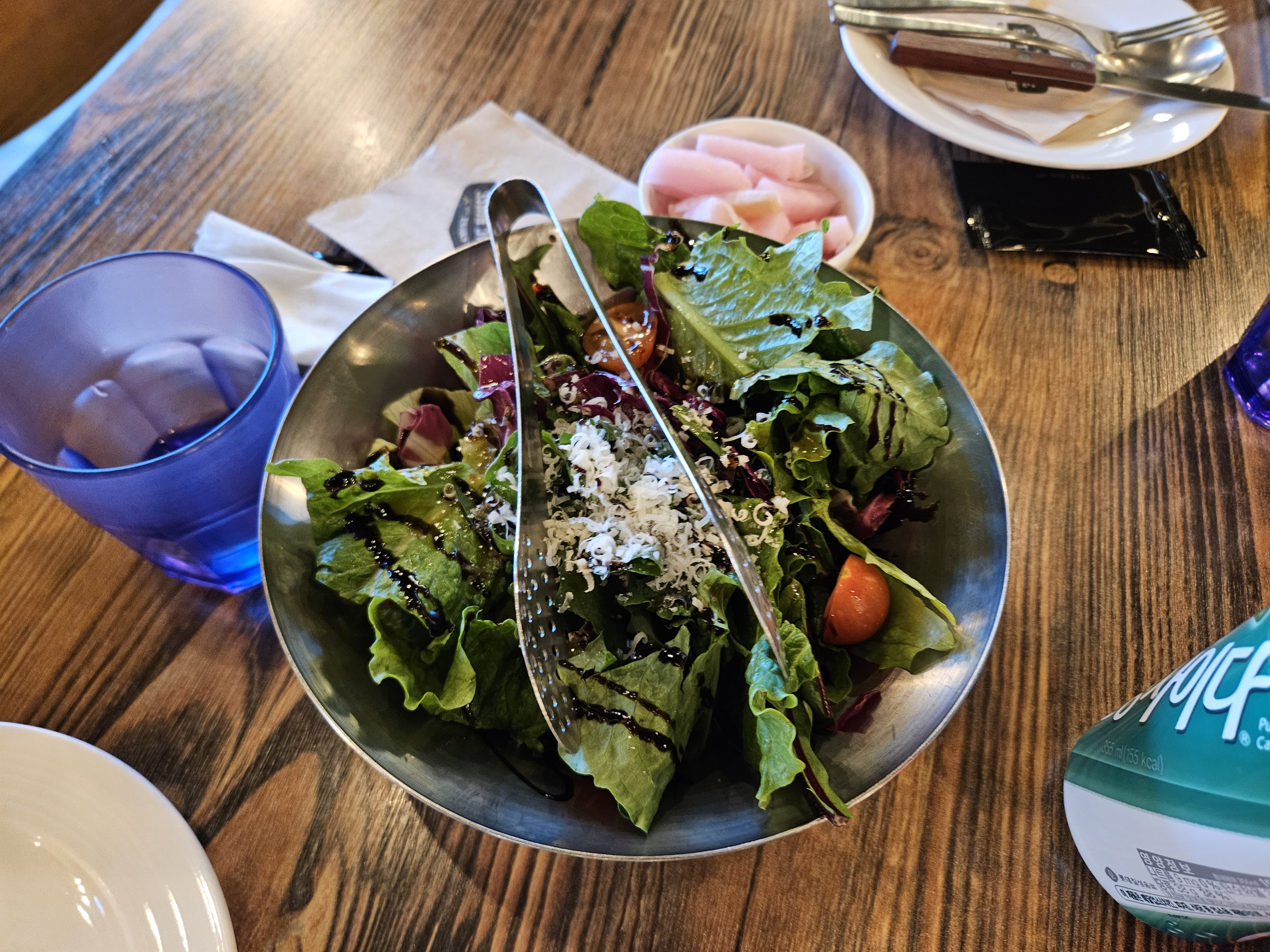메뉴판을 쭉 보고 저번처럼 하나하나씩 시키려고 했더니 직원분이 4인 세트를 안내해 주시더라고요. 4인 세트는 하나하나 골라야 했는데요. 생각보다 고르기 어려웠고 우여곡절 끝에 직원 추천으로 메뉴를 하나씩 골랐답니다. 그렇게 주문과 동시에 세트 메뉴에 포함되어 있는 음료 4잔이랑 하우스 샐러드가 나오고