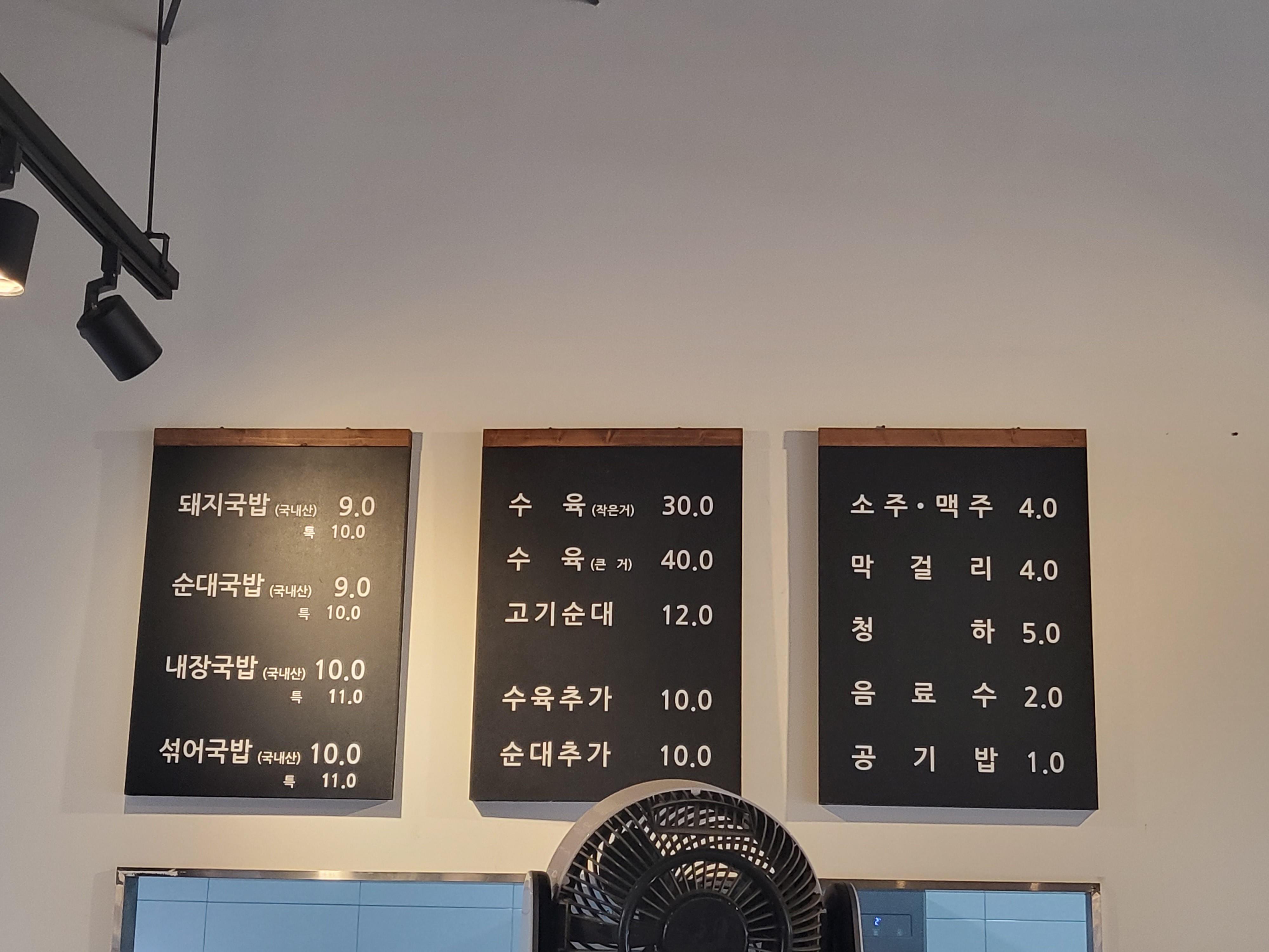 국밥 전문점인 만큼 주 메뉴는 돼지국밥, 순대국밥, 내장국밥, 섞어 국밥이 있었는데요. 가격은 섞어 국밥 빼고 9,000원에 판매하고 있었고 섞어 국밥은 10,000원에 판매하고 있었습니다. 그리고 각 메뉴마다 특으로 시키면 1,000원을 추가해야 했는데요. 그 외에도 음식으로 수육, 순대도 별도로 판매하고 있었습니다. 하지만 가격은 차후 변동될 수 있으니 참고만 하시면 좋을 것 같습니다.