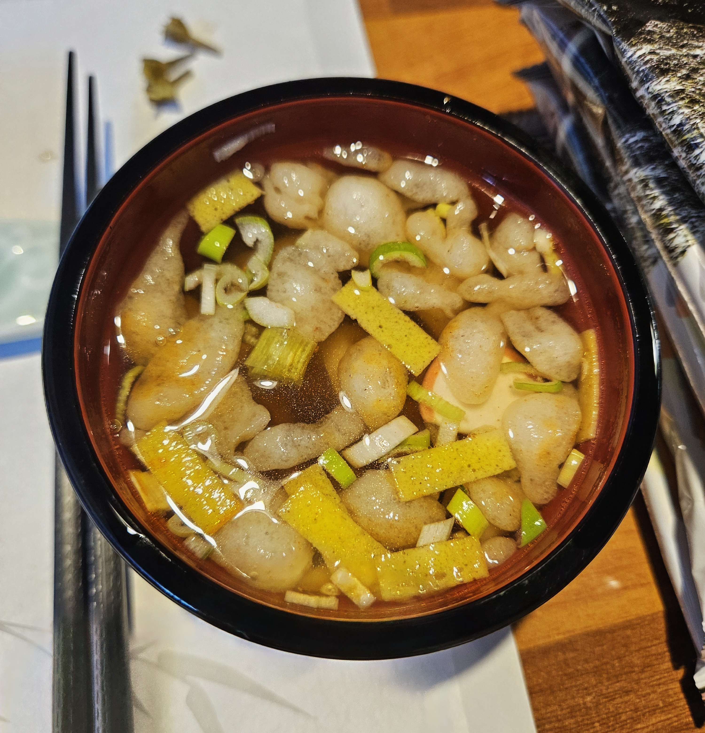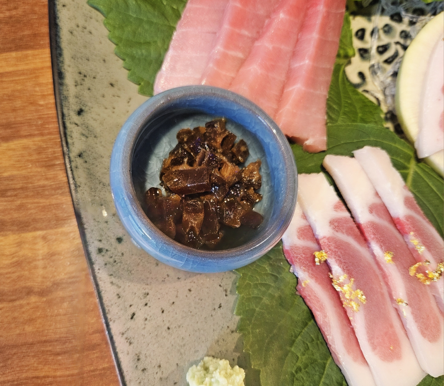 그렇게 엄마, 동생, 동생여자친구가 도착하고 참치회 선 코스로 주문을 했는데요. 우선 애피타이저로 삼과 꿀이 나왔는데 삼은 인원수대로 챙겨주시더라고요.