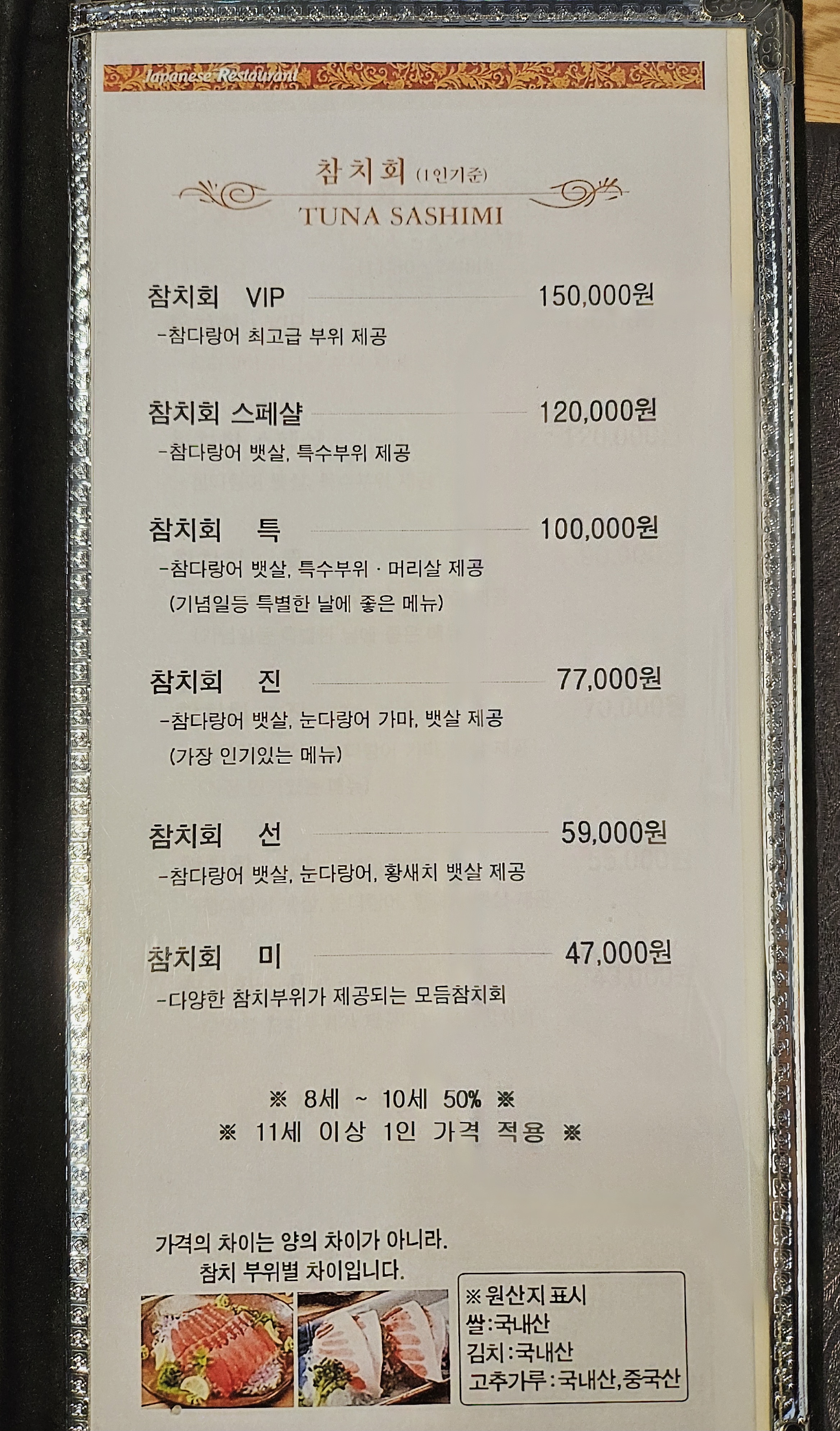입구 앞에는 참치회 1인 기준 가격도 적혀있었는데요.