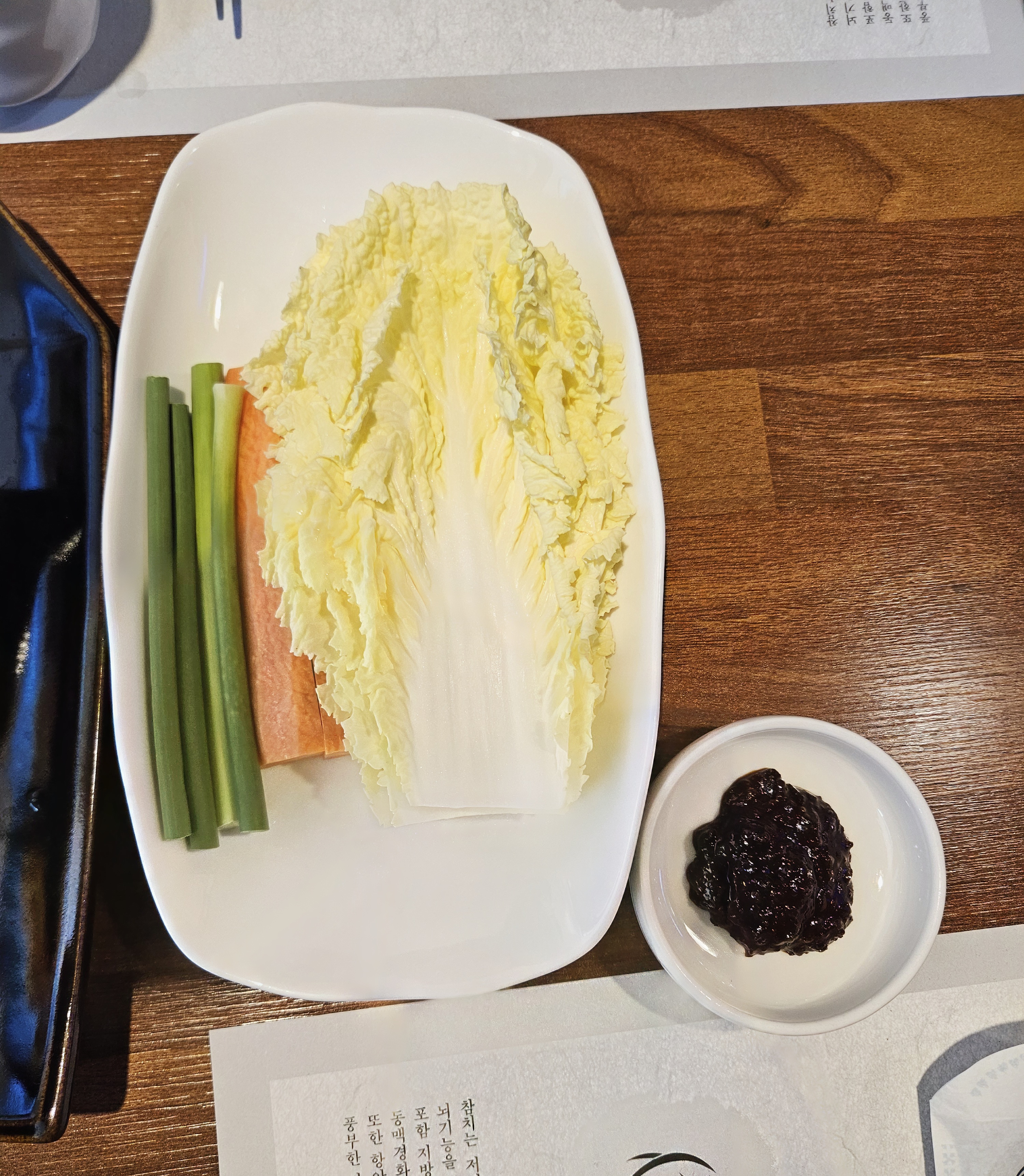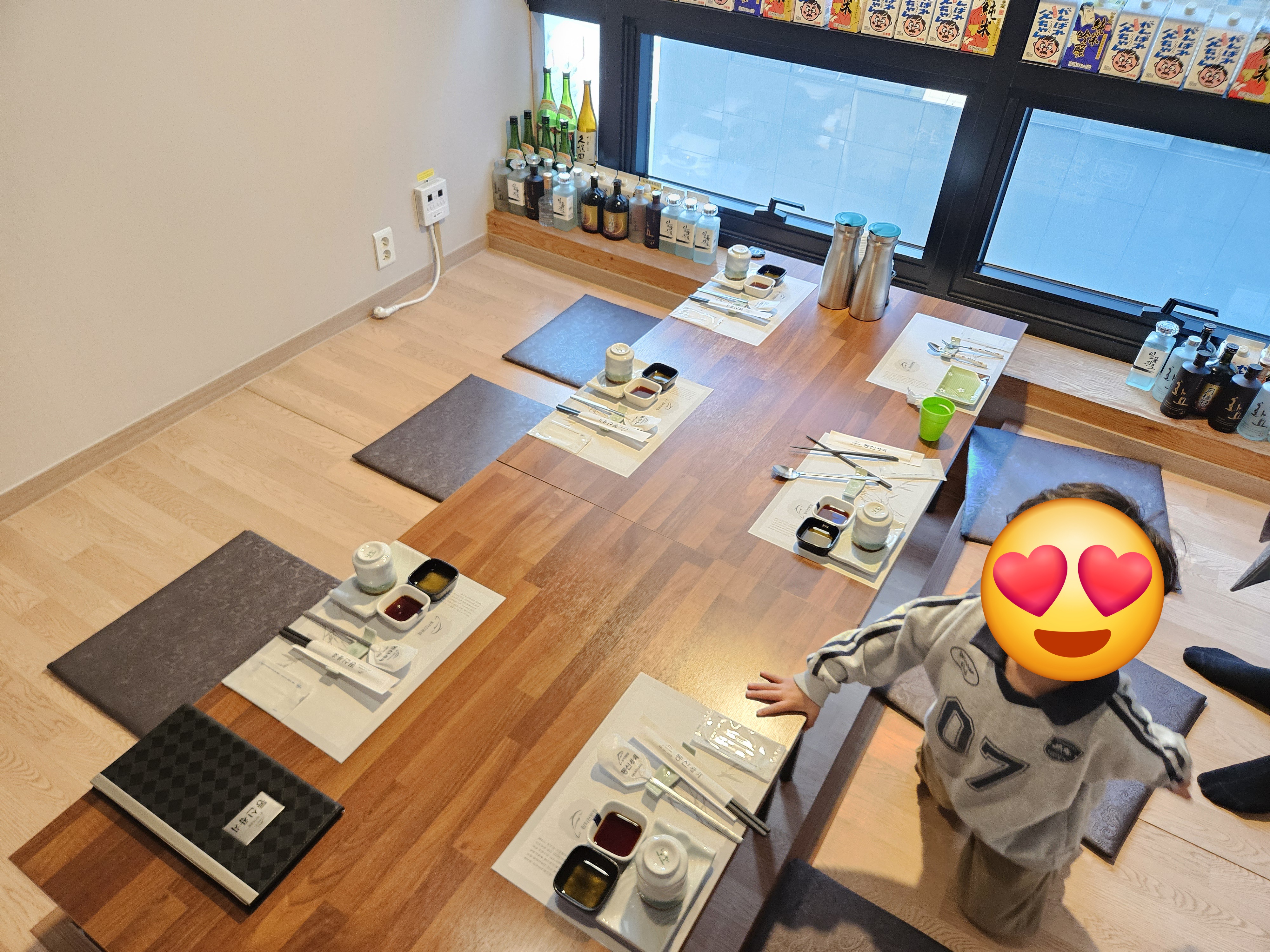 혹시 몰라 미리 예약을 해놓아서 그런지 미리 테이블 세팅이 되어있더라고요. 만 3세 아들은 자기가 숟가락, 젓가락에 있는 종이를 다 빼고 난리도 아니었습니다.