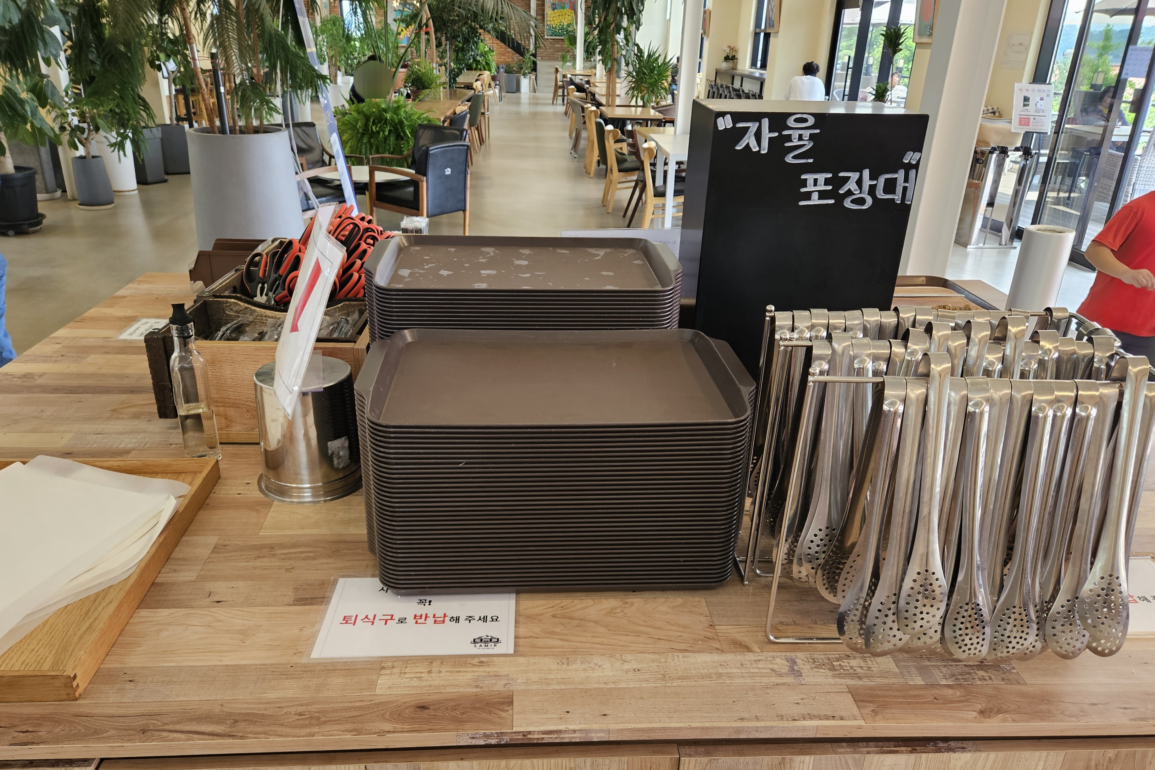 먹다 남은 빵은 1층 중앙에 가면 자율 포장대에 가서 포장을 별도로 할 수 있었고 사용한 가위랑 집게 등등은 반납하는 곳에 가져다주고 나왔답니다.