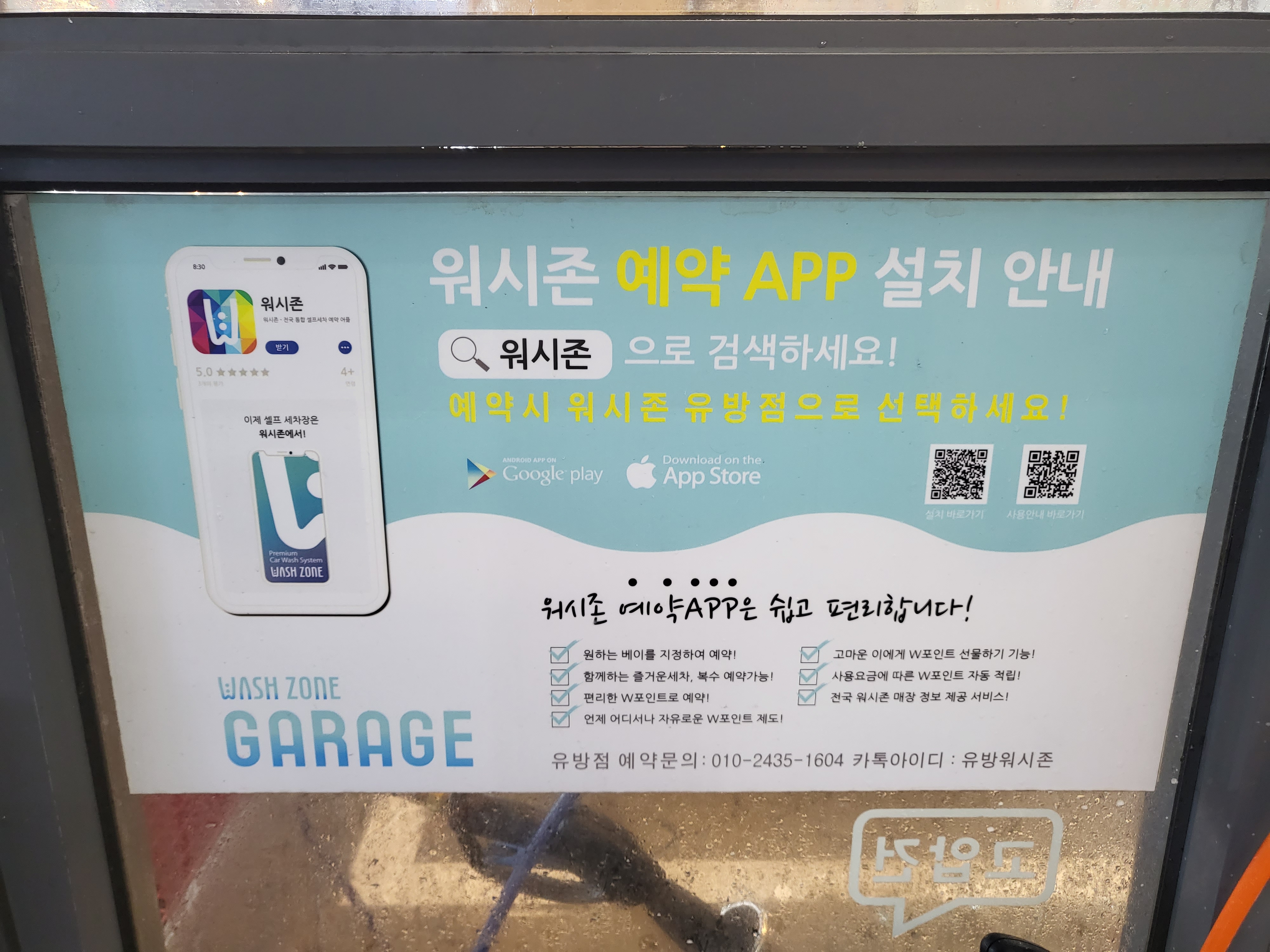 바쁠 때는 세차할 수 있는 자리가 없나 보더라고요. 그래서 워시존 예약 앱으로 간편하고 쉽게 미리 예약하고 방문하는 방법도 있었습니다. 하지만 저는 다음에 올 때도 그냥 방문하지 않을까 싶네요. 핸드폰에 어플 많이 까는걸 별로 안 좋아하거든요. 암튼 이렇게 자동차 세차를 하고 나가는 곳은 입구 반대쪽에 있었습니다.