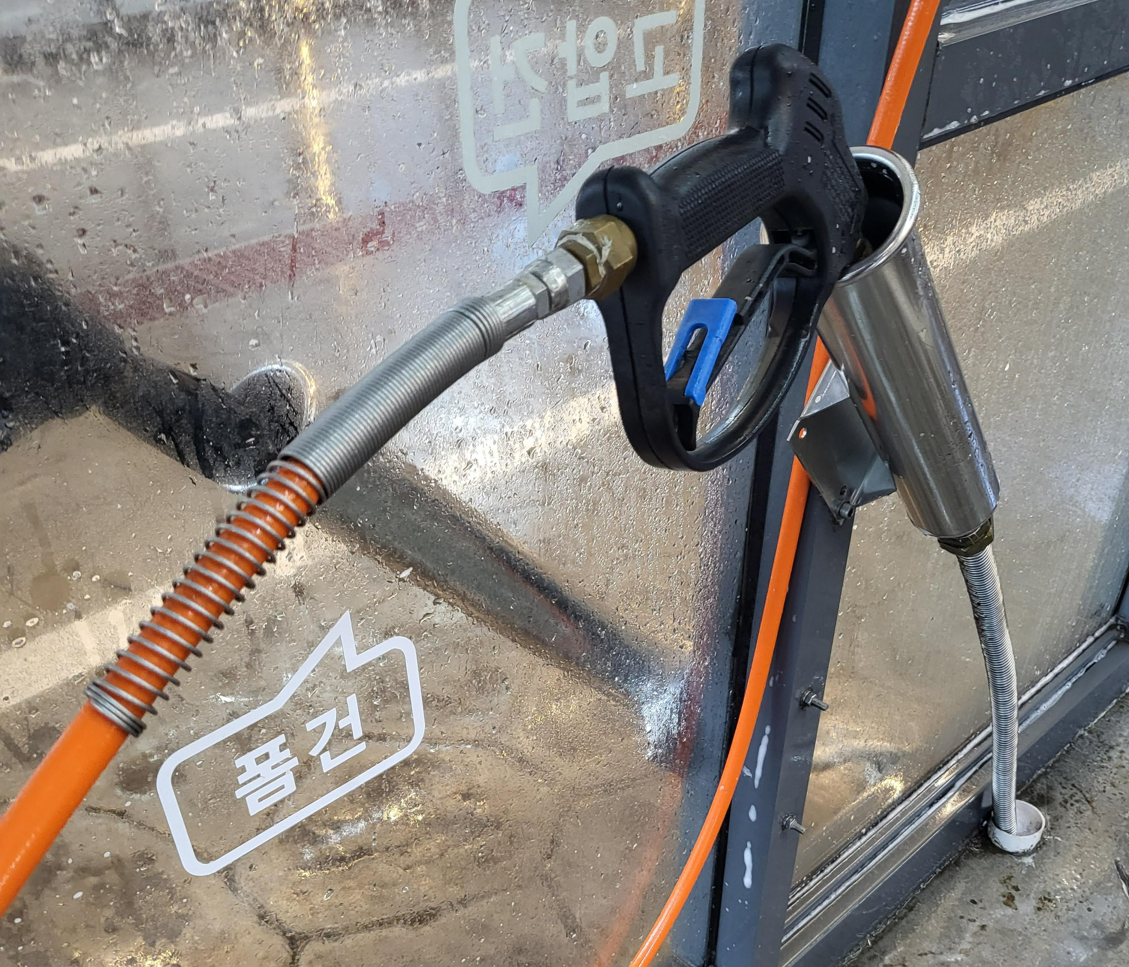 그다음 폼건으로 자동차에 거품을 내주고 바로 고압건으로 세척했는데요. 거품을 없애고 나니 고압건 위쪽에 청소솔이 별도로 있더라고요. 폼건으로 자동차에 거품을 내고 솔로 문질렀어야 하는 거 같았는데 처음이어서 뭐가 뭔지도 모르겠고 그냥 고압건으로 청소를 했습니다. 그래도 몇 주 전 자동 세차를 한 적이 있어서 그런지 거품만 내고 고압건으로 청소를 했는데도 나름 깨끗해지더라고요.