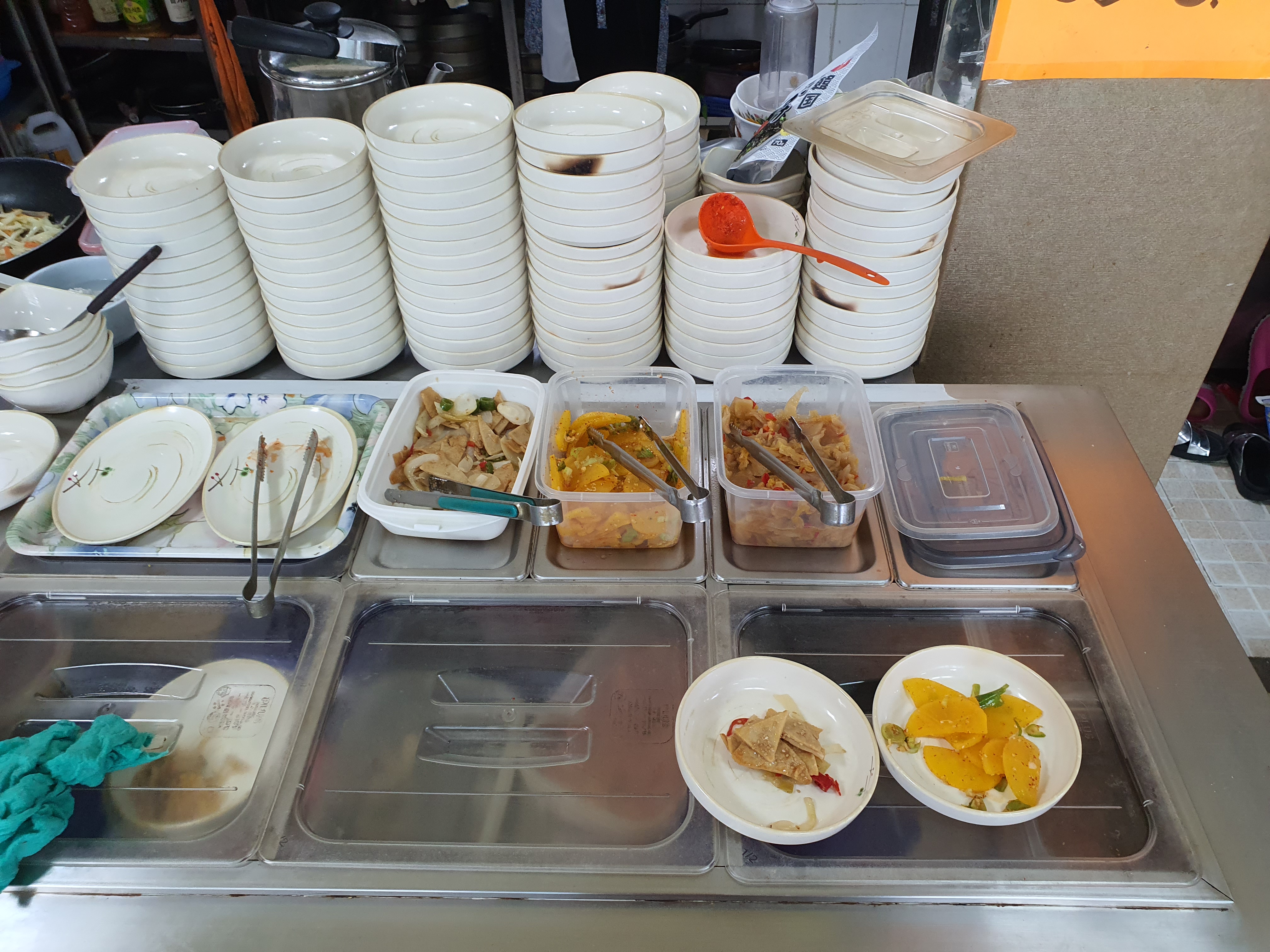 새우수제비를 시켰더니 4가지 밑반찬이 나왔습니다. 김치, 단무지, 어묵, 백김치로 나왔는데요. 예상이긴 하지만 반찬 메뉴는 그때그때 달라지지 않을까 싶습니다. 그리고 반찬을 먹고 만약 더 먹고 싶다면 셀프코너에서 반찬을 추가로 퍼올 수 있으니 참고하시면 좋을 것 같습니다.