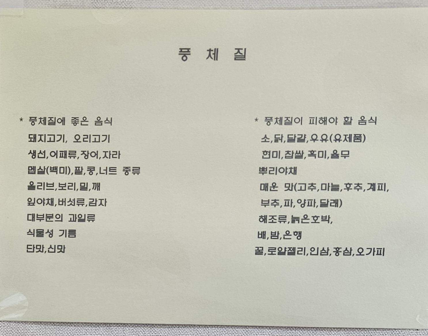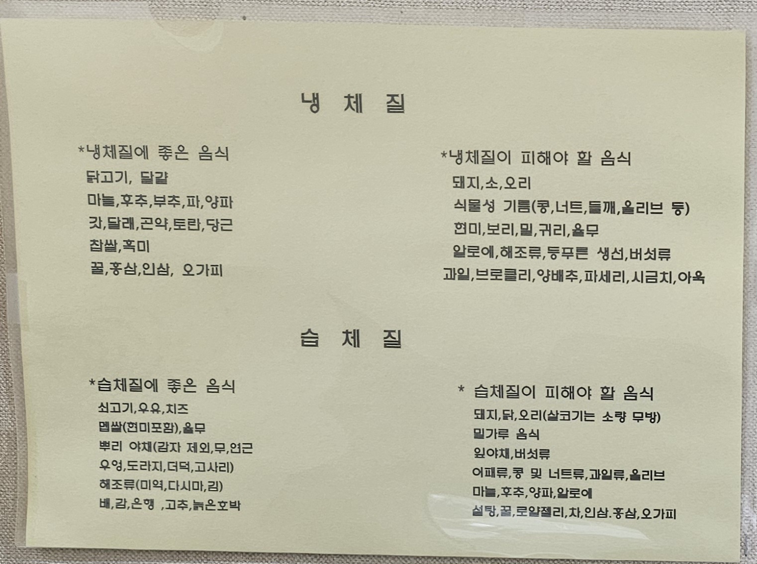 그리고 여러 가지 체질에 대한 내용과 체질에 따라 몸에 좋은 음식, 피해야 할 음식을 나눠 놓은 글도 있어서 한번 찍어보았습니다. 당연히 본인 체질이 궁금하다면 진료를 받아야겠죠. 원장님이 한분이어서 대기 시간이 조금 길어지는 경우도 있다고 하니 참고하시면 좋을 것 같습니다.