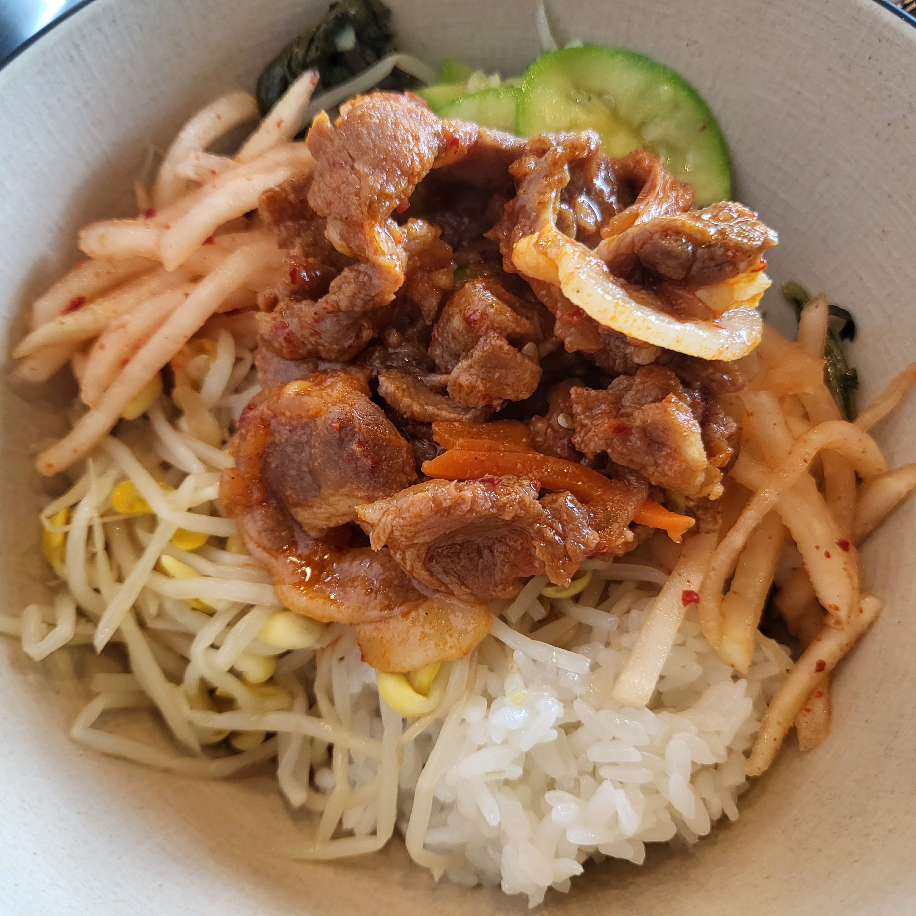 그렇게 본격적으로 먹어보기 시작했는데요. 밥에 각종나물을 넣고 제육볶음이랑 같이 비벼먹어서 먹으니 맛은 있더라고요.