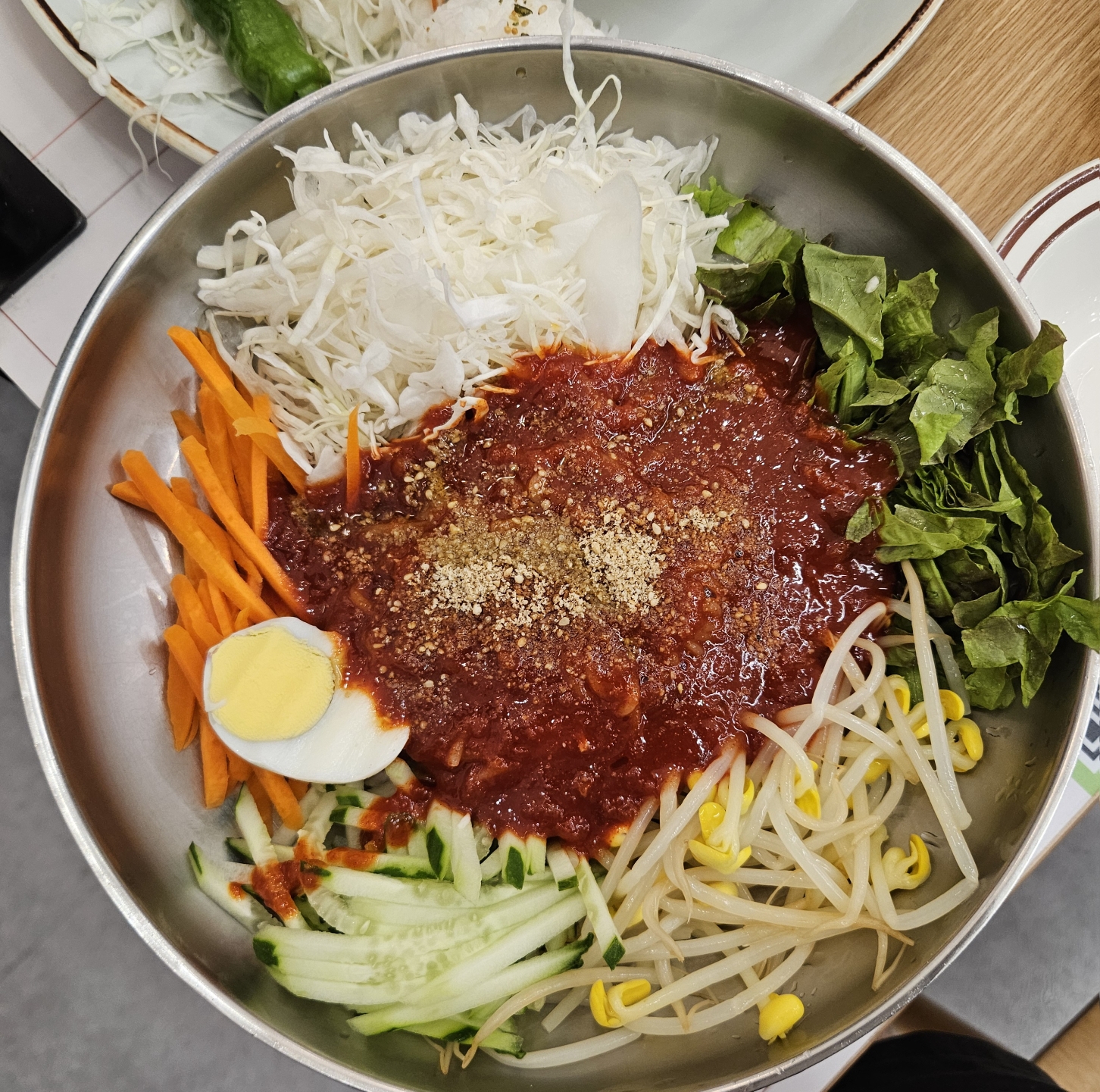 다음으로 왕쫄면을 먹어보았는데요. 쫄면에 야채가 가득하고 쫄깃한 게 맛있었고 양념 또한 적당히 매콤하면서 제 입맛에는 딱 좋아 후루룩 넘어가더라고요. 맵찔이인 와이프는 자기 입맛에는 맵다면서도 잘 먹었답니다.