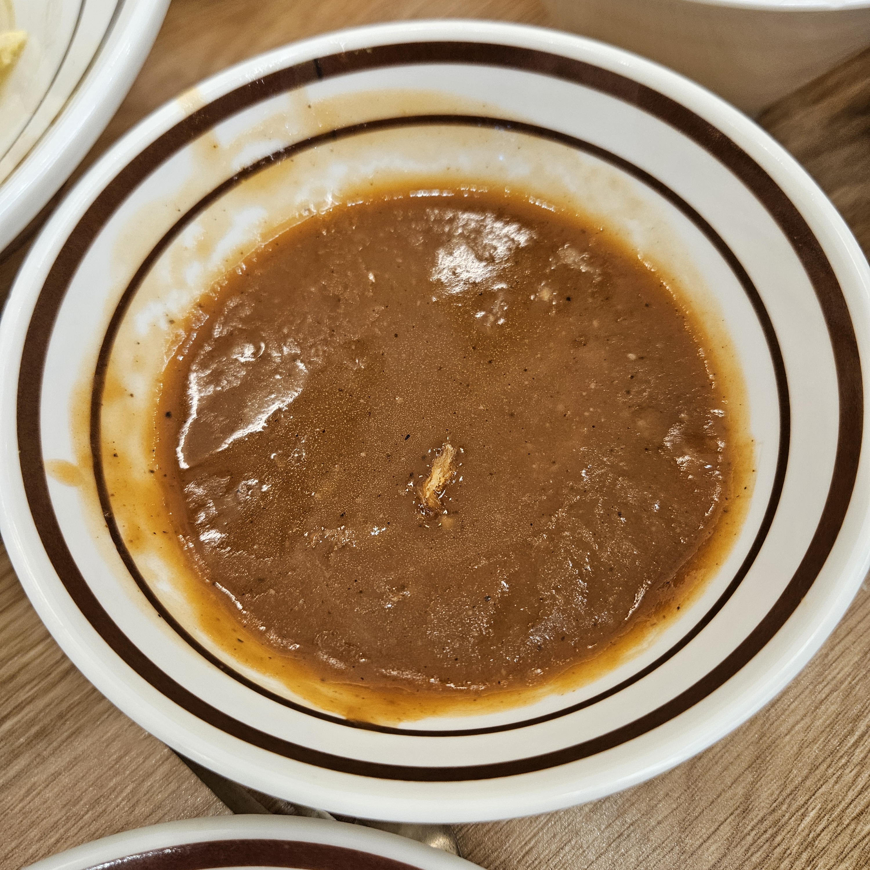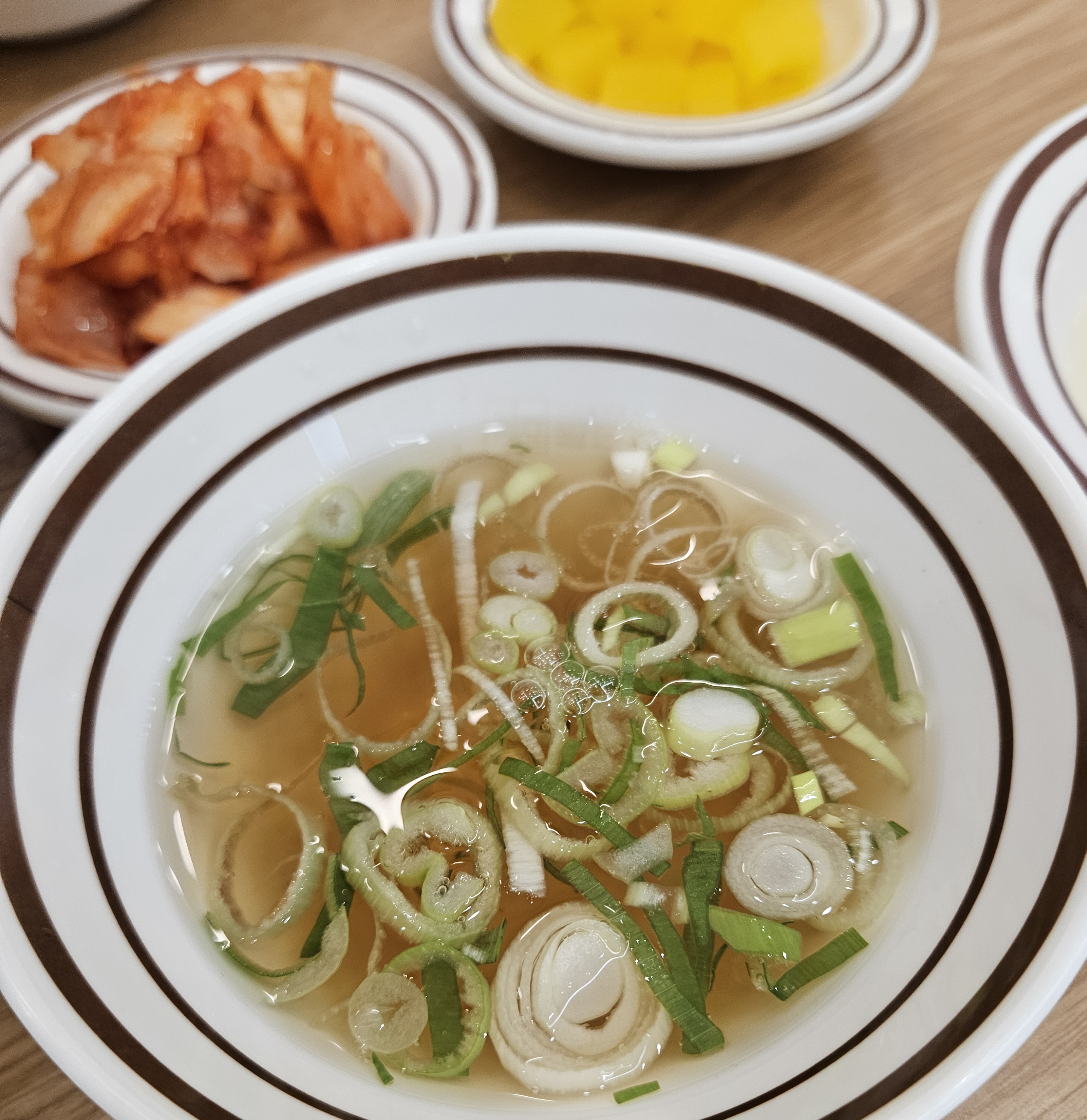 음식 나오기 전 셀프바에서 스프, 국, 반찬을 떠 와 음식을 기다렸고