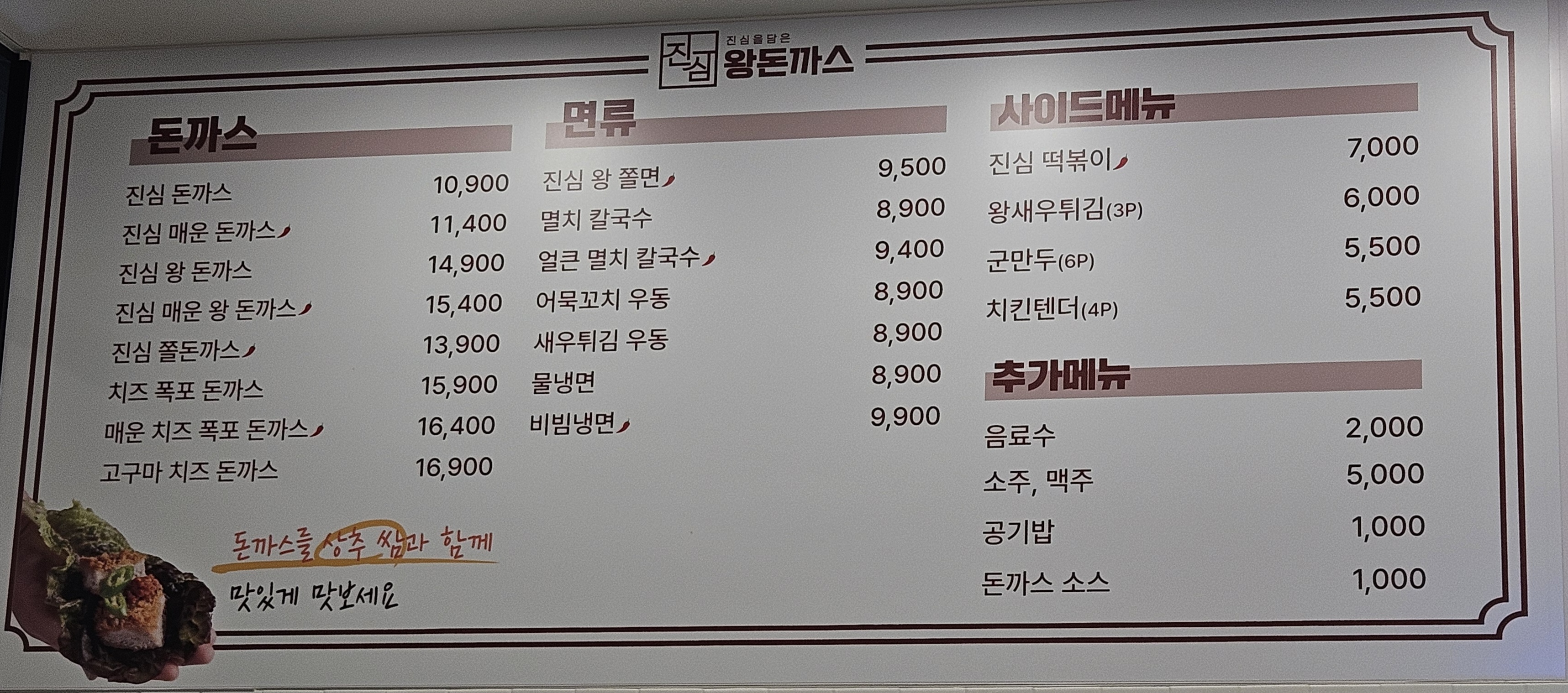 진심왕돈까스에서 판매하는 메뉴는 돈까스류, 면류, 사이드 메뉴로 떡볶이, 왕새우튀김, 군만두, 치킨텐더도 판매를 하고 있었는데요. 추가로 카레를 이용한 돈까스도 판매하는 듯했습니다.