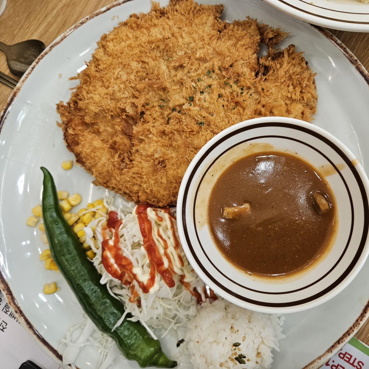 맛 또한 느끼함도 덜하면서 튀김옷은 어찌나 바삭거리던지. 거기에 돈까스 소스까지 맛있어서 계속 넘어갔답니다. 특히 소스에 버섯 슬라이스도 큼지막하게 들어있었습니다. 계속 먹다가 조금 느끼하다고 느낄 때쯤 고추를 먹어주니 느끼함이 싹 날아가더라고요. 양배추 샐러드는 케찹 마요네즈 소스로 옛날 돈까스 느낌이 물씬 났답니다.