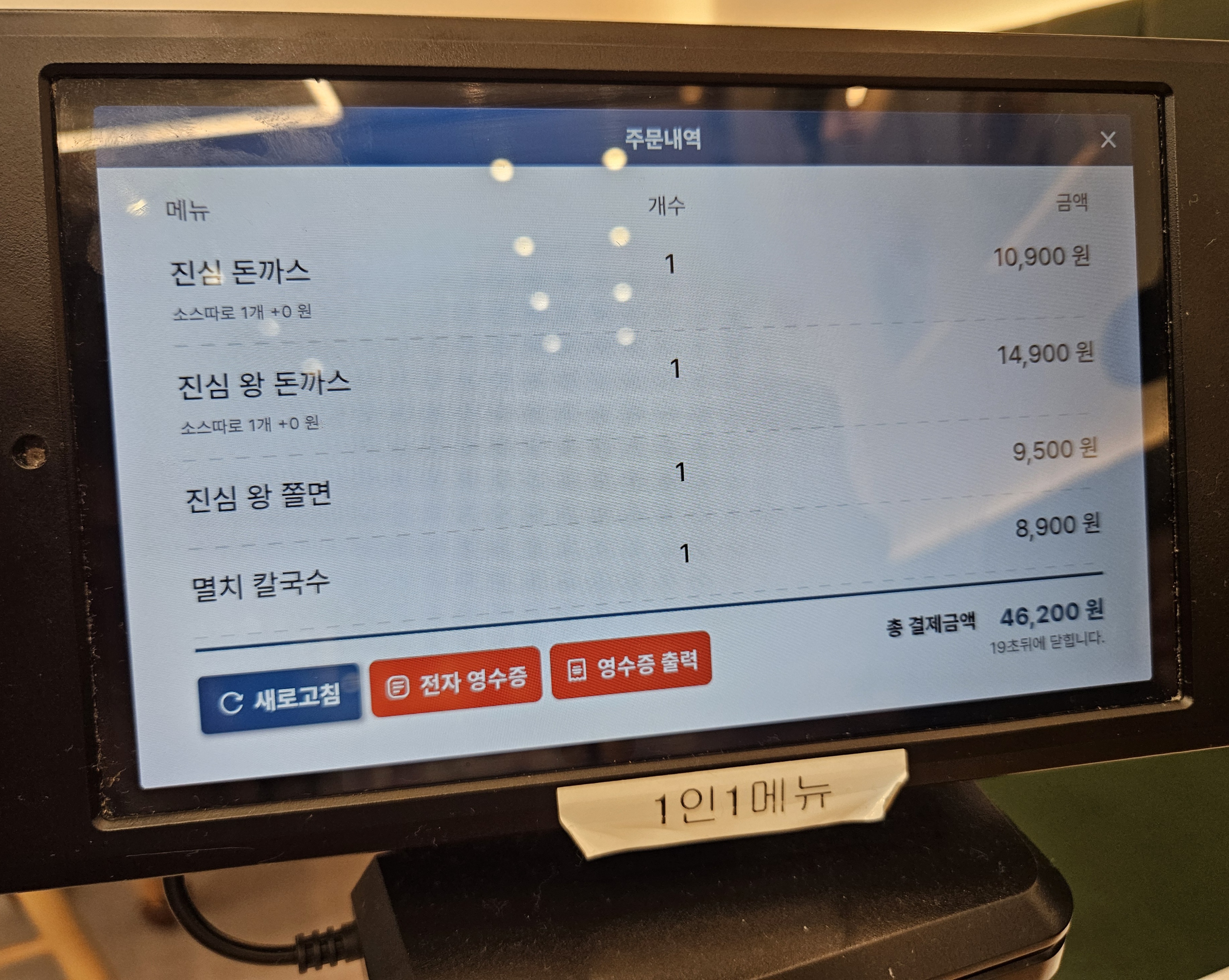 추가 메뉴를 보고 싶다면 테이블에 있는 키오스크를 이용해 확인할 수 있었고 결제까지 같이 진행하는 시스템이었는데요. 저희 가족은 먹성이 좋아 남으면 포장해야지라는 마인드로 돈까스, 왕돈까스, 왕쫄면, 칼국수까지 주문을 했답니다.