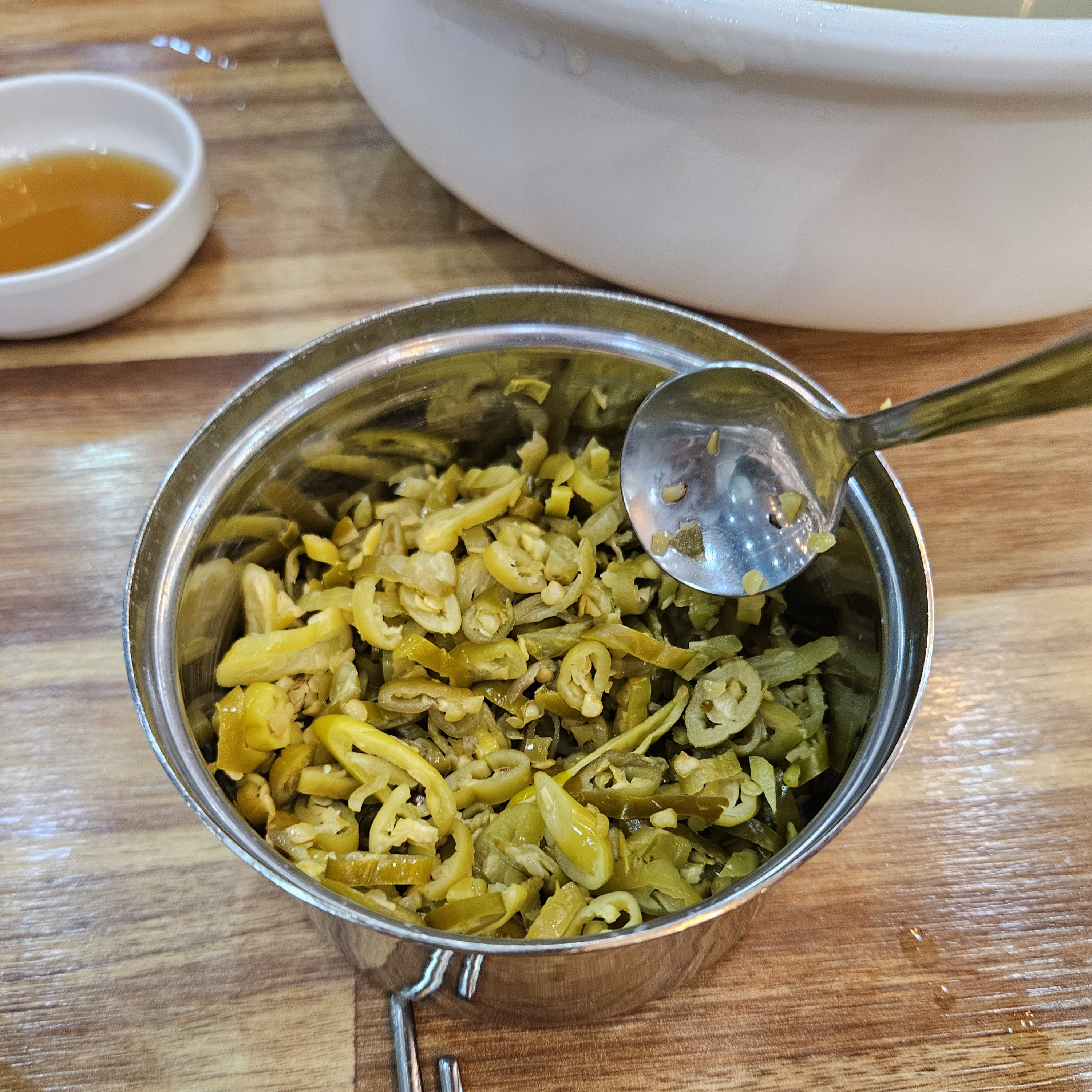 테이블에 배치되어 있는 후추와 고추장아찌를 넣어 먹었더니 얼큰하고 시원한 국물맛을 느낄 수 있더라고요. 아무것도 넣지 않으면 깔끔 담백한 국물맛이 느껴지니 취향대로 드시면 좋을듯합니다.