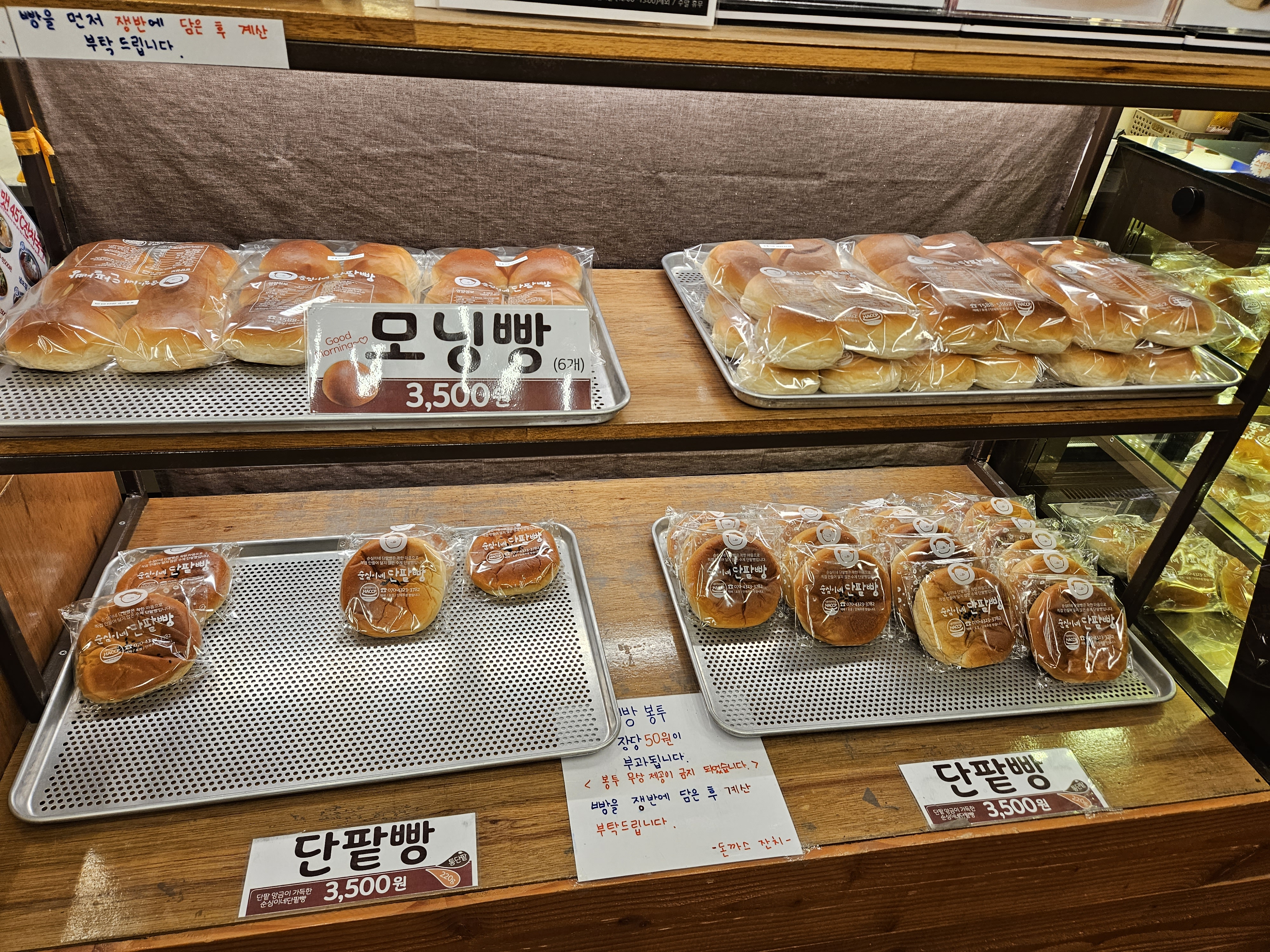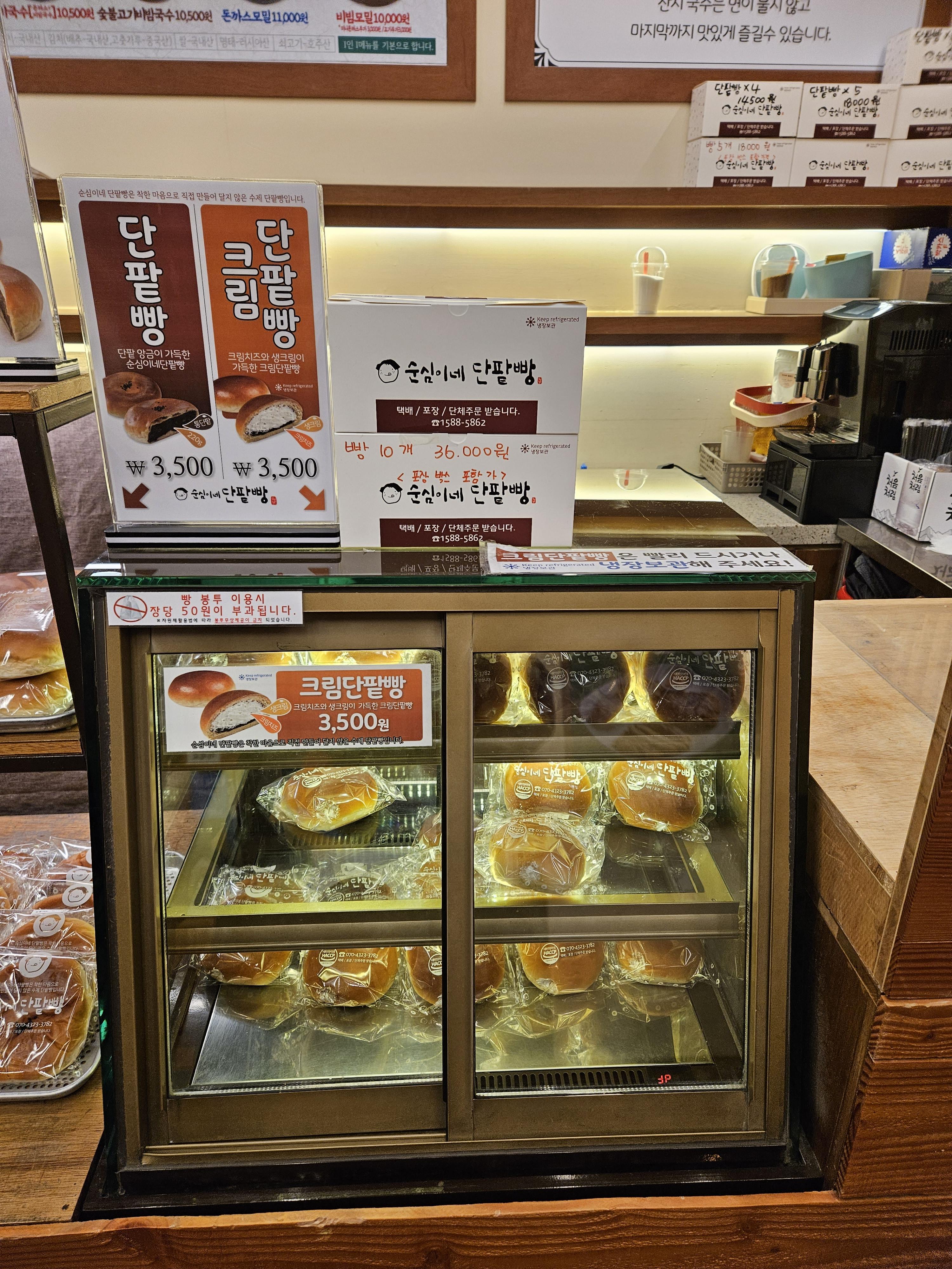 그리고 계산하는 카운터에는 순심이네 단팥빵이라고 모닝빵, 단팥빵, 크림단팥빵도 별미로 판매하고 있는데요. 와이프가 크림단팥빵도 먹고 싶다고 해서 사주고 그걸 보고 아들도 모닝빵 사달라고 해서 사주었습니다.