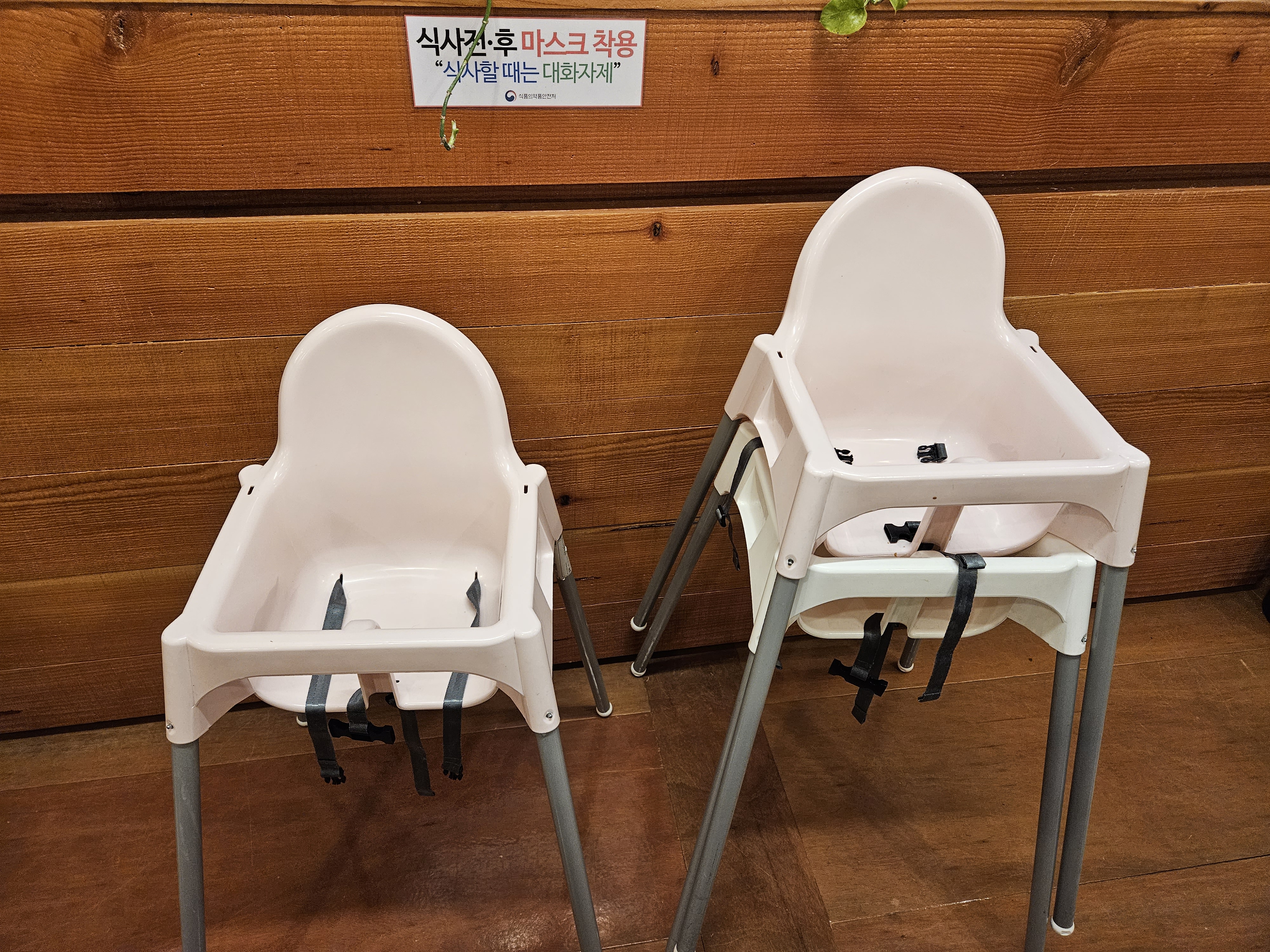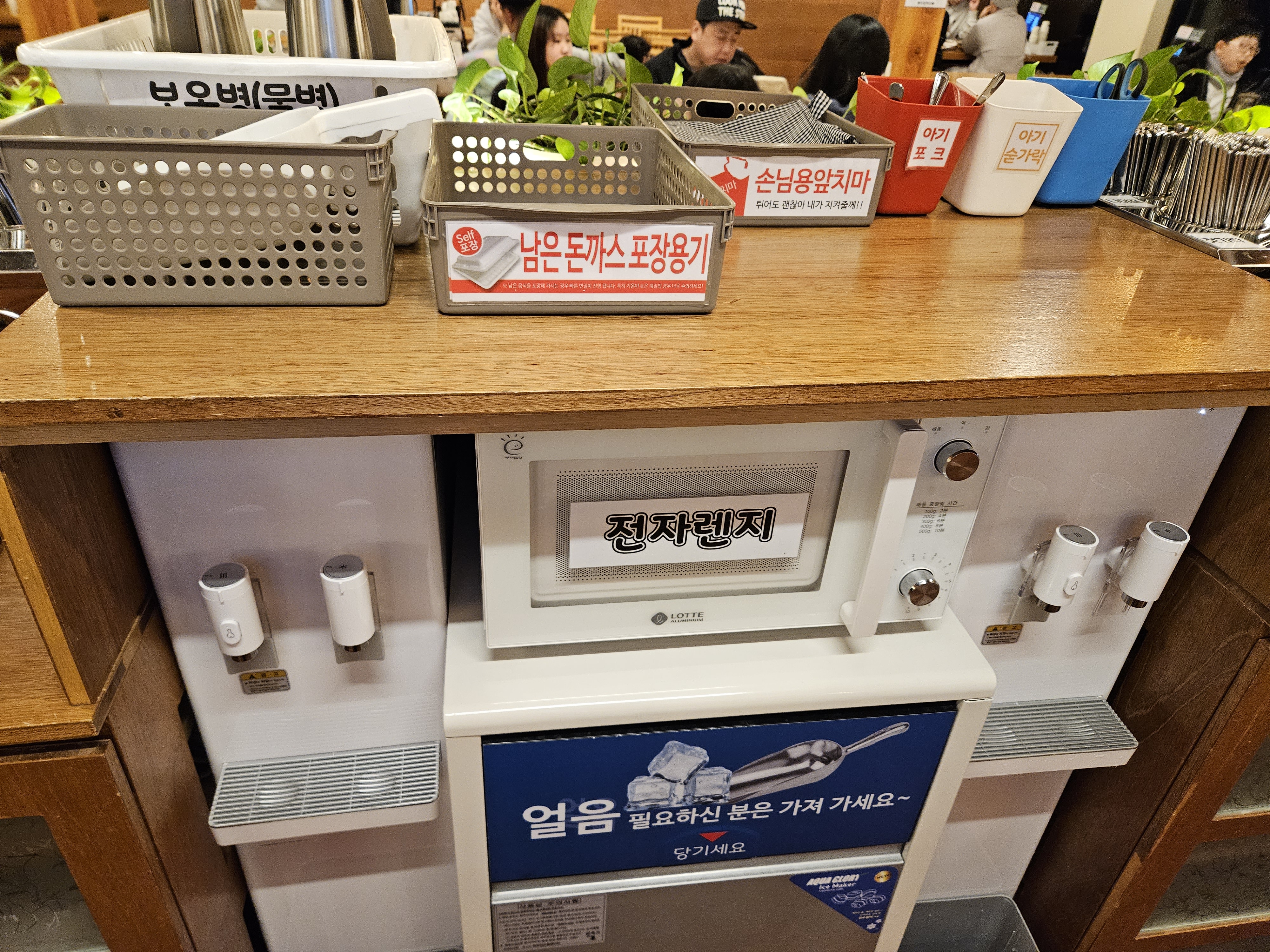 거기에는 물통, 앞접시, 수저, 먹다 남은 돈까스 포장 용기, 아기 포크/숟가락, 전자레인지, 아기 의자까지 준비되어 있었습니다.