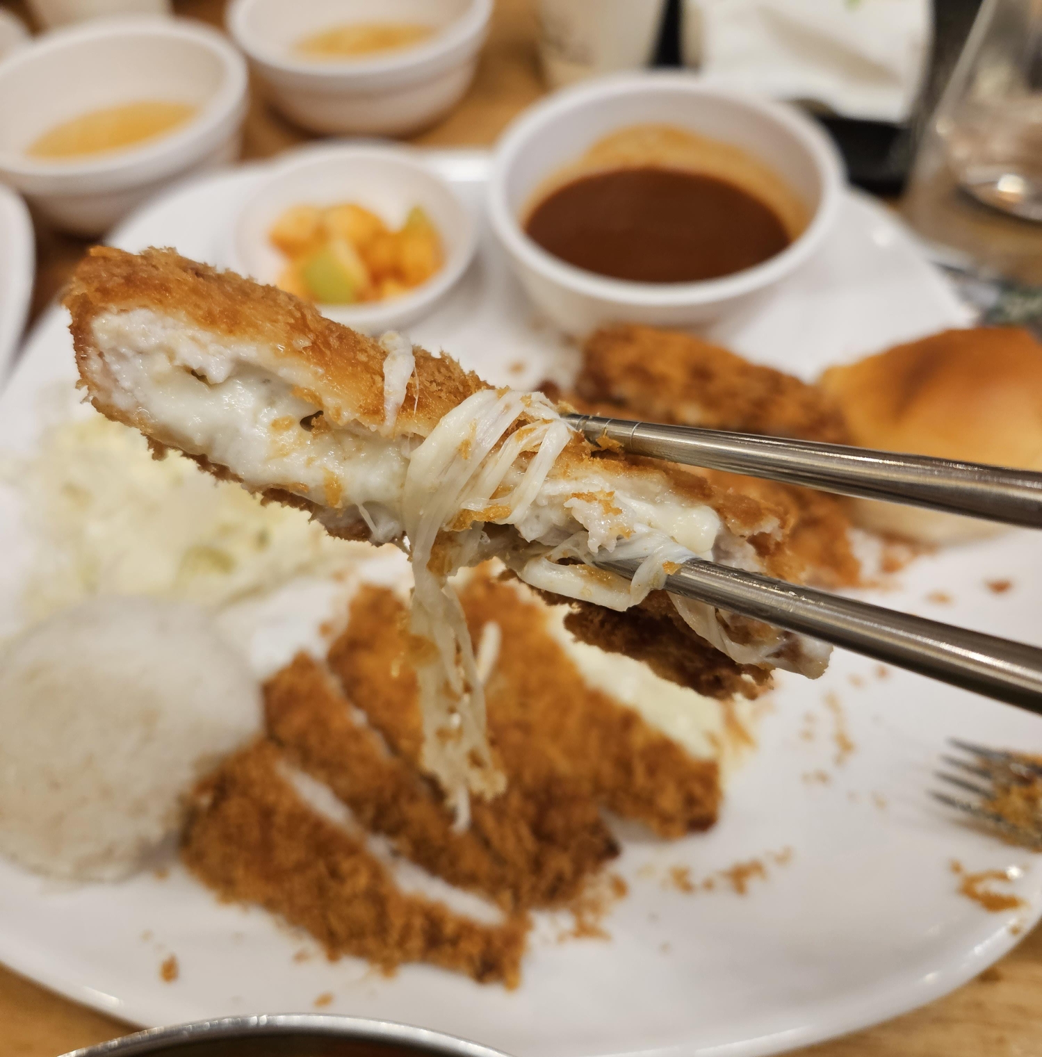 그리고 돈까스 소스도 맛있더라고요. 딱히 특별한 느낌의 소스는 아니었지만 맛있었습니다. 하지만 조금 아쉬운 점이 있다면 치즈가 돈까스 가운데 거의 다 뭉쳐있어서 그런지 돈까스 끝쪽 부분에는 치즈가 별로 없다는 점이 조금 아쉬웠습니다.