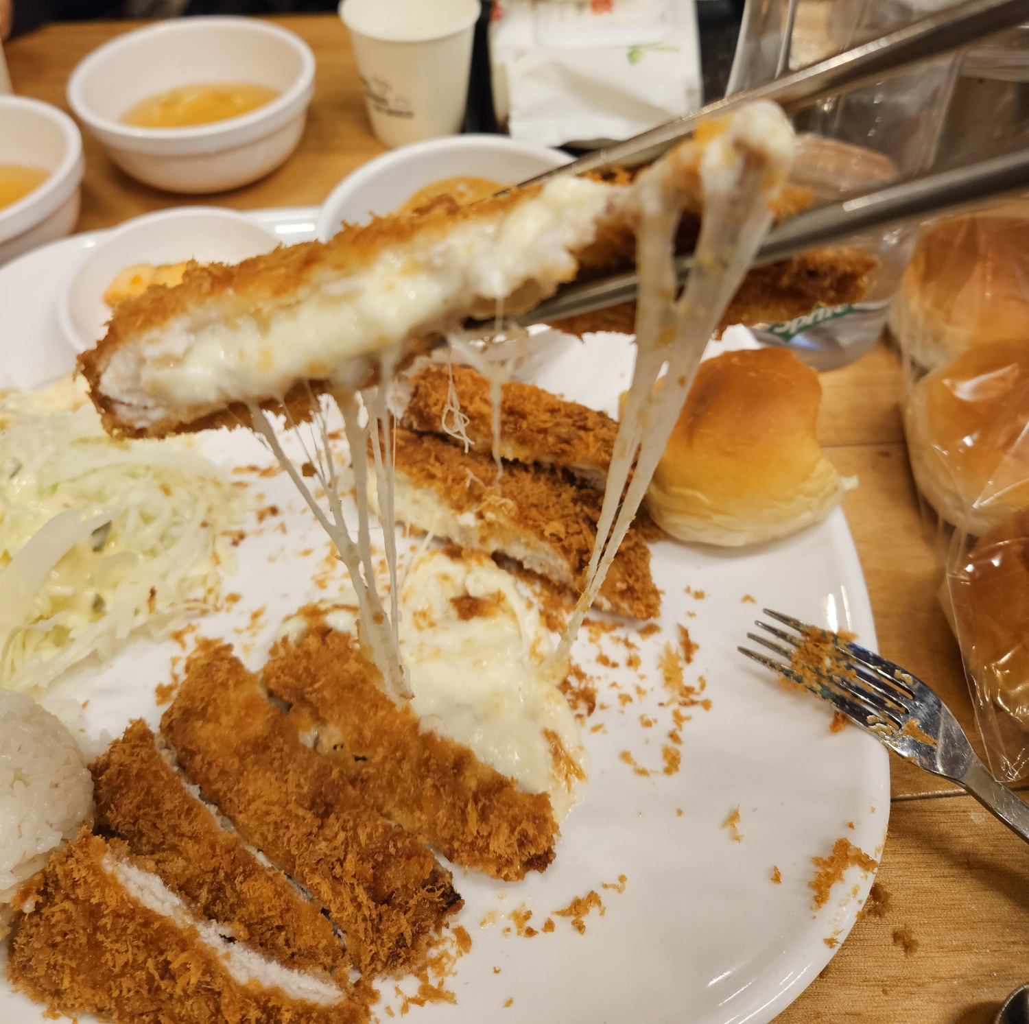 우선 치즈가 식기 전에 치즈돈까스부터 잘라보았는데요. 속에서 넘쳐 나오는 치즈 보이시나요? 역시 치즈돈까스는 바로 먹어야 맛있습니다.