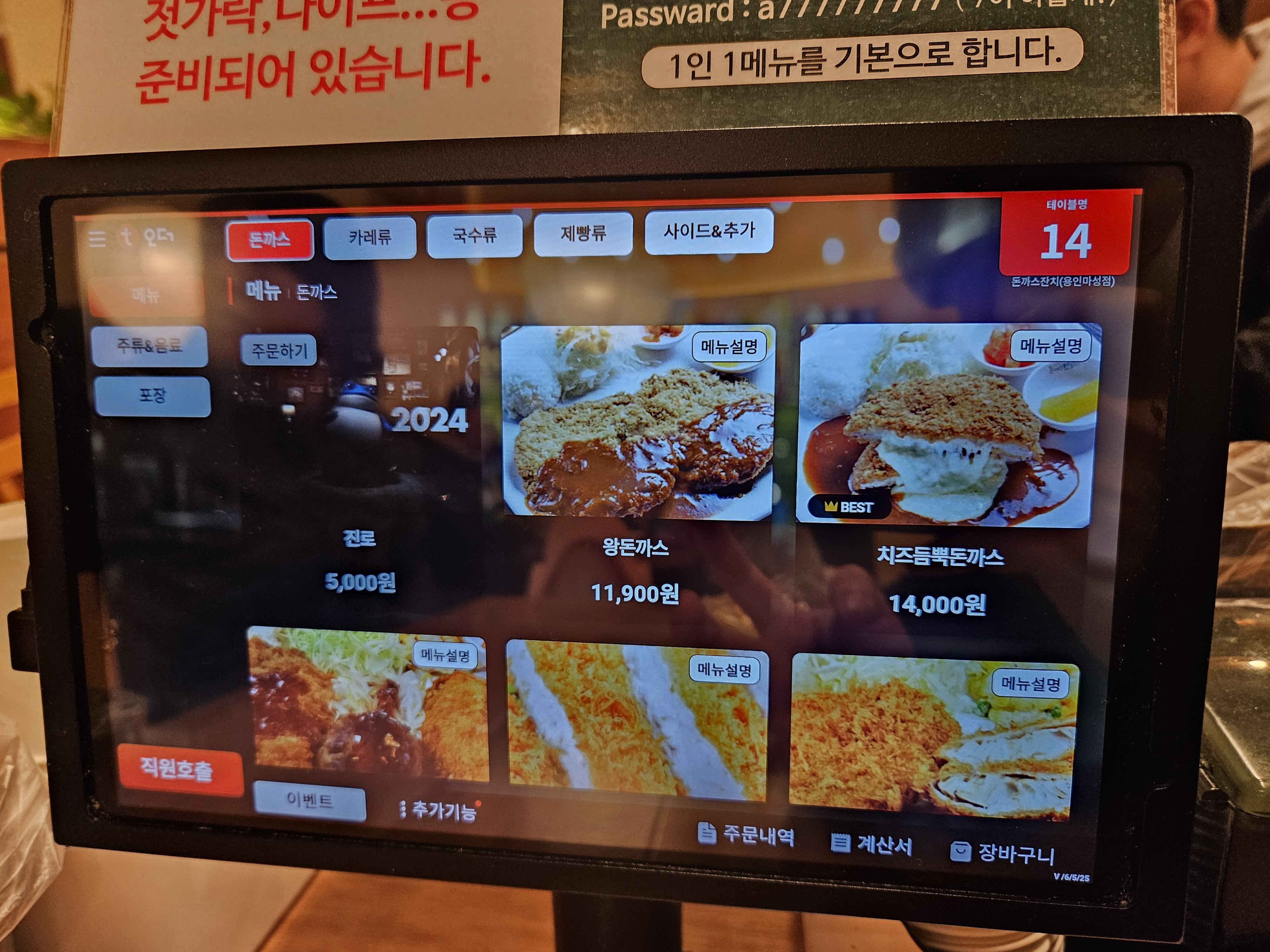 다른 곳은 모르겠는데 돈까스잔치 마성점은 테이블에 메뉴판이 별도로 없고 각 테이블에 있는 키오스크를 이용해 주문하는 방식인데요. 매장 안에 액자처럼 메뉴랑 가격이 적혀있어 사진 찍어보았습니다. 가격은 차후 변동될 수 있으니 참고만 하시면 좋을 것 같아요.