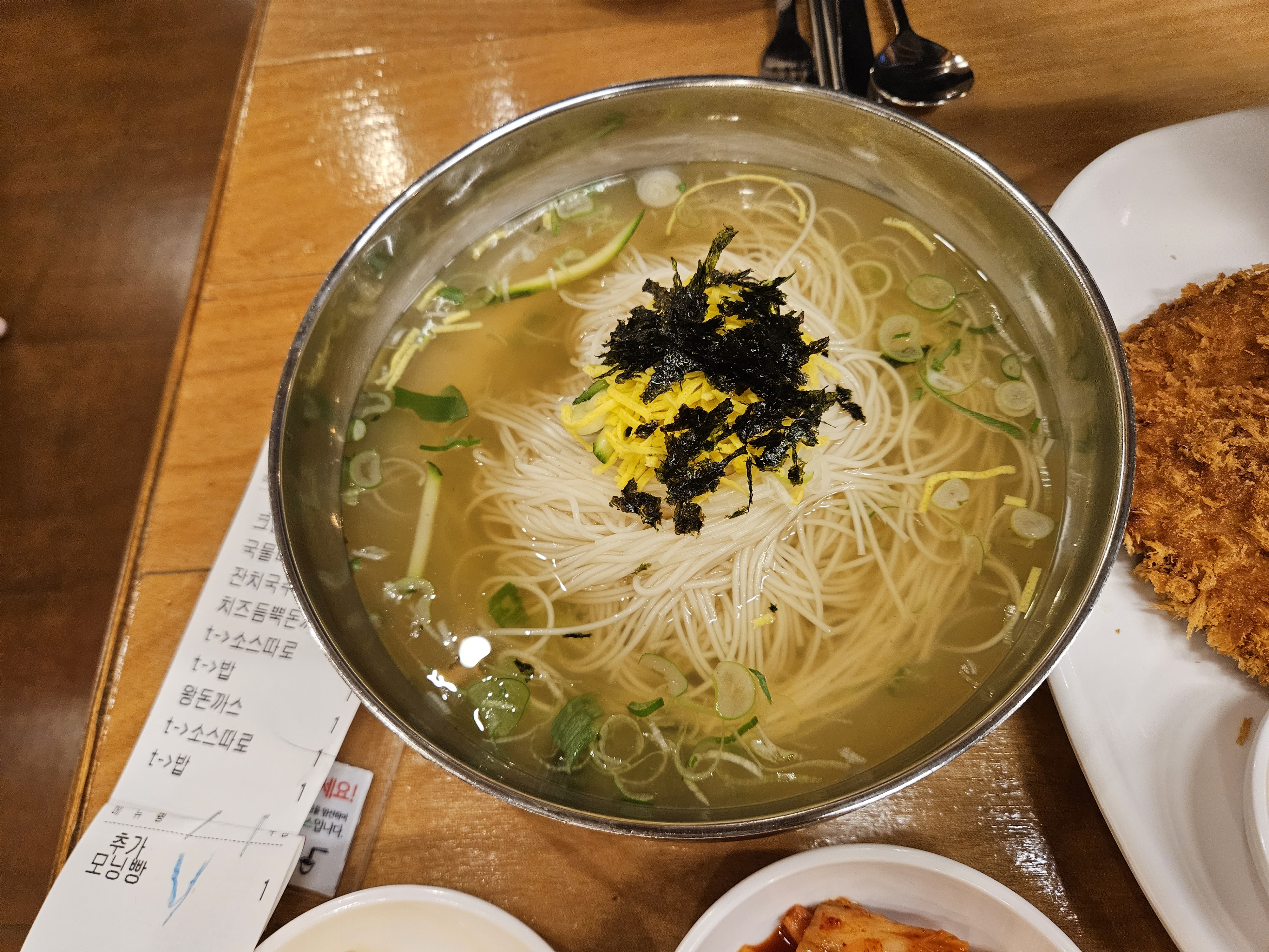저희가 주문한 음식은 왕돈까스, 치즈돈까스, 잔치국수, 국물잔치국수 돈까스 소스는 따로 찍어서 먹을 수 있게 주문을 했는데요. 33개월 아들이랑 와이프, 제가 먹기에 많은 양이긴 하지만 왕돈까스는 남으면 포장해 갈 수 있어 먹고 싶은걸 다 시켰답니다.