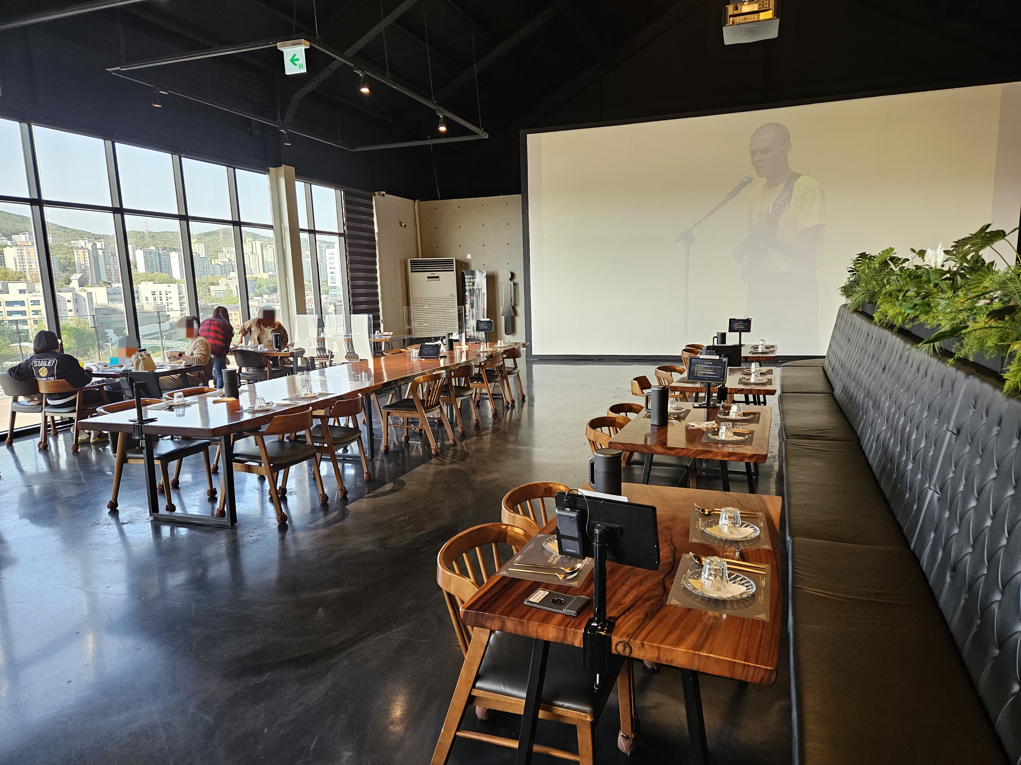 우선 내부가 넓고 깔끔해서 좋았고 실제 가수가 노래를 부르는 건 아니었지만 대형 스크린을 통해 라이브 공연도 볼 수 있어 괜찮았습니다. 특히 개인적으로 창가 쪽 테이블이 제일 명당자리라고 생각합니다. 오후 5시에 막 오픈했을 때는 방문객이 적었지만 식사를 마치고 밖으로 나가니 주차장 자리에 차들이 엄청 많았습니다. 평일에 손님이 이 정도면 주말에는 바글바글할 것 같다는생각이 들었습니다. 또 저희 말고도 생일 맞아서 방문한 분들이 또 있었는데 분위기가 좋아서 기념일에 많이들 찾는 것 같더라구요. 저도 어머님 덕분에 맛있는 식사를 하고와서 기분이 좋았습니다.