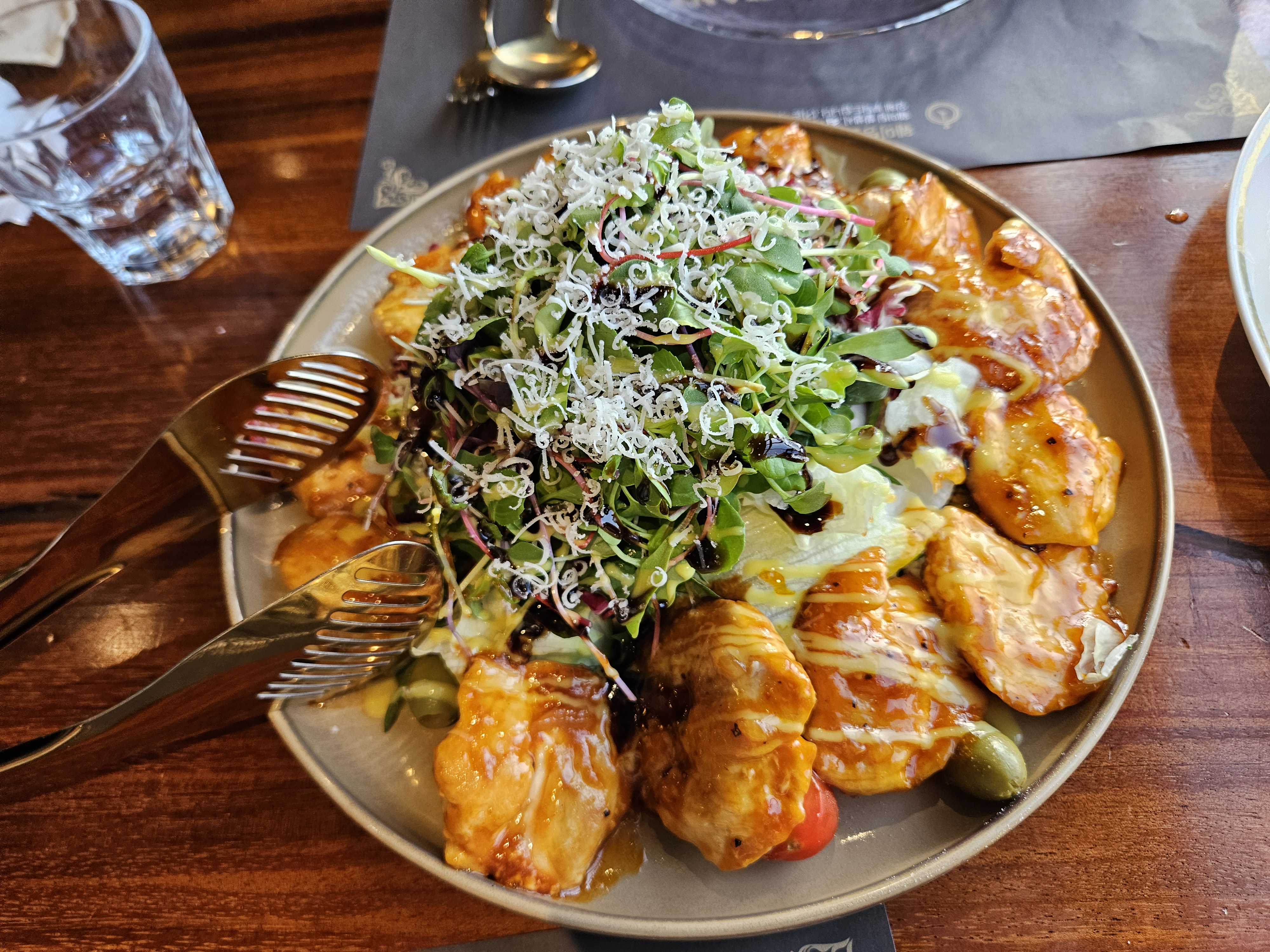 치킨 샐러드는 칠리소스가 뿌려진 샐러드였는데요. 고기는 생각보다 뻑뻑했지만 드레싱이 맛있고 야채가 양이 푸짐해서 함께 곁들여먹으니 먹을 만했습니다. 제가 맛있게 먹으니깐 아들도 먹어보고 싶었는지 한입 줘봤는데 뻑뻑해서인지 생각보다 잘 안먹더라고요.