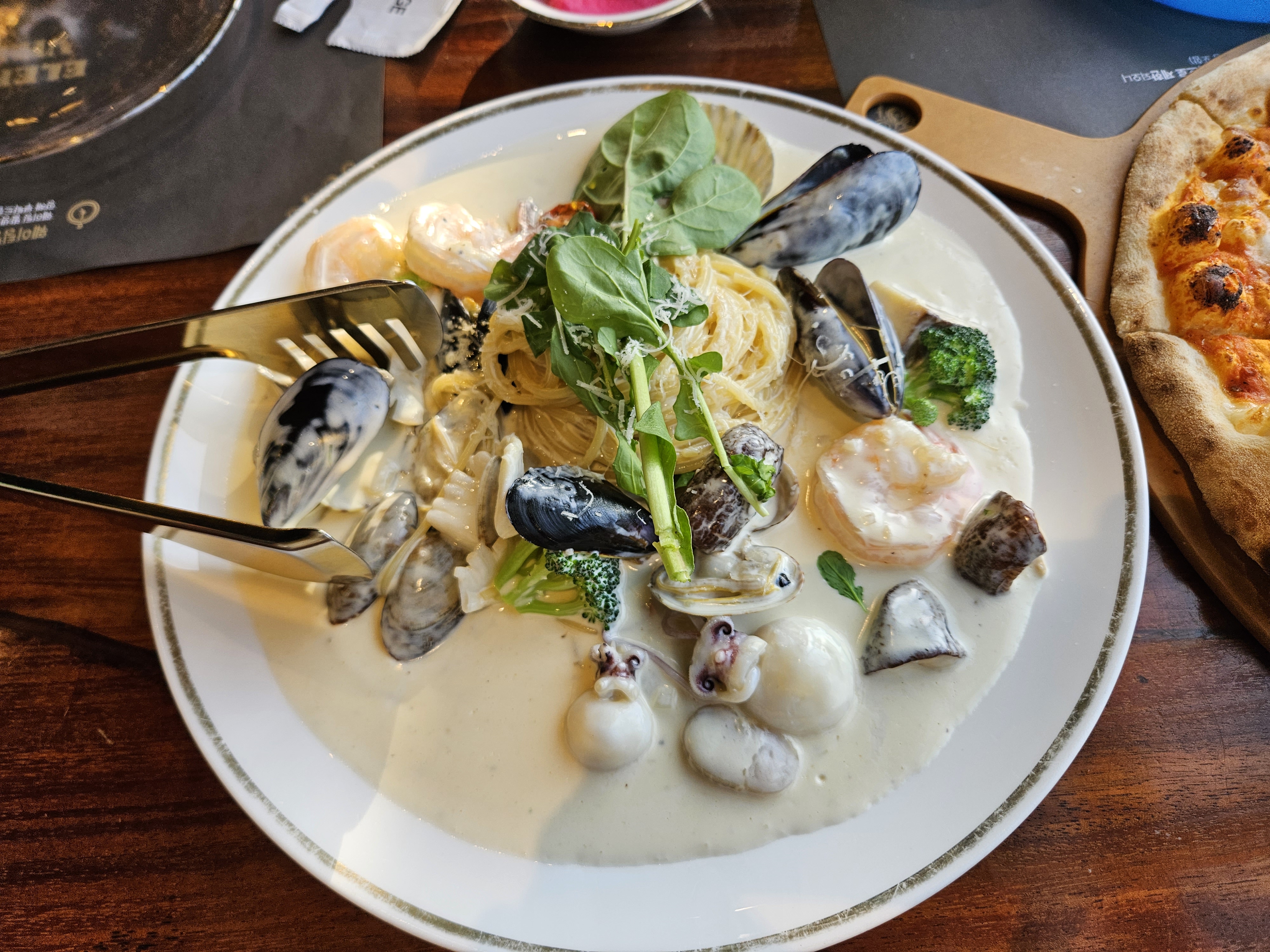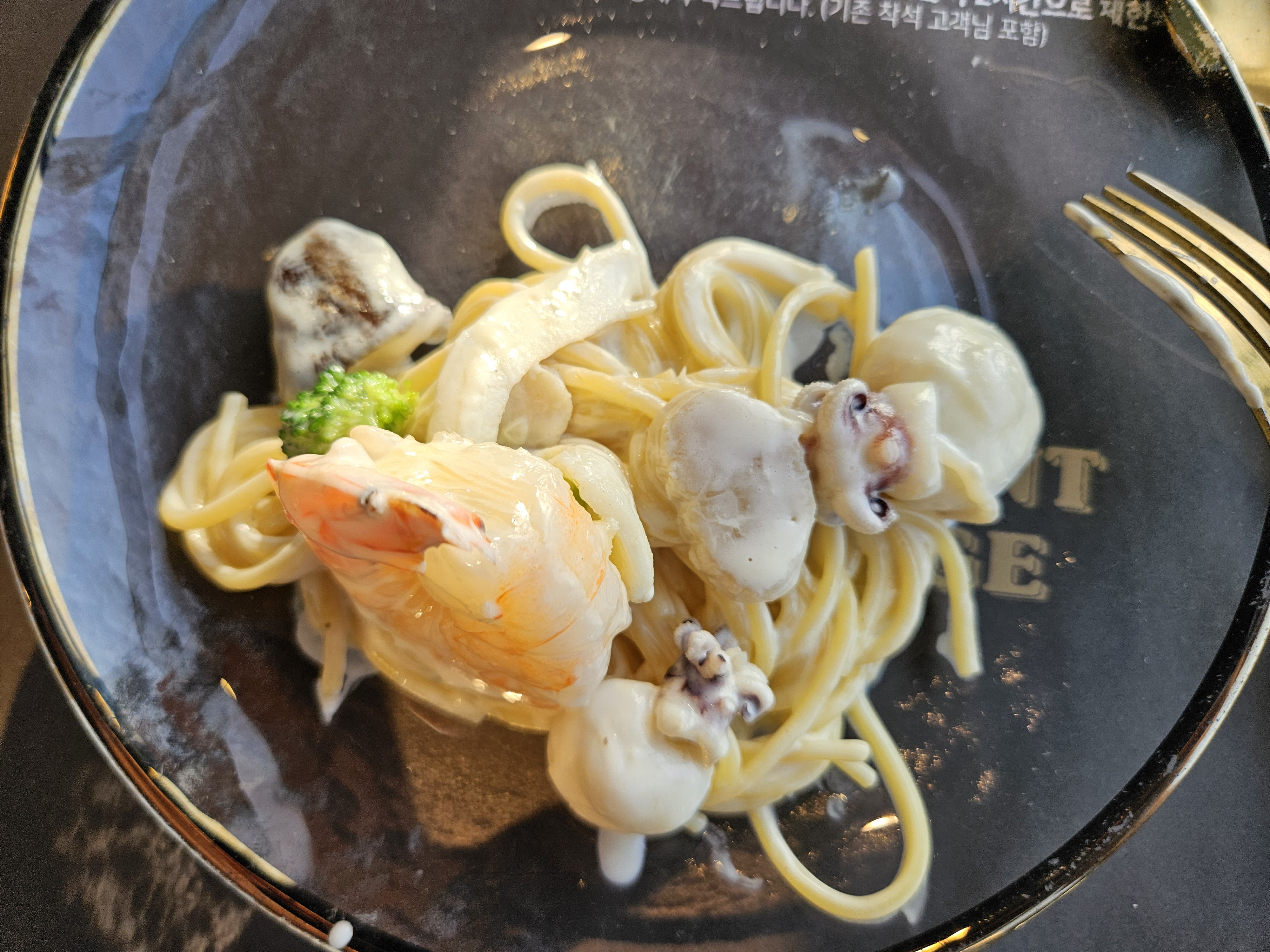 우선 우리 어머님이 먹고 싶다고 했던 해산물 크림 파스타 일단 비주얼은 합격 맛은 크림소스가 들어가서 느끼할 수도 있지만 전혀 그렇지 않고 깔끔하더라고요. 해물이랑 같이 먹으면 식감 또한 더해져 맛있었습니다.