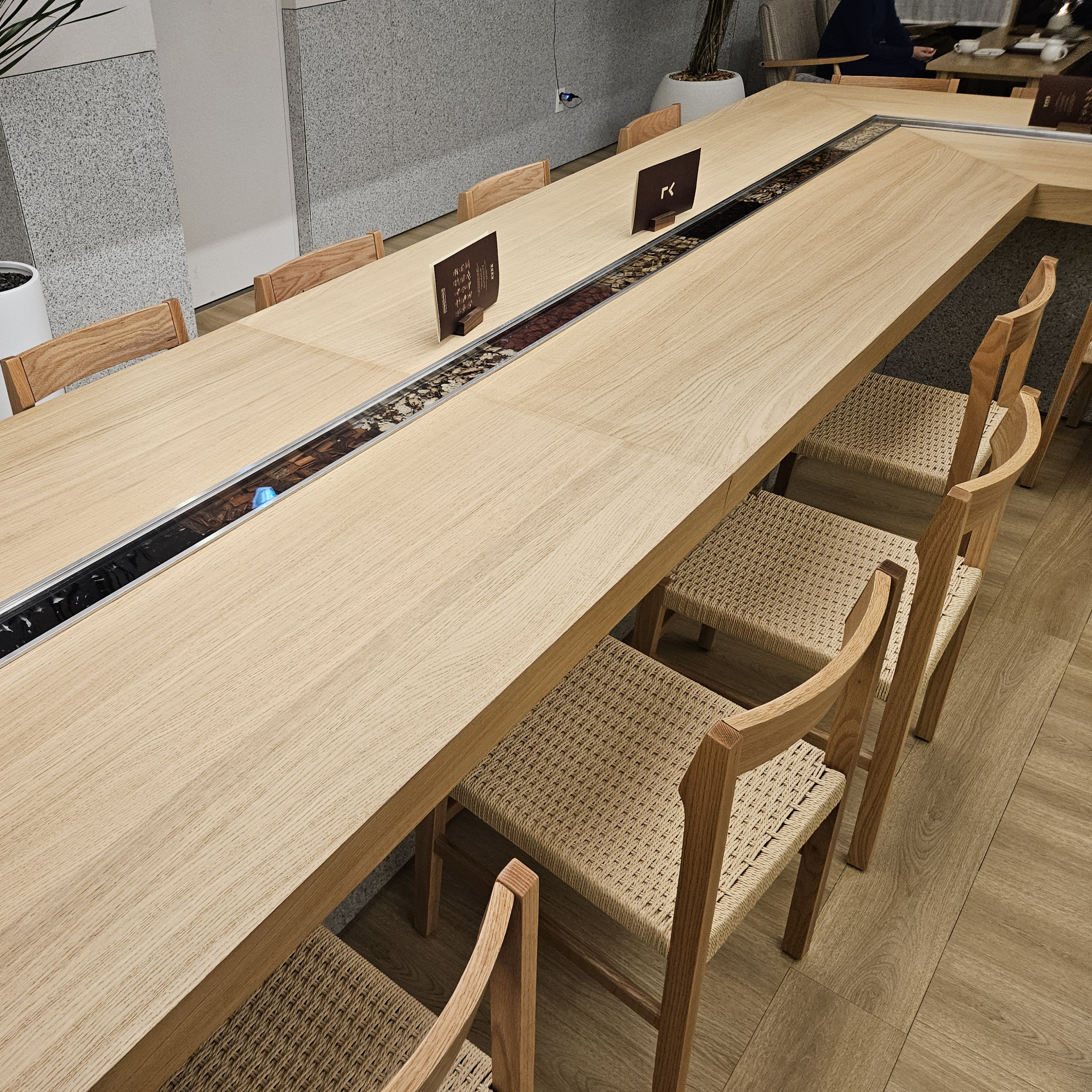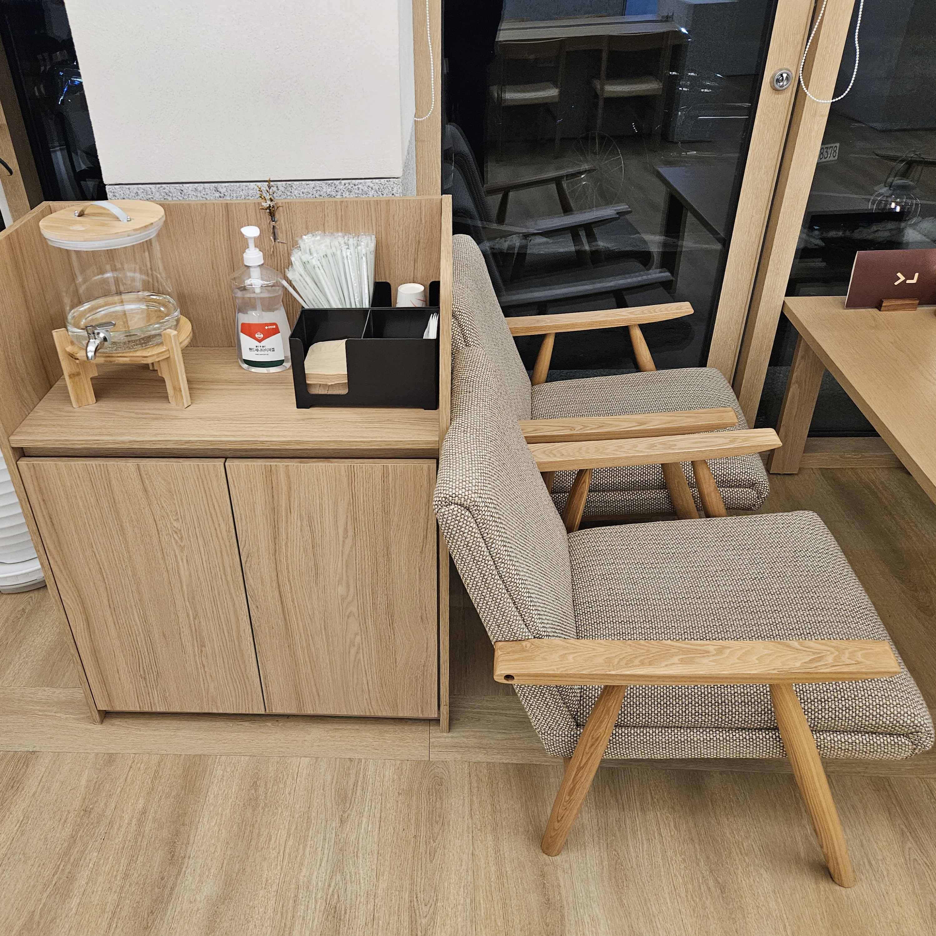 안에 들어가 보니 인테리어가 우드로 되어 있어 깔끔하고 이쁘더라고요. 테이블에 흐르는 물까지 뭔가 마음이 편안해지고 온화한 느낌이 들었습니다.