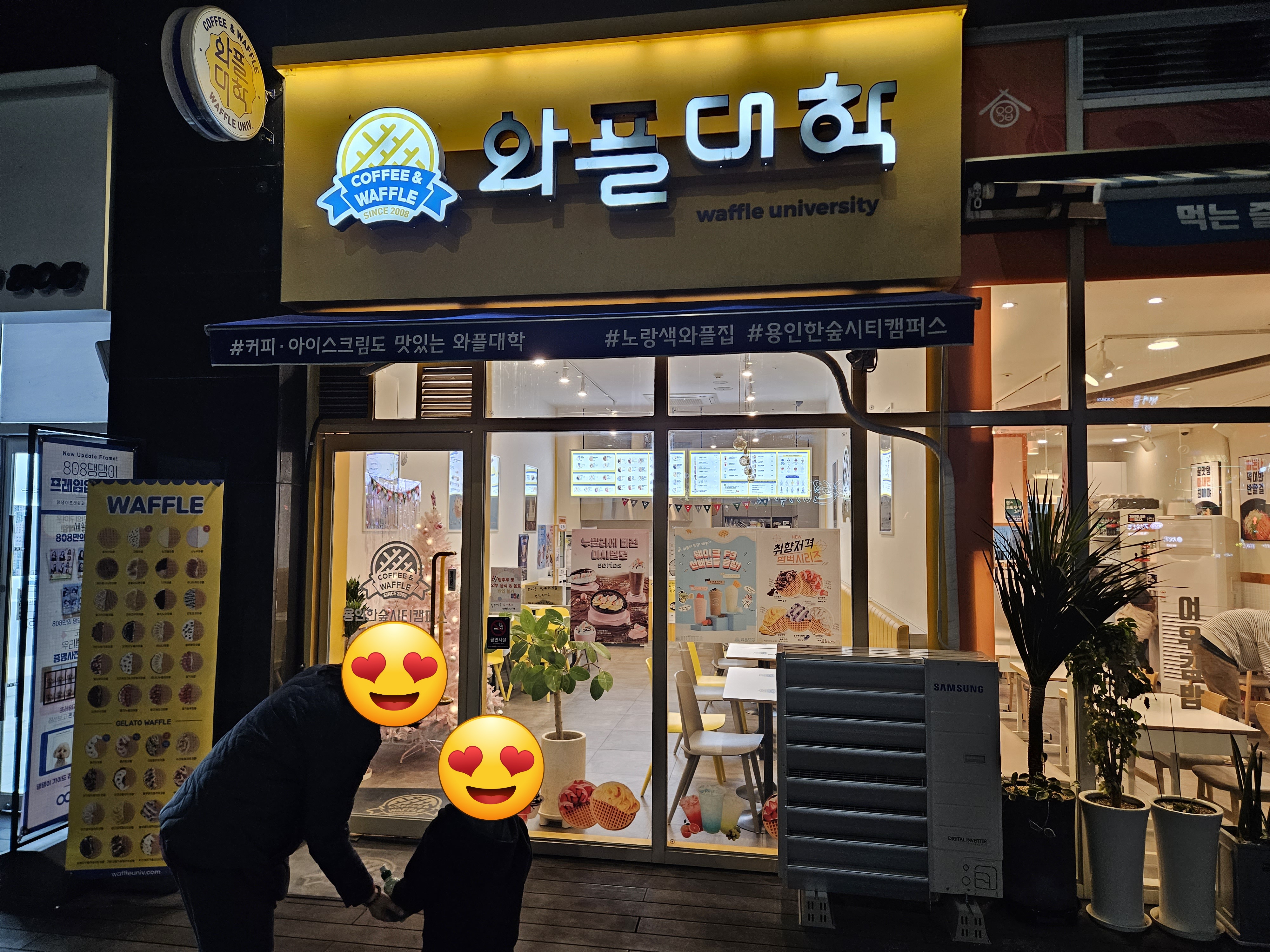오랜만에 가족들이랑 외식을 하고 난 뒤 빨리 집에 들어가려고 했지만 만 3세 아들은 후식을 꼭 먹어야겠다고 하고 와이프도 덩달아 커피 마시고 싶다고 해서 용인 한숲시티에 있는 와플대학에 방문을 했습니다.