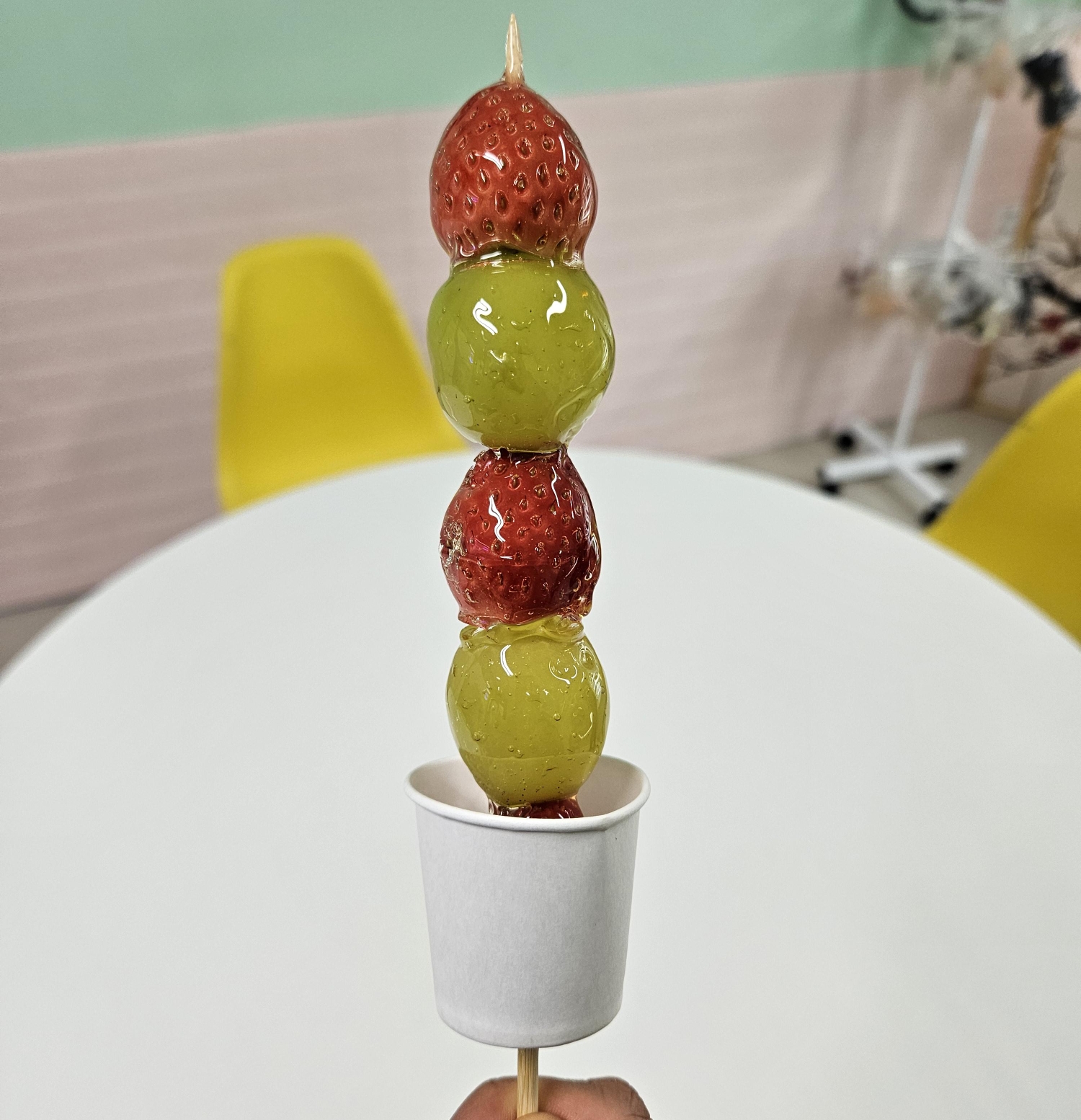 방문 당시 탕후루들이 많이 판매된 상태였지만 만 3세 아들은 샤인머스캣, 저는 딸기+샤인머스켓, 와이프는 딸기 탕후루를 골랐답니다. 아들은 자기 탕후루를 받자마자 좋아하면서 먹는데 어찌나 귀엽던지 생각보다 잘 먹더라고요.