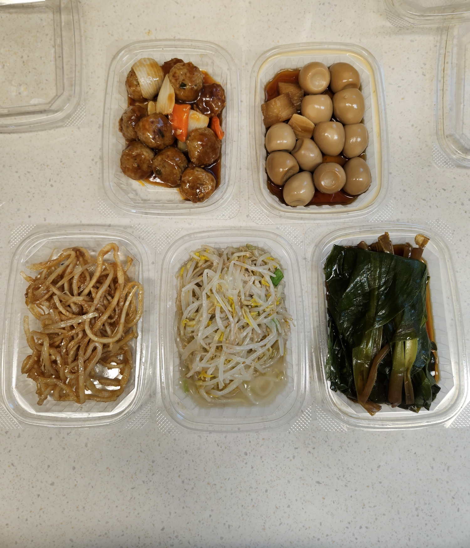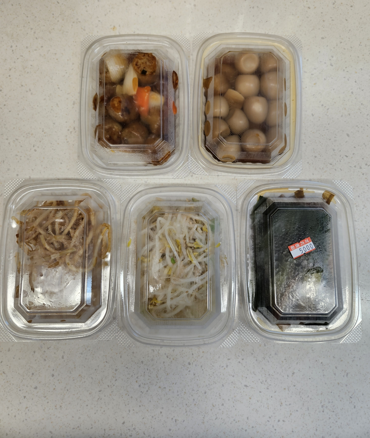그리고 미트볼, 간장진미채, 숙주나물, 명이나물 짱아치를 구매했습니다. 현금 계산하고 서비스반찬으로 메추리알 장조림까지 받아왔습니다.